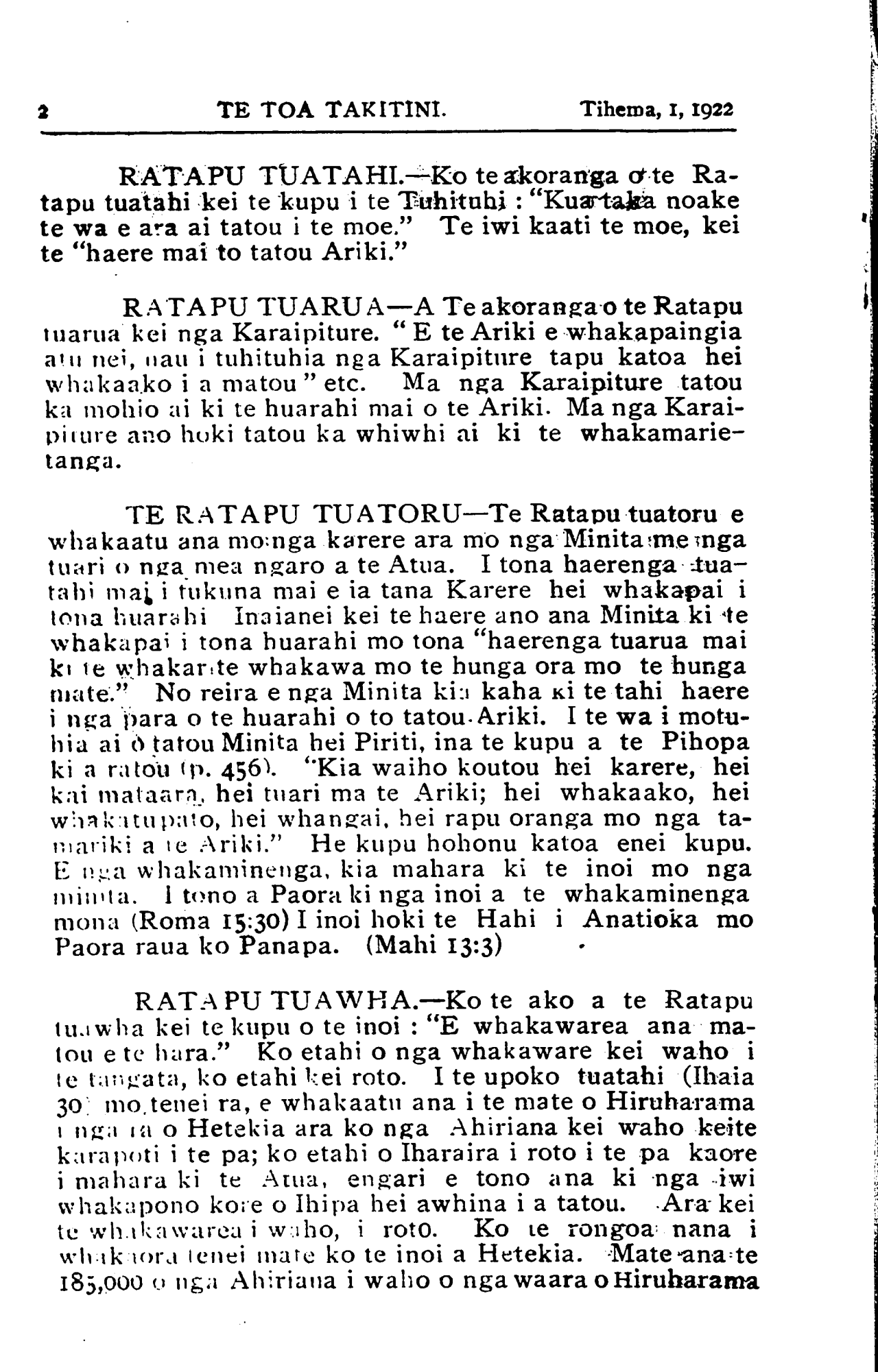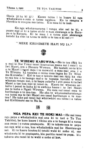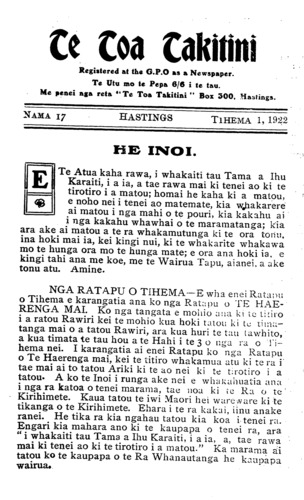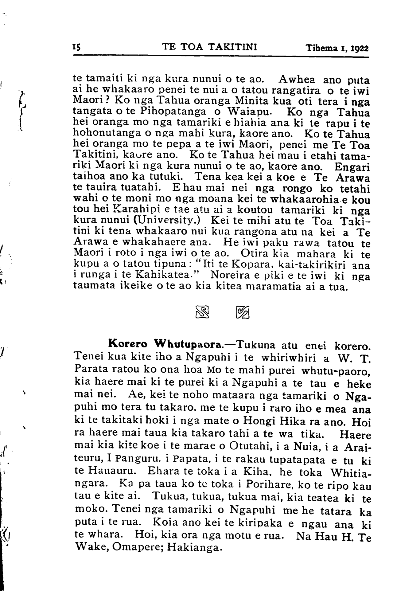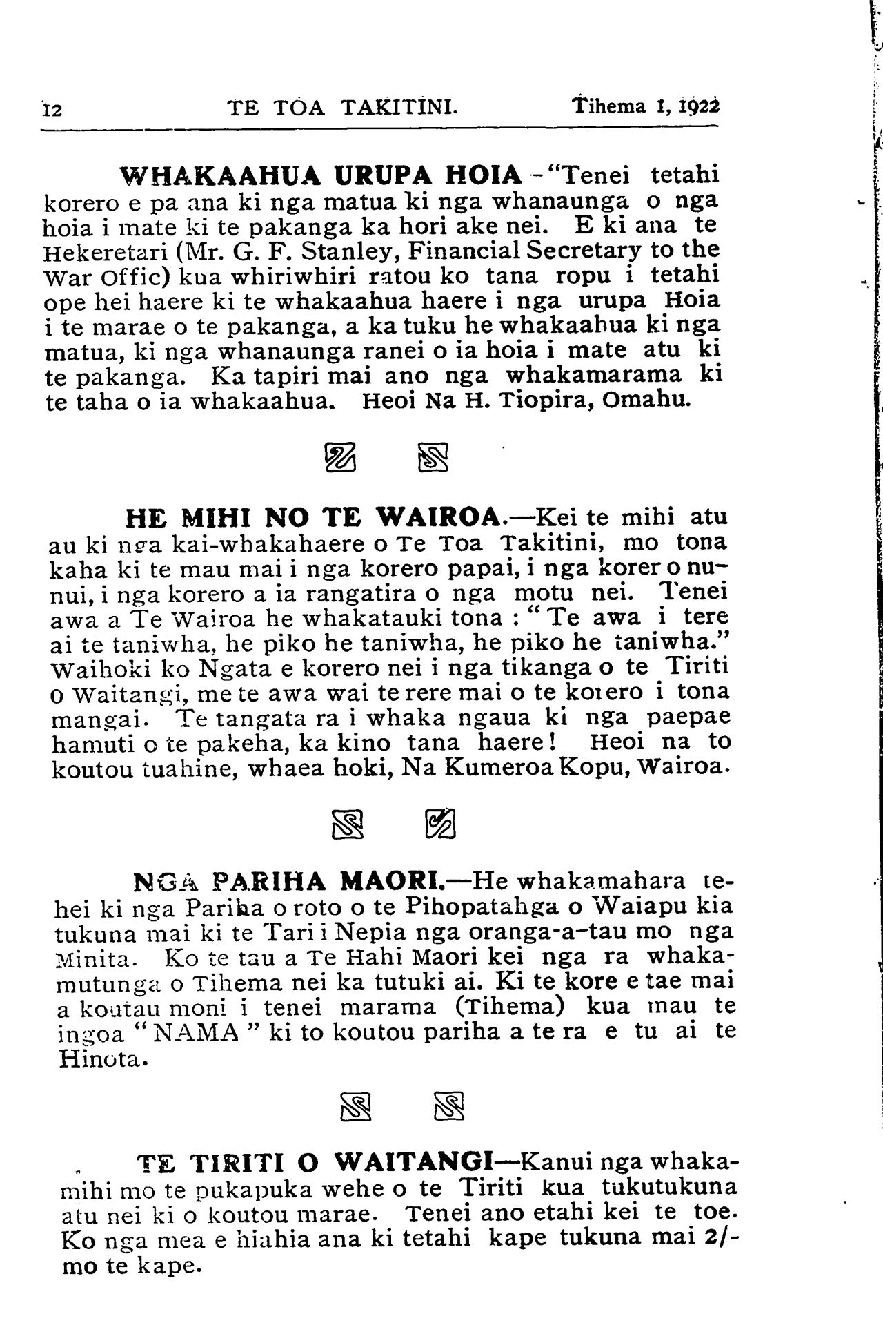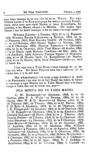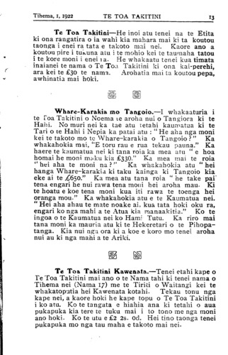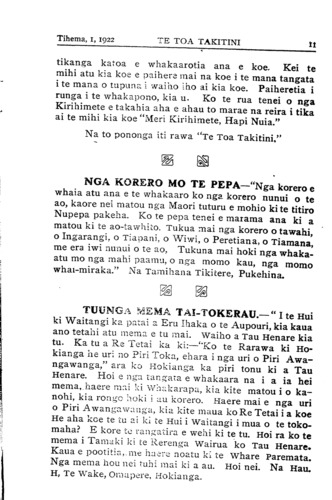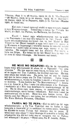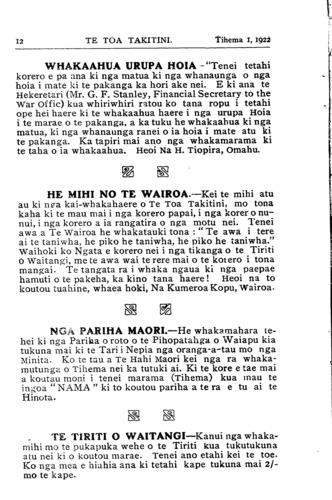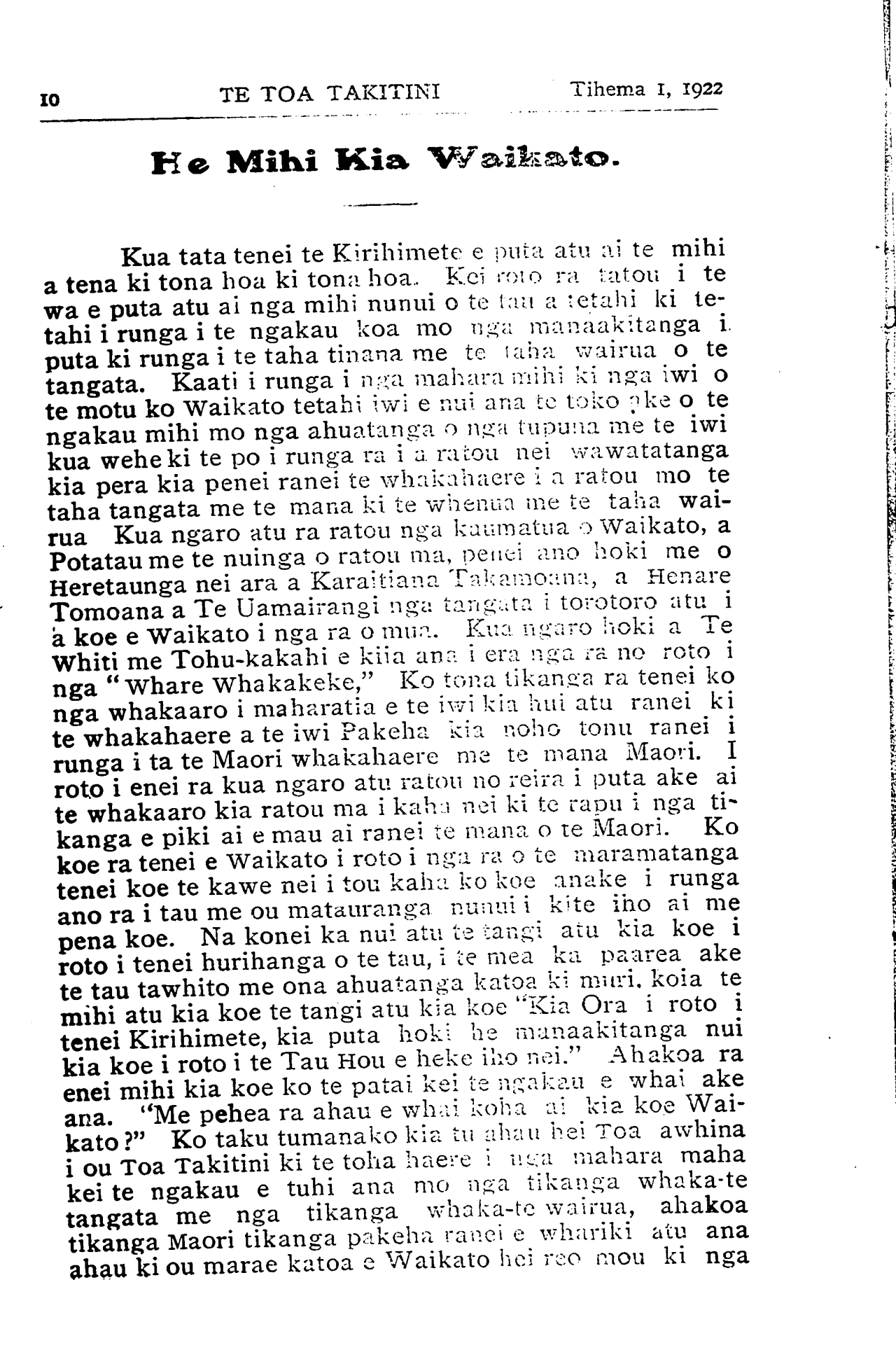 IOTE TOA TAKITINI Tihema 1, 1922 He Mihi Kia, Kua tata tenei te Kirihimete e puta atu ai te mihi a tena ki tona hoa ki tona hoa. Kei roto ra tatou i te wa e puta atu ai nga mihi nunui o te tau a tetahi ki te- tahi i runga i te ngakau koa mo nga manaakitanga i. puta ki runga i te taha tinana me te tana wairua o te tangata. Kaati i runga i nga mahara mihi ki nga iwi o te motu ko Waikato tetahi iwi e nui ana te toko ake o te ngakau mihi mo nga ahuatanga o nga tupuna me te iwi kua wehe ki te po i runga ra i a. ratou nei wawatatanga kia pera kia penei ranei te whakahaere I a ratou mo te taha tangata me te mana ki te whenua me te taha wai- rua Kua ngaro atu ra ratou nga kaumatua o Waikato, a Potatau me te nuinga o ratou ma, penei ano hoki me o Heretaunga nei ara a Karaitiana Takamoana, a. Henare Tomoana a Te Uamairangi nga tangata i torotoro atu i a koe e Waikato i nga ra o mua. Kua ngaro hoki a Te Whiti me Tohu-kakahi e kiia ana i era nga ra no roto i nga "Whare Whakakeke," Ko tona tikanga ra tenei ko nga whakaaro i maharatia e te iwi kia hui atu ranei ki te whakahaere a te iwi Pakeha kia noho tonu ranei i runga i ta te Maori whakahaere me te mana Maori. I roto i enei ra kua ngaro atu ratou no reira i puta ake ai te whakaaro kia ratou ma i kaha nei ki te rapu i nga ti- kanga e piki ai e mau ai ranei te mana o te Maori. Ko koe ra tenei e Waikato i roto i nga ra o te maramatanga tenei koe te kawe nei i tou kaha ko koe anake i runga ano ra i tau me ou matauranga nunui i kite iho ai me pena koe. Na konei ka nui atu te tangi atu kia koe i roto i tenei hurihanga o te tau, i te mea ka paarea ake te tau tawhito me ona ahuatanga katoa ki muri, koia te mihi atu kia koe te tangi atu kia koe "Kia Ora i roto i tenei Kirihimete, kia puta hoki he manaakitanga nui kia koe i roto i te Tau Hou e heke iho nei." Ahakoa ra enei mihi kia koe ko te patai, kei te ngakau e whai ake ana. "Me pehea ra ahau e whai koha ai kia koe Wai- kato?" Ko taku tumanako kia tu ahau hei Toa awhina i ou Toa Takitini ki te toha haere i nga mahara maha kei te ngakau e tuhi ana mo nga tikanga whaka-te tangata me nga tikanga whaka-te wairua, ahakoa tikanga Maori tikanga pakeha ranei e whariki atu ana ahau ki ou marae katoa e Waikato hei reo mou ki nga