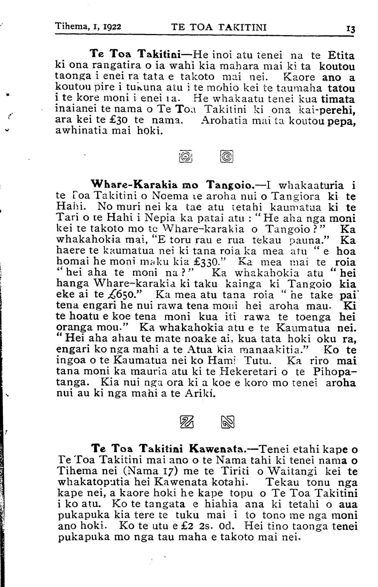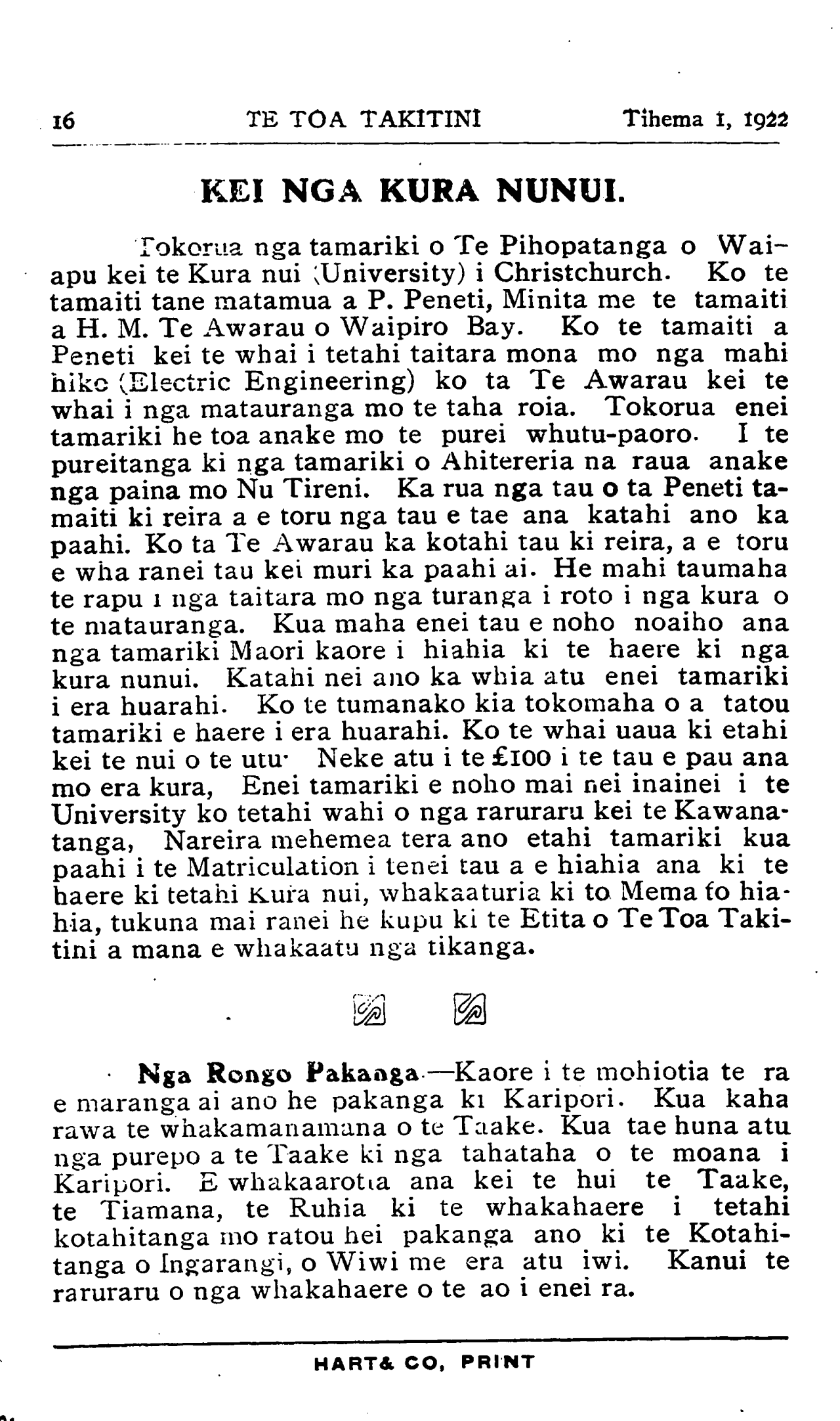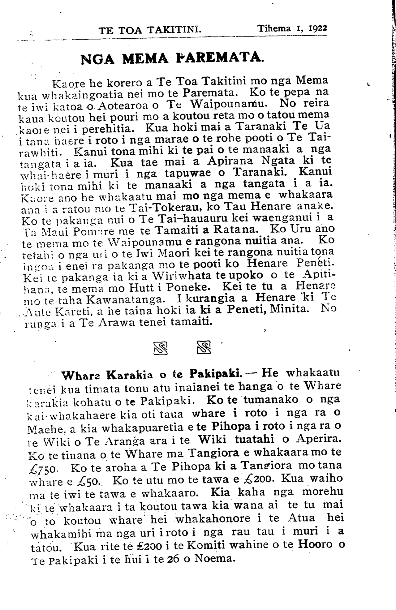TE TOA TAKITINI.Tihema 1, 1922 NGA MEMA PAREMATA. Kaore he korero a Te Toa Takitini mo nga Mema kua whakaingoatia nei mo te Paremata. Ko te pepa na te iwi katoa o Aotearoa o Te Waipounamu. No reira kaua koutou hei pouri mo a koutou reta mo o tatou mema kaore nei i perehitia. Kua hokimai a Taranaki Te Ua i tana haere i roto i nga marae o te rohe pooti o Te Tai- rawhiti. Kanui tona mihi ki te pai o te manaaki a nga tangata i a ia. Kua tae mai a Apirana Ngata ki te whai-haere i muri i nga tapuwae o Taranaki. Kanui hoki tona mihi ki te manaaki a nga tangata i a ia. Kaore ano he whakaatu mai mo nga mema e whakaara ana i a ratou mo te Tai-Tokerau, ko Tau Henare anake. Ko te pakanga nui o Te Tai-hauauru kei waenganui i a Ta Maui Pomare me te Tamaiti a Ratana. Ko Uru aho te mema.mo te Waipounamu e rangona nuitia ana. Ko tetahi o nga uri o te Iwi Maori kei te rangona nuitia tona ingoa i enei ra pakanga mo te pooti ko Henare Peneti. Kei te pakanga ia ki a Wiri whata te upoko o te Apiti- hana, te mema mo Hutt i Poneke. Kei te tu a Henare mo te taha Kawanatanga. I kurangia a Henare "ki Te Aute Kareti, a he taina hoki ia ki a Peneti, Minita. No runga.i a Te Arawa tenei tamaiti. Whare Karakia o te Pakipaki.— He whakaatu tenei kua timata tonu atu inaianei te hanga o te Whare karakia kohatu o te Pakipaki. Ko te tumanako o nga kai-whakahaere kia oti taua whare i roto i nga ra o Maehe, a kia whakapuaretia e te Pihopa i roto i nga ra o te Wiki o Te Aranga ara i te Wiki tuatahi o Aperira. Ko te tinana o te Whare ma Tangiora e whakaara mo te 750. Ko te aroha a Te Pihopa ki a mo tana whare e £50. Ko te utu mo te tawa e £200. Kua waiho ma te iwi te tawa e whakaaro. Kia kaha nga morehu ki te whakaara i ta koutou tawa kia wana ai te tu mai b to koutou whare hei whakahonore i te Atua hei whakamihi ma nga uri i roto i nga rau tau i muri i a tatou. Kua rite te £200 i te Komiti wahine o te Hooro o Te Pakipaki i te hui i te 26 o Noema.