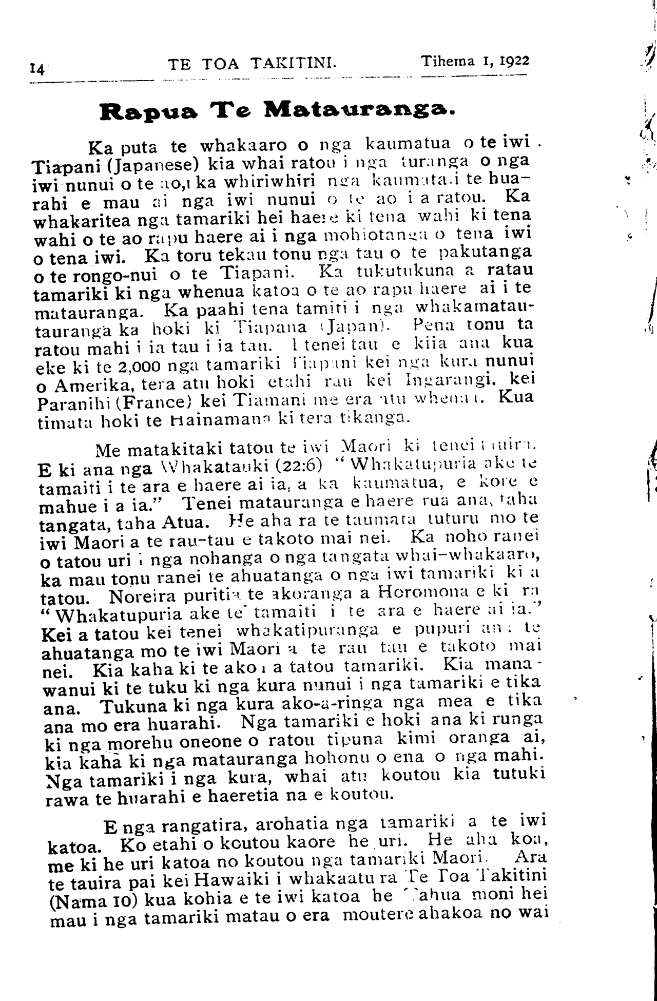 14TE TOA TAKITINI. Tihema 1, 1922 Rapua Te Matauranga. Ka puta te whakaaro o nga kaumatua o te iwi . Tiapani (Japanese) kia whai ratou i nga turanga o nga iwi nunui o te ao, ka whiriwhiri nga kaumata i te hua- rahi e mau ai nga iwi nunui o te ao i a ratou. Ka whakaritea nga tamariki hei haere ki tena wahi ki tena wahi o te ao rapu haere ai i nga mohiotanga o tena iwi o tena iwi. Ka toru tekau tonu nga tau o te pakutanga o te rongo-nui o te Tiapani. Ka tukutukuna a ratau tamariki ki nga whenua katoa o te ao rapu haere ai i te matauranga. Ka paahi tena tamiti i nga whakamatau- tauranga ka hoki ki Tiapana (Japan). Pena tonu ta ratou mahi i ia tau i ia tau. 1 tenei tau e kiia ana kua eke ki te 2,000 nga tamariki Tiapani kei nga kura nunui o Amerika, tera atu hoki etahi rau kei Ingarangi, kei Paranihi (France) kei Tiamani me era atu whenua. Kua timata hoki te Hainamana ki tera tikanga. Me matakitaki tatou te iwi Maori ki tenei i miri. E ki ana nga Whakatauki (22:6) " Whakatupuria ake te tamaiti i te ara e haere ai ia, a ka kaumatua, e kore e mahue i a ia." Tenei matauranga e haere rua ana, taha tangata, taha Atua. He aha ra te taumata tuturu mo te iwi Maori a te rau-tau e takoto mai nei. Ka noho ranei o tatou uri i nga nohanga o nga tangata whai-whakaaro, ka mau tonu ranei te ahuatanga o nga iwi tamariki ki a tatou. Noreira puritia te akoranga a Horomona e ki ra "Whakatupuria ake te" tamaiti i te ara e haere ai ia." Kei a tatou kei tenei whakatipuranga e pupuri ana te ahuatanga mo te iwi Maori u te rau tau e takoto mai nei. Kia kaha ki te ako i a tatou tamariki. Kia mana- wanui ki te tuku ki nga kura nunui i nga tamariki e tika ana. Tukuna ki nga kura ako-a-ringa nga mea e tika ana mo era huarahi. Nga tamariki e hoki ana ki runga ki nga morehu oneone o ratou tipuna kimi oranga ai, kia kaha ki nga matauranga hohonu o ena o nga mahi. Nga tamariki i nga kura, whai atu koutou kia tutuki rawa te huarahi e haeretia na e koutou. E nga rangatira, arohatia nga tamariki a te iwi katoa. Ko etahi o koutou kaore he uri. He aha koa, rae ki he uri katoa no koutou nga tamariki Maori. Ara te tauira pai kei Hawaiki i whakaatu ra Te Toa Takitini (Nama 10) kua kohia e te iwi katoa he ahua moni hei mau i nga tamariki matau o era moutere ahakoa no wai