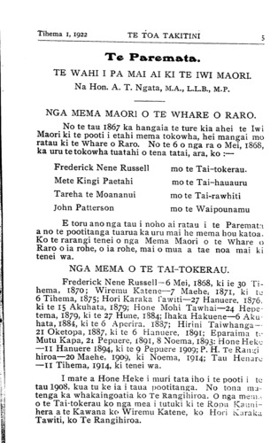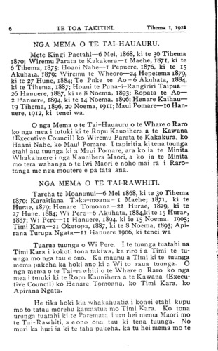 TE TOA TAKITINI.Tihema 1, 1922 NGA MEMA O TE TAI-HAUAURU. Mete Kingi Paetahi—6 Mei, 1868, ki te 30 Tihema 1870; Wiremu Parata te Kakakura—I Maehe, 1871, ki te 6 Tihema, 1875: Hoani Nahe—I Pepuere, 1876, ki te 15 Akuhata., 1879; Wiremu te Wheoro—24 Hepetema 1879, ki te 27 Hune, 1884; Te Puke te Ao-6 Akuhata, 1884, ki te Tihema, 1887; Hoani te Puna-i-Rangiriri Taipua— 26 Hanuere, 1887, ki te 8 Noema, 1893; Ropata te Ao— 2 Hanuere, 1894, ki te 14 Noema, 1896; Henare Kaihau— 19 Tihema, 1896, 20 Noema, 1911; Maui Pomare—10 Han- uere, 1912, ki tenei wa. O nga Mema o te Tai-Hauauru o te Whare o Raro ko nga mea i tutuki ki te Ropu Kaunihera a te Kawana (Executive Council) ko Wiremu Parata te Kakakura, ko Haani Nahe, ko Maui Pomare. I tapiritia ki tena tuunga etahi atu tuunga ki a Maui Pomare, ara ko ia te Minita Whakahaere i nga Kaunihera Maori, a ko ia te Minita mo tera wahanga o te Iwi Maori e noho mai ra i Raro- tonga me nga moutere e pa tata ana. NGA MEMA O TE TAI-RAWH1TI. Tareha te Moananui—6 Mei 1868, ki te 30 Tihema 1870: Karaitiana Taku-moana- I Maehe; 1871, ki te Hurae, 1879; Henare Tomoana—22 Hurae, 1879, ki te 27 Hune. 1884; Wi Pere—6 Akuhata, l884,ki te 15 Hurae, 1887; Wi Pere—11 Hanuere, 1894. ki te 15 Noema, 1905; Timi Kara—21 Oketopa, 1887, ki te 8 Noema, 1893; Api- rana Turupa Ngata—11 Hanuere 1906, ki tenei wa Tuarua tuunga o Wi Pere. I te tuunga tuatahi na Timi Kara i kokoti tona takiwa, ka riro i a Timi te tu- unga mo nga tau e ono. Ka maunu a Timi ki te tuunga mema pakeha ka hoki ano ki a Wi to raua tuunga. O nga mema o te Tai-rawhiti o te Whare o Raro ko nga mea i tutuki ki te Ropu Kaunihera a te Kawana (Execu- tive Council) ko Henare Tomoana, ko Timi Kara, ko Apirana Ngata. He tika hoki kia whakahuatia i konei etahi kupu mo to tatau morehu kaumatua mo Timi Kara. Ko tona urunga tuatahi ki te Paremata i uru hei mema Maori mo te Tai-Rawhiti, a e ono ona tau ki tena tuunga. No muri ka huri ia ki te taha pakeha, ka tu hei mema mo te