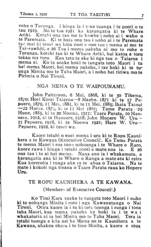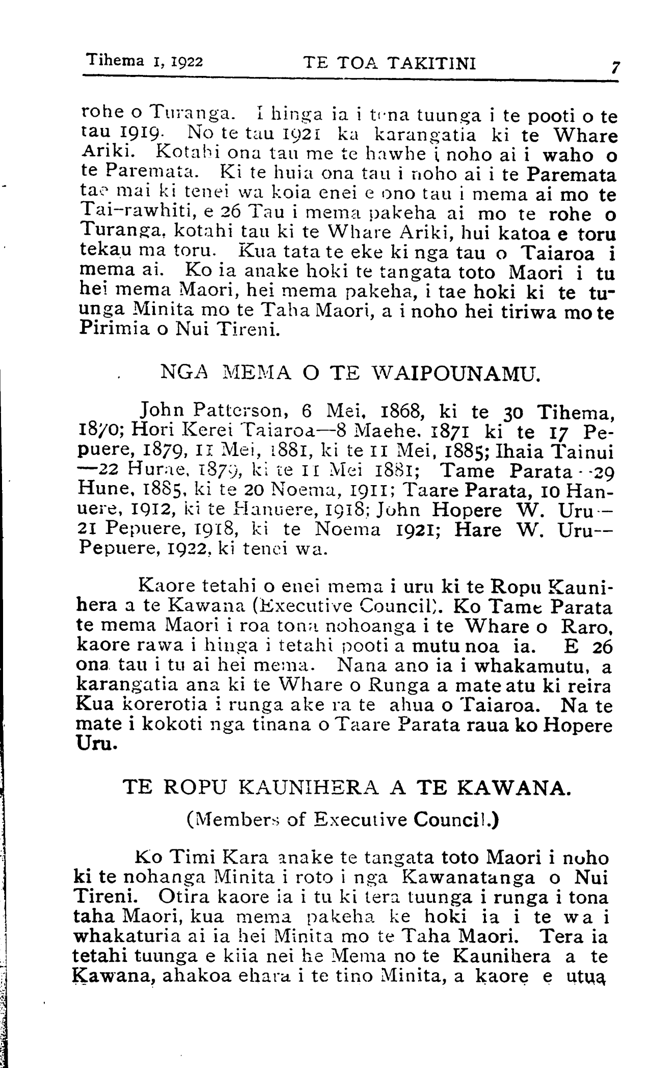 Tihema 1, 1922TE TOA TAKITINI 7 rohe o Turanga. I hinga ia i tena tuunga i te pooti o te tau 1919. No te tau 1921 ka karangatia ki te Whare Ariki. Kotahi ona tau me te hawhe i noho ai i waho o te Paremata. Ki te huia ona tau i noho ai i te Paremata tae mai ki tenei wa koia enei e ono tau i mema ai mo te Tai-rawhiti, e 26 Tau i mema pakeha ai mo te rohe o Turanga, kotahi tau ki te Whare Ariki, hui katoa e toru tekau ma toru. Kua tata te eke ki nga tau o Taiaroa i mema ai. Ko ia anake hoki te tangata toto Maori i tu hei mema Maori, hei mema pakeha, i tae hoki ki te tu" unga Minita mo te Taha Maori, a i noho hei tiriwa mo te Pirimia o Nui Tireni. NGA MEMA O TE WAIPOUNAMU. John Patterson, 6 Mei, 1868, ki te 30 Tihema, I870; Hori Kerei Taiaroa—8 Maehe, 1871 ki te 17 Pe- puere, 1879, II Mei, 1881, ki te II Mei, 1885; Ihaia Tainui —22 Hurae, 1879, ki te II Mei l88l; Tame Parata --29 Hune, 1885, ki te 20 Noema, 1911; Taare Parata, IO Han- uere, I9I2, ki te Hanuere, 1918; John Hopere W. Uru — 21 Pepuere, 1918, ki te Noema 1921; Hare W. Uru— Pepuere, I922. ki tenei wa. Kaore tetahi o enei mema i uru ki te Ropu Kauni- hera a te Kawana (Executive Council). Ko Tame Parata te mema Maori i roa tona nohoanga i te Whare o Raro, kaore rawa i hinga i tetahi pooti a mutu noa ia. E 26 ona tau i tu ai hei mema. Nana ano ia i whakamutu, a karangatia ana ki te Whare o Runga a mate atu ki reira Kua korerotia i runga ake ra te ahua o Taiaroa. Na te mate i kokoti nga tinana o Taare Parata raua ko Hopere Uru. TE ROPU KAUNIHERA A TE KAWANA. (Members of Executive Council.) Ko Timi Kara anake te tangata toto Maori i noho ki te nohanga Minita i roto i nga Kawanatanga o Nui Tireni. Otira kaore ia i tu ki tera tuunga i runga i tona taha Maori, kua mema pakeha ke hoki ia i te wa i whakaturia ai ia hei Minita mo te Taha Maori. Tera ia tetahi tuunga e kiia net he Mema no te Kaunihera a te Kawana, ahakoa ehara, i te tino Minita, a kaore e utua.