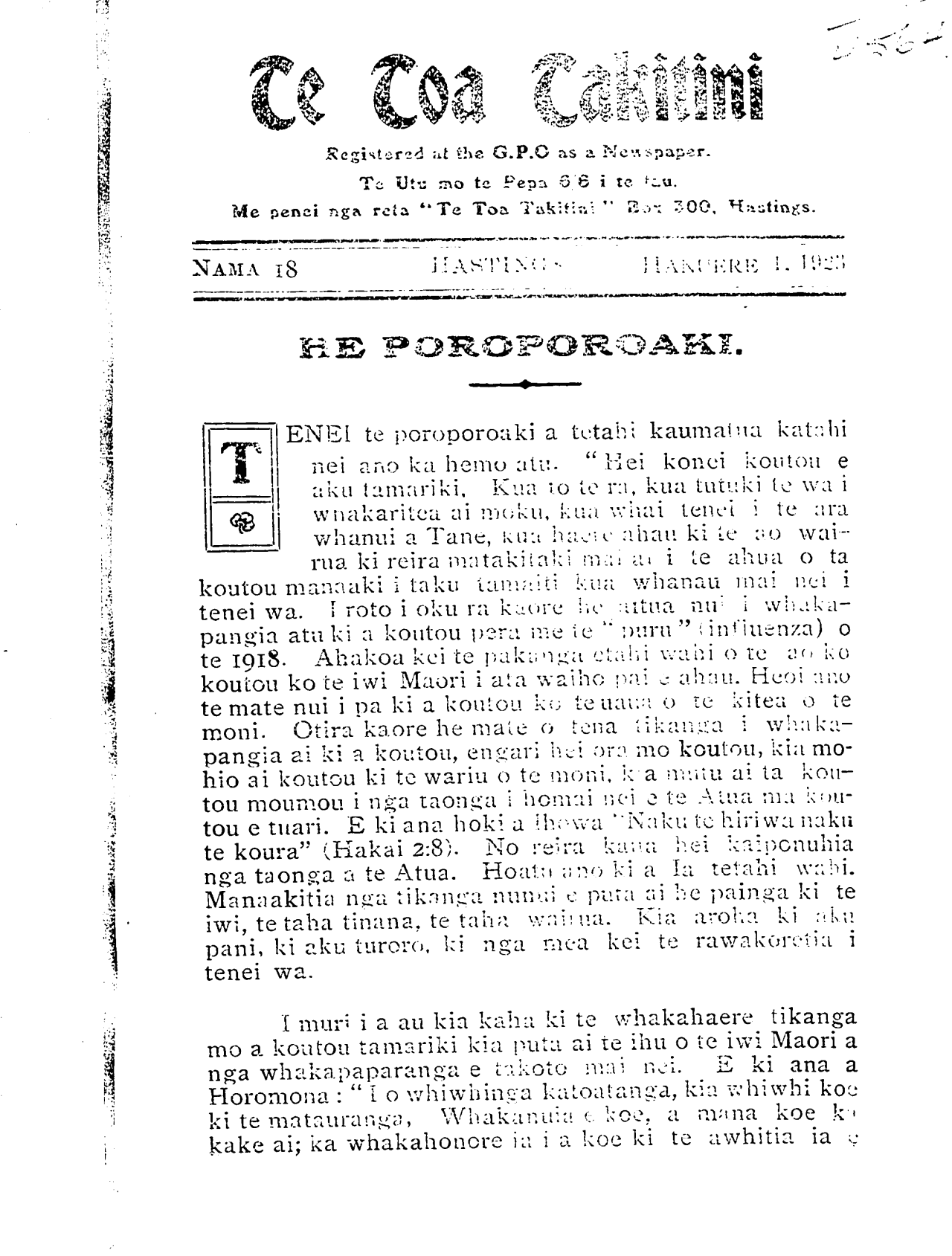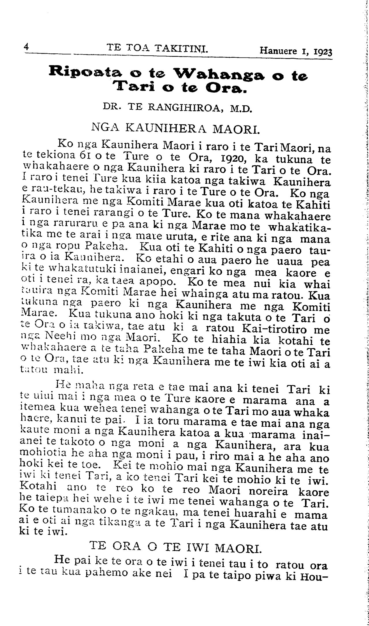 TE TOA TAKITINI.\_\_\_\_\_Hanuere 1, 1923 Ripoata o te Wahanga o te Tari o te Ora. DR. TE RANGIHIROA, M.D. NGA KAUNIHERA MAORI. Ko nga Kaunihera Maori i raro i te Tari Maori, na te tekiona 6l o te Ture o te Ora, 1920, ka tukuna te whakahaere o nga Kaunihera ki raro i te Tari o te Ora. I raro i tenei Ture kua kiia katoa nga takiwa Kaunihera e rau-tekau, he takiwa i raro i te Ture o te Ora. Ko nga Kaunihera me nga Komiti Marae kua oti katoa te Kahiti i raro i tenei rarangi o te Ture. Ko te mana whakahaere i nga raruraru e pa ana ki nga Marae mo te whakatika- tika me te arai i nga mate uruta, e rite ana ki nga mana o nga ropu Pakeha. Kua oti te Kahiti o nga paero tau- ira o ia Kaunihera. Ko etahi o aua paero he uaua pea ki te whakatutuki inaianei, engari ko nga mea kaore e oti i tenei ra, ka taea apopo. Ko te mea nui kia whai tauira nga Komiti Marae hei whainga atu ma ratou. Kua tukuna nga paero ki nga Kaunihera me nga Komiti Marae. Kua tukuna ano hoki ki nga takuta o te Tari 6 te Ora o ia takiwa, tae atu ki a ratou Kai-tirotiro me nga Neehi mo nga Maori. Ko te hiahia kia kotahi te whakahaere a te taha Pakeha me te taha Maori o te Tari o te Ora, tae atu ki nga Kaunihera me te iwi kia oti ai a tatou mahi. He maha nga reta e tae mai ana ki tenei Tari ki te uiui mai i nga mea o te Ture kaore e marama ana a itemea kua wehea tenei wahanga o te Tari mo aua whaka haere, kanui te pai. I ia toru marama e tae mai ana nga kaute moni a nga Kaunihera katoa a kua marama inai- anei te takoto o nga moni a nga Kaunihera, ara kua mohiotia he aha nga moni i pau, i riro mai a he aha ano hoki kei te toe. Kei te mohio mai nga Kaunihera me te iwi ki tenei Tari, a ko tenei Tari kei te mohio ki te iwi. Kotahi ano te reo ko te reo Maori noreira kaore he taiepa hei wehe i te iwi me tenei wahanga o te Tari. Ko te tumanako o te ngakau, ma tenei huarahi e mama ai e oti ai nga tikanga a te Tari i nga Kaunihera tae atu ki te iwi. TE ORA O TE IWI MAORI. He pai ke te ora o te iwi i tenei tau i to ratou ora i te tau kua pahemo ake nei I pa te taipo piwa ki Hou-
