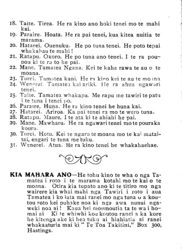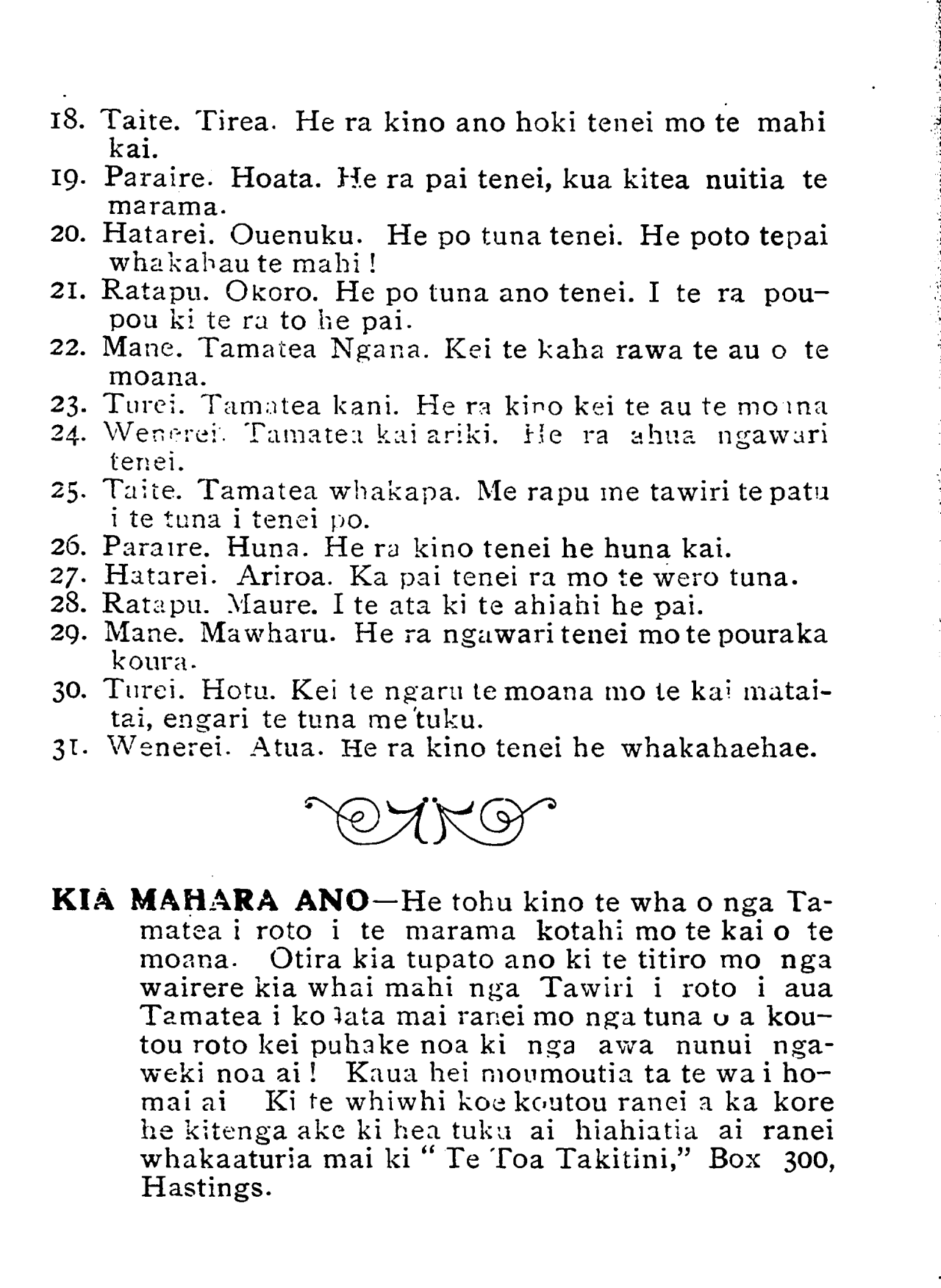 18. Taite. Tirea. He ra kino ano hoki tenei mo te mahi kai. 19. Paraire. Hoata. He ra pai tenei, kua kitea nuitia te marama. 20. Hatarei. Ouenuku. He po tuna tenei. He poto te pai whakahau te mahi ! 21. Ratapu. Okoro. He po tuna ano tenei. I te ra pou- pou ki te ra to he pai. 22. Mane. Tamatea Ngana. Kei te kaha rawa te au o te moana. 23. Turei. Tamatea kani. He ra kino kei te au te mo ma 24. Wenerei. Tamatea kai ariki. He ra ahua ngawari tenei. 25. Taite. Tamatea whakapa. Me rapu me tawiri te patu i te tuna i tenei po. 26. Paraire. Huna. He ra kino tenei he huna kai. 27. Hatarei. Ariroa. Ka pai tenei ra mo te wero tuna. 28. Ratapu. Maure. I te ata ki te ahiahi he pai. 29. Mane. Mawharu. He ra ngawari tenei mo te pouraka koura. 30. Turei. Hotu. Kei te ngaru te moana mo te kai matai- tai, engari te tuna me tuku. 31. Wenerei. Atua. He ra kino tenei he whakahaehae. KIA MAHARA ANO—He tohu kino te wha o nga Ta- matea i roto i te marama kotahi mo te kai o te moana. Otira kia tupato ano ki te titiro mo nga wairere kia whai mahi nga Tawiri i roto i aua Tamatea i ko 5ata mai ranei mo nga tuna u a kou- tou roto kei puhake noa ki nga awa nunui nga- weki noa ai! Kaua hei moumoutia ta te wa i ho- mai ai Ki te whiwhi koe koutou ranei a ka kore he kitenga ake ki hea tuku ai hiahiatia ai ranei whakaaturia mai ki " Te Toa Takitini," Box 300, Hastings.