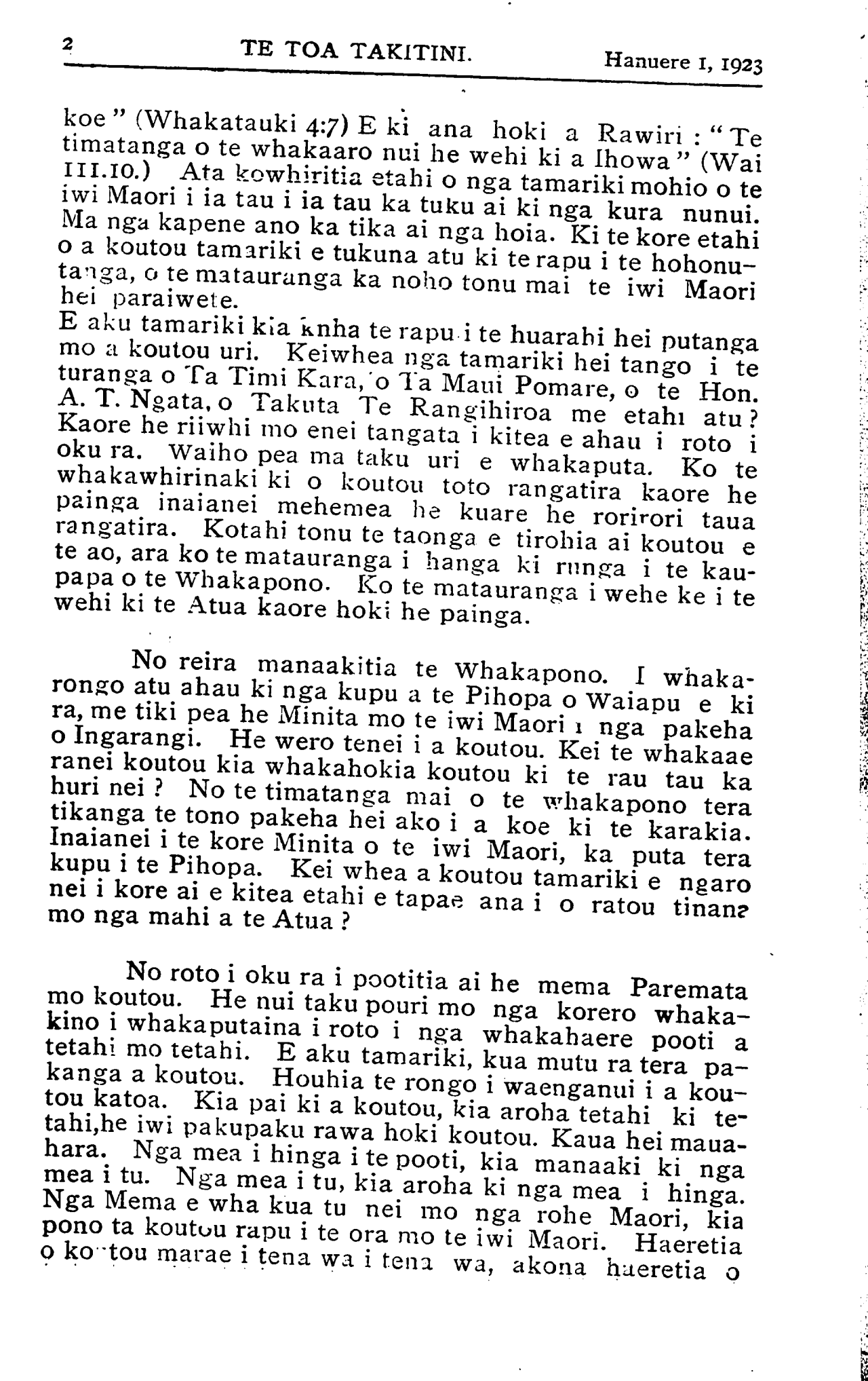 TE TOA TAKITINI.Hanuere 1, 1923 koe " (Whakatauki 4.7) E ki ana hoki a Rawiri : " Te timatanga o te whakaaro nui he wehi ki a Ihowa" (Wai III.IO.) Ata kowhiritia etahi o nga tamariki mohio o te iwi Maori i ia tau i ia tau ka tuku ai ki nga kura nunui. Ma nga kapene ano ka tika ai nga hoia. Ki te kore etahi o a koutou tamariki e tukuna atu ki te rapu i te hohonu- tanga, o te matauranga ka noho tonu mai te iwi Maori hei paraiwete. E aku tamariki kia kaha te rapu i te huarahi hei putanga mo a koutou uri. Keiwhea nga tamariki hei tango i te turanga o Ta Timi Kara, o Ta Maui Pomare, o te Hon. A. T. Ngata, o Takuta Te Rangihiroa me etahi atu? Kaore he riiwhi mo enei tangata i kitea e ahau i roto i oku ra. Waiho pea ma taku uri e whakaputa. Ko te whakawhirinaki ki o koutou toto rangatira kaore he painga inaianei mehemea he kuare he rorirori taua rangatira. Kotahi tonu te taonga e tirohia ai koutou e te ao, ara ko te matauranga i hanga ki runga i te kau- papa o te Whakapono. Ko te matauranga i wehe ke i te wehi ki te Atua kaore hoki he painga. No reira manaakitia te Whakapono. I whaka- rongo atu ahau ki nga kupu a te Pihopa o Waiapu e ki ra, me tiki pea he Minita mo te iwi Maori i nga pakeha o Ingarangi. He wero tenei i a koutou. Kei te whakaae ranei koutou kia whakahokia koutou ki te rau tau ka huri nei? No te timatanga mai o te whakapono tera tikanga te tono pakeha hei ako i a koe ki te karakia. Inaianei i te kore Minita o te iwi Maori, ka puta tera kupu i te Pihopa. Kei whea a koutou tamariki e ngaro nei i kore ai e kitea etahi e tapae ana i o ratou tinana mo nga mahi a te Atua ? No roto i oku ra i pootitia ai he mema Paremata mo koutou. He nui taku pouri mo nga korero whaka- kino i whakaputaina i roto i nga whakahaere pooti a tetahi mo tetahi. E aku tamariki, kua mutu ra tera pa- kanga a koutou. Houhia te rongo i waenganui i a kou- tou katoa. Kia pai ki a koutou, kia aroha tetahi ki te- tahi,he iwi pakupaku rawa hoki koutou. Kaua hei maua- hara. Nga mea i hinga i te pooti, kia manaaki ki nga mea i tu. Nga mea i tu, kia aroha ki nga mea i hinga. Nga Mema e wha kua tu nei mo nga rohe Maori, kia pono ta koutou rapu i te ora mo te iwi Maori. Haeretia o ko "tou marae i tena wa i tena, wa, akona haeretia o