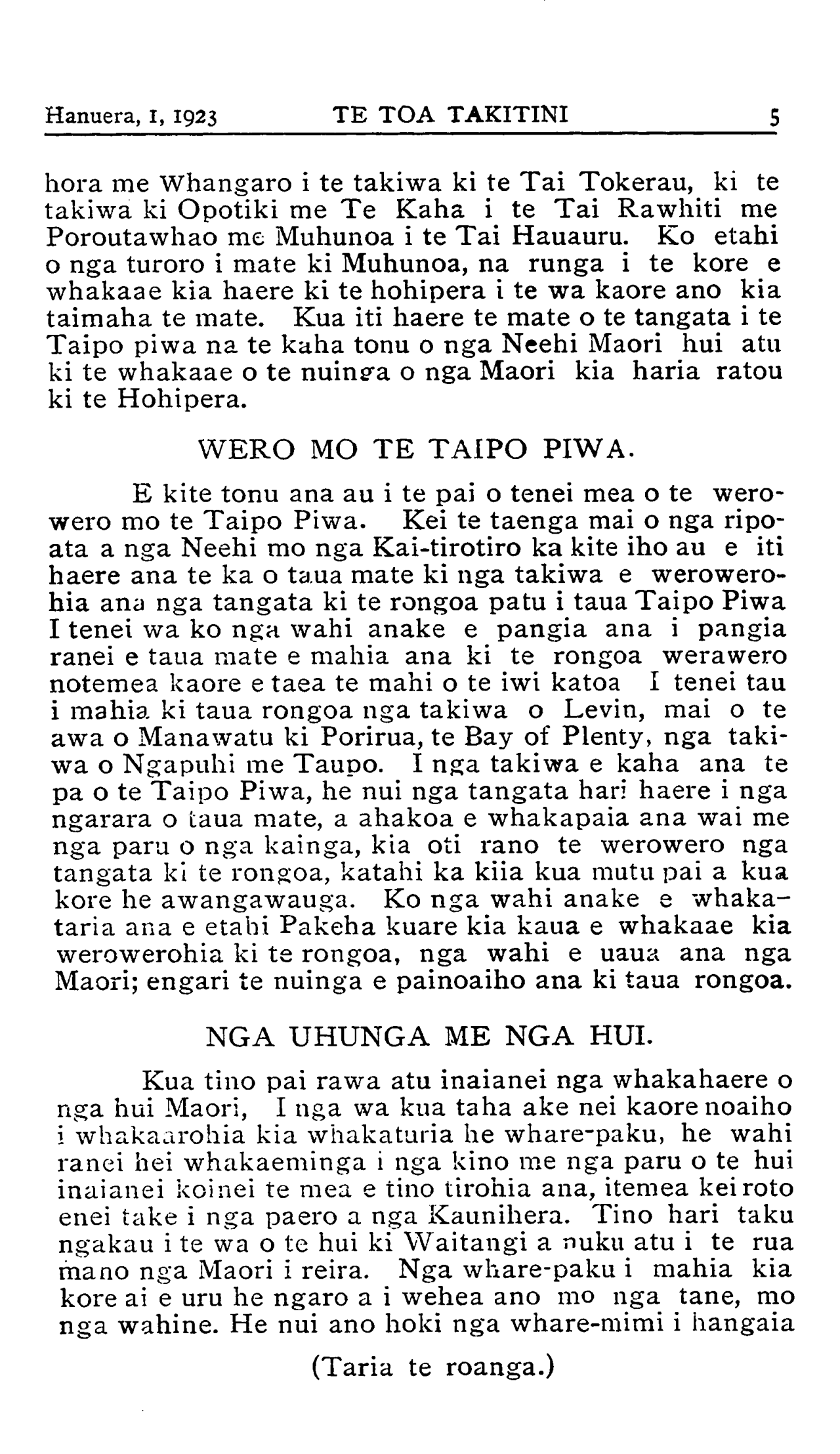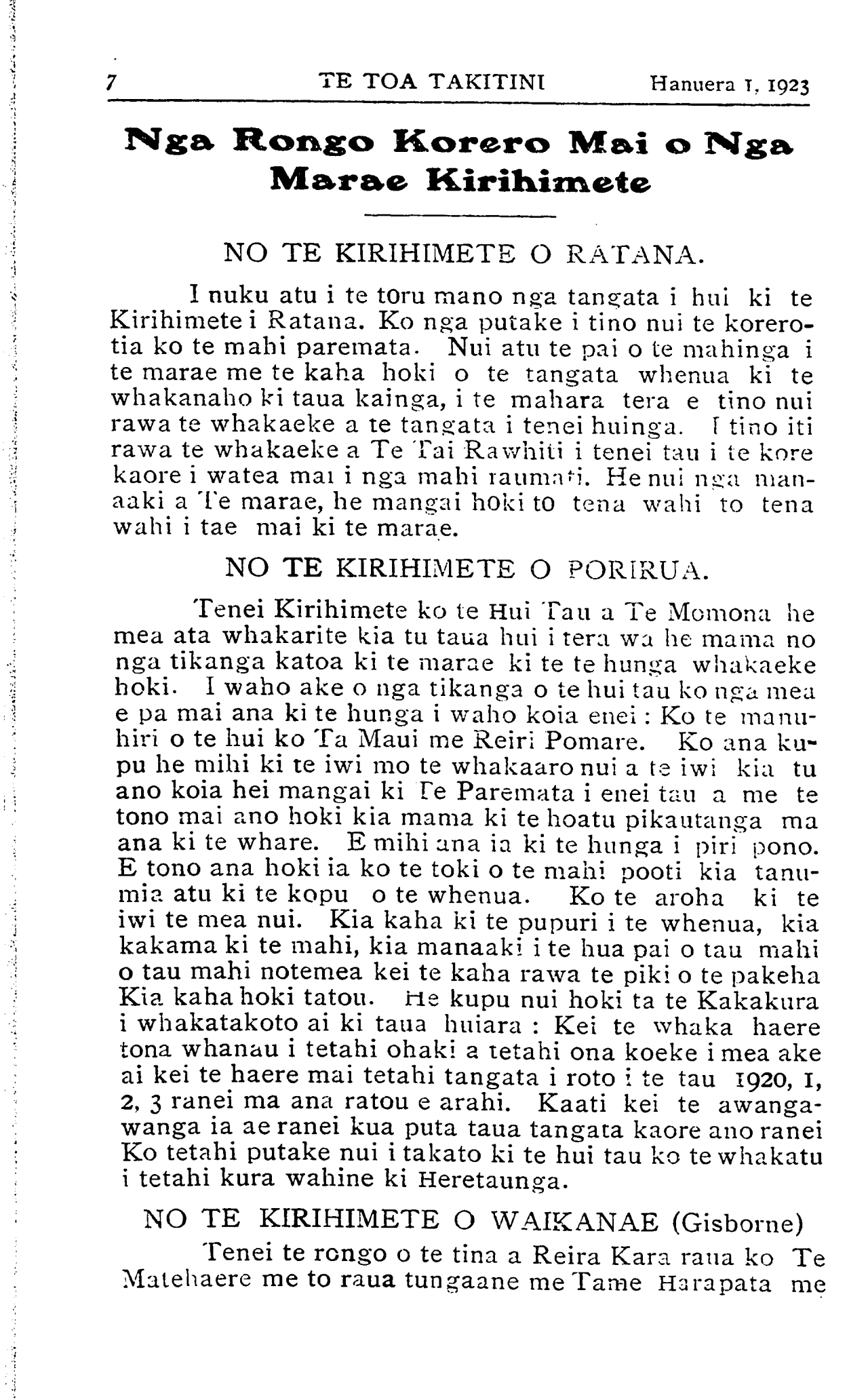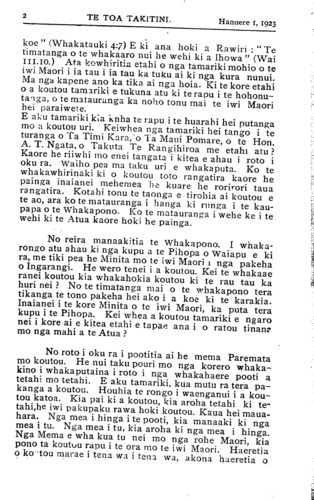 TE TOA TAKITINIHanuera 1, 1923 Nga Rongo Korero Mai o Nga Marae Kirihimete NO TE KIRIHIMETE O RATANA. I nuku atu i te toru mano nga tangata i hui ki te Kirihimete i Ratana. Ko nga putake i tino nui te korero- tia ko te mahi paremata. Nui atu te pai o te mahinga i te marae me te kaha hoki o te tangata whenua ki te whakanaho ki taua kainga, i te mahara tera e tino nui rawa te whakaeke a te tangata i tenei huinga. I tino iti rawa te whakaeke a Te Tai Rawhiti i tenei tau i te kore kaore i watea mai i nga mahi raumati. He nui nga man- aaki a Te marae, he mangai hoki to tena wahi to tena wahi i tae mai ki te marae. NO TE KIRIHIMETE O PORIRUA. Tenei Kirihimete ko te Hui Tau a Te Momona he mea ata whakarite kia tu taua hui i tera wa he mama no nga tikanga katoa ki te marae ki te te hunga whakaeke hoki. I waho ake o nga tikanga o te hui tau ko nga mea e pa mai ana ki te hunga i waho koia enei : Ko te manu- hiri o te hui ko Ta Maui me Reiri Pomare. Ko ana ku- pu he mihi ki te iwi mo te whakaaro nui a te iwi kia tu ano koia hei mangai ki Te Paremata i enei tau a me te tono mai ano hoki kia mania ki te hoatu pikautanga ma ana ki te whare. E mihi ana ia ki te hunga i piri pono. E tono ana hoki ia ko te toki o te mahi pooti kia tanu- mia atu ki te kopu o te whenua. Ko te aroha ki te iwi te mea nui. Kia kaha ki te pupuri i te whenua, kia kakama ki te mahi, kia manaaki i te hua pai o tau mahi o tau mahi notemea kei te kaha rawa te piki o te pakeha Kia kaha hoki tatou, He kupu nui hoki ta te Kakakura i whakatakoto ai ki taua huiara : Kei te whaka haere tona whanau i tetahi ohaki a tetahi ona koeke i mea ake ai kei te haere mai tetahi tangata i roto i te tau 1920, I, 2, 3 ranei ma ana ratou e arahi. Kaati kei te awanga- wanga ia ae ranei kua puta taua tangata kaore ano ranei Ko tetahi putake nui i takato ki te hui tau ko te whakatu i tetahi kura wahine ki Heretaunga. NO TE KIRIHIMETE O WAIKANAE (Gisborne) Tenei te rongo o te tina a Reira Kara rana ko Te Matehaere me to raua tungaane me Tame Harapata me