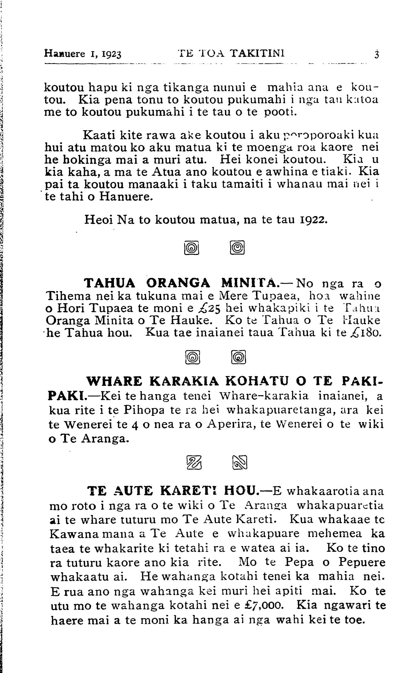 Hanuere 1, 1923TE TOA TAKITINI koutou hapu ki nga tikanga nunui e mahia ana e kou- tou. Kia pena tonu to koutou pukumahi i nga tau katoa me to koutou pukumahi i te tau o te pooti. Kaati kite rawa ake koutou i aku poroporoaki kua hui atu matou ko aku matua ki te moenga, roa kaore nei he hokinga mai a muri atu. Hei konei koutou. Kia u kia kaha, a ma te Atua ano koutou e awhina e tiaki. Kia pai ta koutou manaaki i taku tamaiti i whanau mai nei i te tahi o Hanuere. Heoi Na to koutou matua, na te tau 1922. TAHUA ORANGA MINITA.—No nga ra o Tihema nei ka tukuna mai e Mere Tupaea, hoa wahine o Hori Tupaea te moni e £25 hei whakapiki i te Tahua Oranga Minita o Te Hauke. Ko te Tahua o Te Hauke he Tahua hou. Kua tae inaianei taua Tahua ki te WHARE KARAKIA KOHATU O TE PAKI- PAKI.—Kei te hanga tenei Whare-karakia inaianei, a kua rite i te Pihopa te ra hei whakapuaretanga, ara kei te Wenerei te 4 o nea ra o Aperira, te Wenerei o te wiki o Te Aranga. TE AUTE KARETI HOU.—E whakaarotia ana mo roto i nga ra o te wiki o Te Aranga whakapuaretia ai te whare tuturu mo Te Aute Kareti. Kua whakaae te Kawana mana a Te Aute e whakapuare mehemea ka taea te whakarite ki tetahi ra e watea ai ia. Ko te tino ra tuturu kaore ano kia rite. Mo te Pepa o Pepuere whakaatu ai. He wahanga kotahi tenei ka mahia nei. E rua ano nga wahanga kei muri hei apiti mai. Ko te utu mo te wahanga kotahi nei e £7,000. Kia ngawari te haere mai a te moni ka hanga ai nga wahi kei te toe.