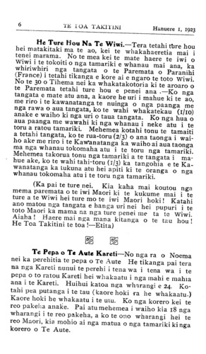 6TE TOA TAKITINI Hanuere 1, 1923 He Ture Hou Na Te Wiwi.—Tera tetahi ture hou hei matakitaki ma te ao, kei te whakahaeretia mai i tenei marama. No te mea kei te mate haere te iwi o Wiwi i te tokoiti o nga tamariki e whanau mai ana, ka whiriwhiri nga tangata o te Paremata o Paranihi (France) i tetahi tikanga e kore ai e ngaro te toto Wiwi. No te 30 o Tihema nei ka whakatakotoria ki te aroaro o te Paremata tetahi ture hou e penei ana .—Ko nga tangata e mate atu ana, a kaore he uri i mahue ki te ao, me riro i te kawanatanga te nuinga o nga paanga me nga rawa o aua tangata, ko te wahi whakatekau (1/10) anake e waiho ki nga uri o taua tangata. Ko nga hua o aua paanga me wawahi ki nga whanau i neke atu i te toru a ratou tamariki. Mehemea kotahi tonu te tamaiti a tetahi tangata, ko te rua-toru (2/3) o ana taonga i wai- ho ake me riro i te Kawanatanga ka waiho ai aua taonga ma nga whanau tokomaha atu i te toru nga tamariki. Mehemea takorua tonu nga tamariki a te tangata i ma- hue ake, ko te wahi tahi-toru (1/3) ka tangohia e te Ka- wanatanga ka tukuna atu hei apiti ki te oranga o nga whanau tokomaha atu i te toru nga tamariki. (Ka pai te ture nei. Kia kaha mai koutou nga mema paremata o te iwi Maori ki te kukume mai i te ture a te Wiwi hei ture mo te iwi Maori hoki! Katahi ano matou nga tangata e hanga uri nei hei pupuri i te toto Maori ka mama na nga ture penei me ta te Wiwi. Aiaha ! Haere mai nga mana kitanga o te tau hou ! He Toa Takitini te toa !—Etita) Te Pepa o Te Aute Kareti—No nga ra o Noema nei ka perehitia te pepa o Te Aute He tikanga pai tera na nga Kareti nunui te perehi i tena wa i tena wa i te pepa o to ratou Kareti hei whakaatu i nga mahi e mahia ana i te Kareti. Huihui katoa nga wharangi e 24. Ko- tahi pea putanga i te tau (kaore hoki ra he whakaatu.) Kaore hoki he whakaatu i te utu. Ko nga korero kei te reo pakeha anake. Pai atu mehemea i waiho kia 18 nga wharangi i te reo pakeha, a ko te ono wharangi hei te reo Maori, kia mohio ai nga matua o nga tamariki ki nga korero o Te Aute.