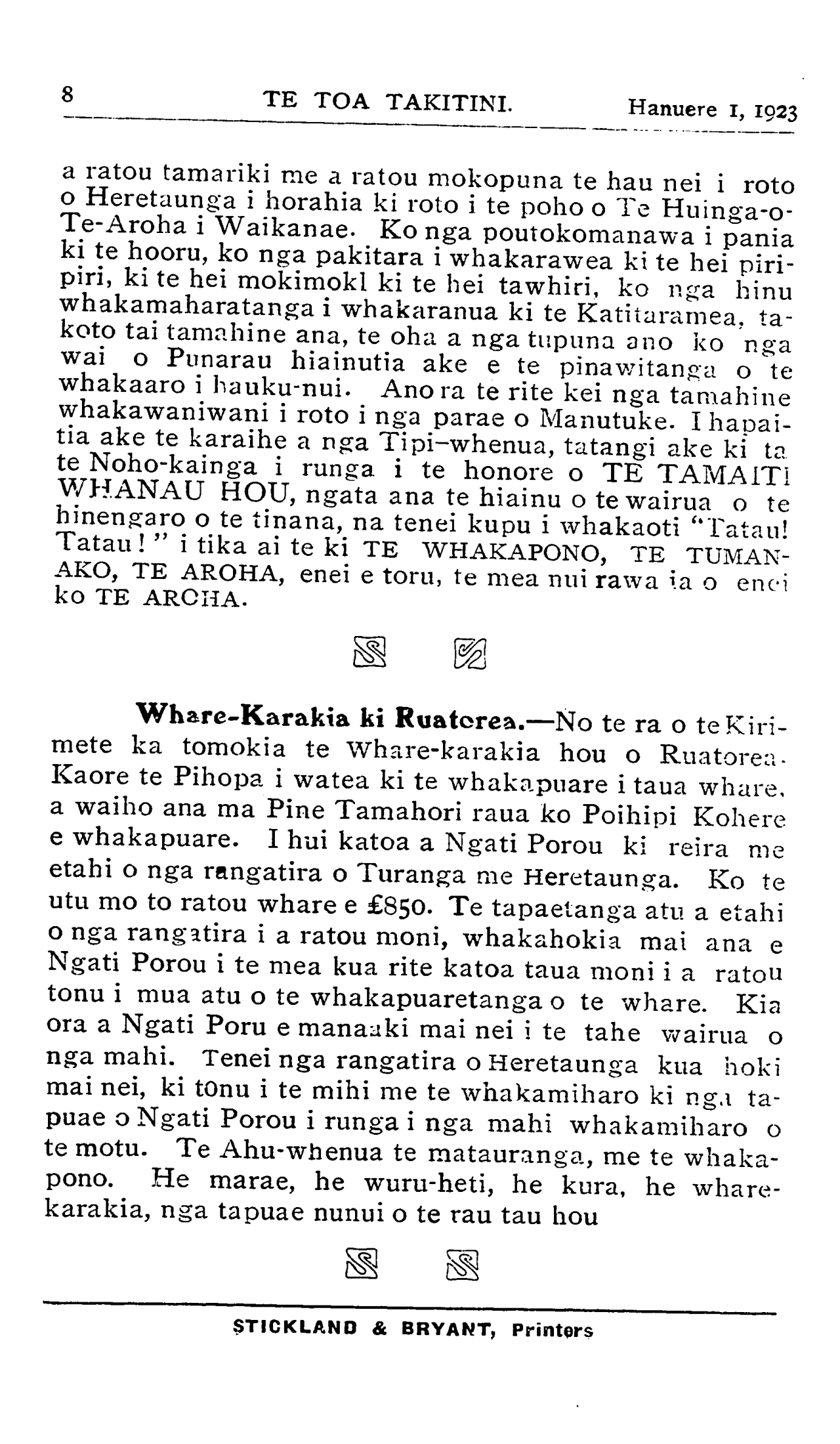 8TE TOA TAKITINI. Hanuere 1, 1923 a ratou tamariki me a ratou mokopuna te hau nei i roto o Heretaunga i horahia ki roto i te poho o Te Huinga-o- Te-Aroha i Waikanae- Ko nga poutokomanawa i pania ki te hooru, ko nga pakitara i whakarawea ki te hei piri- piri, ki te hei mokimoki ki te hei tawhiri, ko nga hinu whakamaharatanga i whakaranua ki te Katitaramea, ta- koto tai tamahine ana, te oha a nga tupuna ano ko nga wai o Punarau hiainutia ake e te pinawitanga o te whakaaro i hauku-nui. Ano ra te rite kei nga tamahine whakawaniwani i roto i nga parae o Manutuke. I hapai- tia ake te karaihe a nga Tipi-whenua, tatangi ake ki ta te Noho-kainga i runga i te honore o TE TAMAITI WHANAU HOU, ngata ana te hiainu o te wairua o te hinengaro o te tinana, na tenei kupu i whakaoti "Tatau! Tatau! " i tika ai te ki TE WHAKAPONO, TE TUMAN- AKO, TE AROHA, enei e toru, te mea nui rawa ia o enei ko TE AROHA. Whare-Karakia ki Ruatorea.—No te ra o te Kin- mete ka tomokia te Whare-karakia hou o Ruatorea- Kaore te Pihopa i watea ki te whakapuare i taua whare, a waiho ana ma Pine Tamahori raua ko Poihipi Kohere e whakapuare. I hui katoa a Ngati Porou ki reira me etahi o nga rangatira o Turanga me Heretaunga. Ko te utu mo to ratou whare e Ł850. Te tapaetanga atu a etahi o nga rangatira i a ratou moni, whakahokia mai ana e Ngati Porou i te mea kua rite katoa taua moni i a ratou tonu i mua atu o te whakapuaretanga o te whare. Kia ora a Ngati Poru e manaaki mai nei i te tahe wairua o nga mahi. Tenei nga rangatira o Heretaunga kua hoki mai nei, ki tonu i te mihi me te whakamiharo ki nga ta- puae o Ngati Porou i runga i nga mahi whakamiharo o te motu. Te Ahu-whenua te matauranga, me te whaka- pono. He marae, he wuru-heti, he kura, he whare- karakia, nga tapuae nunui o te rau tau hou STICKLAND & BRYANT, Printers