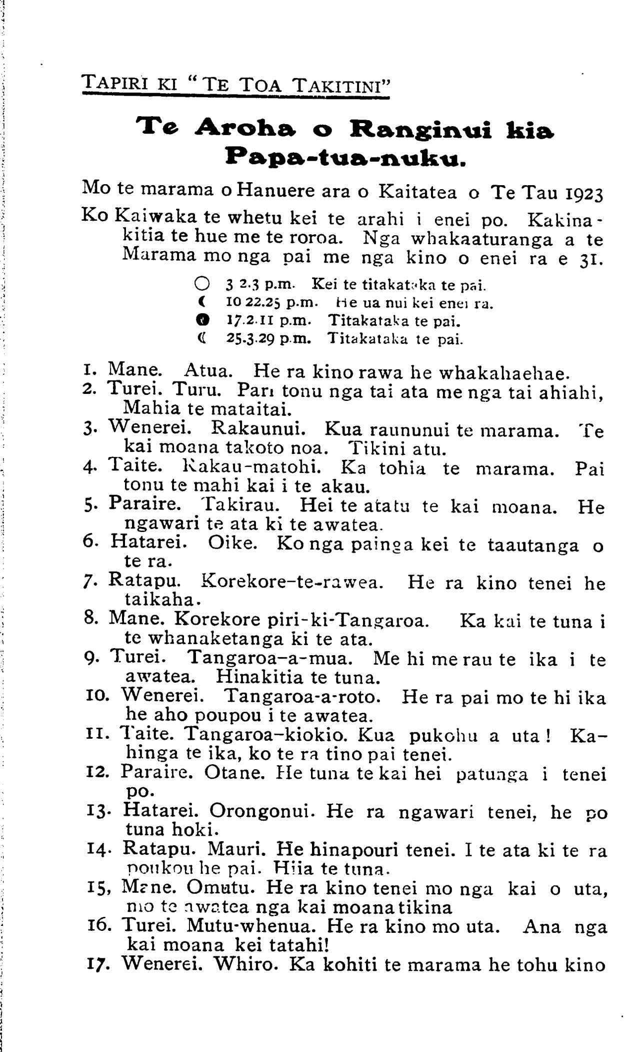 TAPIRI KI " TE TOA TAKITINI" Te Aroha o Ranginui kia. Papa-tua-nuku. Mo te marama o Hanuere ara o Kaitatea o Te Tau 1923 Ko Kaiwaka te whetu kei te arahi i enei po. Kakina- kitia te hue me te roroa. Nga whakaaturanga a te Marama mo nga pai me nga kino o enei ra e 31. O3 2-3 p.m. Kei te titakataka te pai. <1022.25 p.m. He ua nui kei enei ra. O17.2.11 p.m. Titakataka te pai. (i25.3.29 p.m. Titakataka te pai. 1. Mane. Atua. He ra kino rawa he whakahaehae. 2. Turei. Turu. Pan tonu nga tai ata me nga tai ahiahi, Mahia te mataitai. 3. Wenerei. Rakaunui. Kua raununui te marama. Te kai moana takoto noa. Tikini atu. 4. Taite. Rakau-matohi. Ka tohia te marama. Pai tonu te mahi kai i te akau. 5. Paraire. Takirau. Hei te atatu te kai moana. He ngawari te ata ki te awatea. 6. Hatarei. Oike. Ko nga painga kei te taautanga o te ra. 7. Ratapu. Korekore-te-rawea. He ra kino tenei he taikaha. 8. Mane. Korekore piri-ki-Tangaroa. Ka kai te tuna i te whanaketanga ki te ata. 9. Turei. Tangaroa-a-mua. Me hi me rau te ika i te awatea. Hinakitia te tuna. 10. Wenerei. Tangaroa-a-roto. He ra pai mo te hi ika he aho poupou i te awatea. 11. Taite. Tangaroa-kiokio. Kua pukohu a uta ! Ka- hinga te ika, ko te ra tino pai tenei. 12. Paraire. Otane. He tuna te kai hei patunga i tenei po. 13. Hatarei. Orongonui. He ra ngawari tenei, he po tuna hoki. 14. Ratapu. Mauri. He hinapouri tenei. I te ata ki te ra poukou he pai. Hiia te tuna. 15. Mane. Omutu. He ra kino tenei mo nga kai o uta, mo te awatea nga kai moana tikina 16. Turei. Mutu-whenua. He ra kino mo uta. Ana nga kai moana kei tatahi! 17. Wenerei. Whiro. Ka kohiti te marama he tohu kino