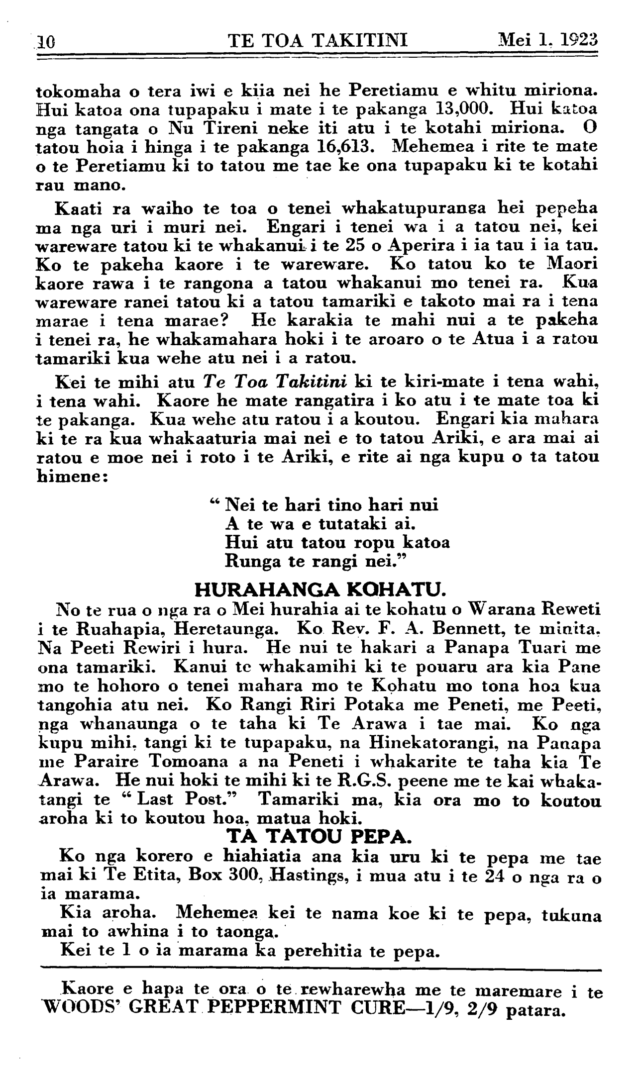 10\_\_\_\_\_\_\_\_\_\_\_\_TE TOA TAKITINIMei 1, 1923 tokomaha o tera iwi e kiia nei he Peretiamu e whitu miriona. Hui katoa ona tupapaku i mate i te pakanga 13,000. Hui katoa nga tangata o Nu Tireni neke iti atu i te kotahi miriona. O tatou hoia i hinga i te pakanga 16,613. Mehemea i rite te mate o te Peretiamu ki to tatou me tae ke ona tupapaku ki te kotahi rau mano. Kaati ra waiho te toa o tenei whakatupuranga hei pepeha ma nga uri i muri nei. Engari i tenei wa i a tatou nei, kei wareware tatou ki te whakanui i te 25 o Aperira i ia tau i ia tau. Ko te pakeha kaore i te wareware. Ko tatou ko te Maori kaore rawa i te rangona a tatou whakanui mo tenei ra. Kua wareware ranei tatou ki a tatou tamariki e takoto mai ra i tena marae i tena marae? He karakia te mahi nui a te pakeha i tenei ra, he whakamahara hoki i te aroaro o te Atua i a ratou tamariki kua wehe atu nei i a ratou. Kei te mihi atu Te Toa Takitini ki te kiri-mate i tena wahi, i tena wahi. Kaore he mate rangatira i ko atu i te mate toa ki te pakanga. Kua wehe atu ratou i a koutou. Engari kia mahara ki te ra kua whakaaturia mai nei e to tatou Ariki, e ara mai ai ratou e moe nei i roto i te Ariki, e rite ai nga kupu o ta tatou himene: " Nei te hari tino hari nui A te wa e tutataki ai. Hui atu tatou ropu katoa Runga te rangi nei." HURAHANGA KOHATU. No te rua o nga ra o Mei hurahia ai te kohatu o Warana Reweti i te Ruahapia, Heretaunga. Ko Rev. F. A. Bennett, te minita. Na Peeti Rewiri i hura. He nui te hakari a Panapa Tuari me ona tamariki. Kanui te whakamihi ki te pouaru ara kia Pane mo te hohoro o tenei mahara mo te Kohatu mo tona hoa kua tangohia atu nei. Ko Rangi Riri Potaka me Peneti, me Peeti, nga whanaunga o te taha ki Te Arawa i tae mai. Ko nga kupu mihi, tangi ki te tupapaku, na Hinekatorangi, na Panapa me Paraire Tomoana a na Peneti i whakarite te taha kia Te Arawa. He nui hoki te mihi ki te R.G.S. peene me te kai whaka- tangi te " Last Post." Tamariki ma, kia ora mo to koutou aroha ki to koutou hoa. matua hoki. TA TATOU PEPA. Ko nga korero e hiahiatia ana kia uru ki te pepa me tae mai ki Te Etita, Box 300, Hastings, i mua atu i te 24 o nga ra o ia marama. Kia aroha. Mehemea kei te nama koe ki te pepa, tukuna mai to awhina i to taonga. Kei te 1 o ia marama ka perehitia te pepa. Kaore e hapa te ora o te rewharewha me te maremare i te WOODS' GREAT PEPPERMINT CURE—1/9, 2/9 patara.