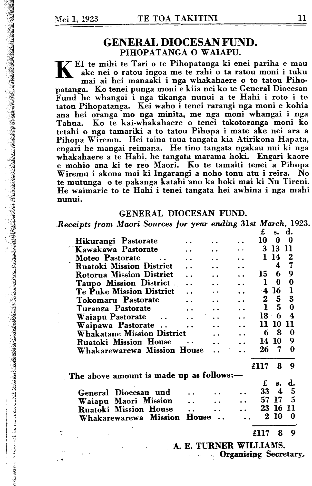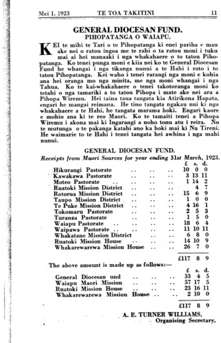 Mei 1. 1923TE TOA TAKITINI 11 GENERAL DIOCESAN FUND. PIHOPATANGA O WAIAPU. EI te mihi te Tari o te Pihopatanga ki enei pariha e mau ake nei o ratou ingoa me te rahi o ta ratou moni i tuku mai ai hei manaaki i nga whakahaere o to tatou Piho- patanga. Ko tenei punga moni e kiia nei ko te General Diocesan Fund he whangai i nga tikanga nunui a te Hahi i roto i to tatou Pihopatanga. Kei waho i tenei rarangi nga moni e kohia ana hei oranga mo nga minita, me nga moni whangai i nga Tahua. Ko te kai-whakahaere o tenei takotoranga moni ko tetahi o nga tamariki a to tatou Pihopa i mate ake nei ara a Pihopa Wiremu. Hei taina taua tangata kia Atirikona Hapata, engari he mangai reimana. He tino tangata ngakau nui ki nga whakahaere a te Hahi, he tangata marama hoki. Engari kaore e mohio ana ki te reo Maori. Ko te tamaiti tenei a Pihopa Wiremu i akona mai ki Ingarangi a noho tonu atu i reira. No te mutunga o te pakanga katahi ano ka hoki mai ki Nu Tireni. He waimarie to te Hahi i tenei tangata hei awhina i nga mahi GENERAL DIOCESAN FUND. Receipts from Maori Sources for year ending 31stMarch, 1923. £ s. d. Hikurangi Pastorate . ... ..10 O O Kawakawa Pastorate .... ..3 13 11 Moteo Pastorate .. .... ..1 14 2 Ruatoki Mission District .... ..47 Rotorua Mission District .... ..15 6 9 Taupo Mission District ..... ..100 Te Puke Mission District .... ..4 16 1 Tokomaru Pastorate .... ..253 Turanga Pastorate .... ..150 Waiapu Pastorate .. .... ..18 6 4 Waipawa Pastorate .. .... ..11 10 11 Whakatane Mission District.. ..680 Ruatoki Mission House . ..14 10 9 Whakarewarewa Mission House....26 7 O £117 8 9 The above amount is made up as follows:— £ s. d. General Diocesan and .. .. .. 33 4 5 Waiapu Maori Mission .. .. .. 57 17 5 Ruatoki Mission House .. .. .. 23 16 11 Whakarewarewa Mission House .. .. 2 10 O £117 8 9 A. E. TURNER WILLIAMS, Organising Secretary.