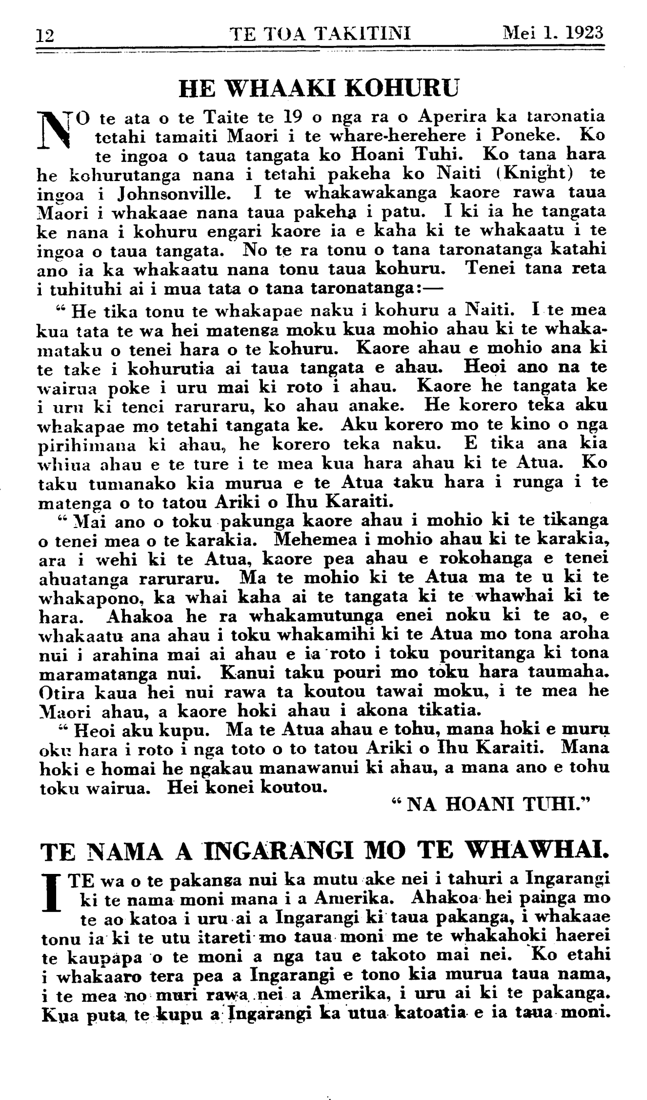 12TE TOA TAKITINI Mei 1. 1923 HE WHAAKI KOHURU te ata o te Taite te 19 o nga ra o Aperira ka taronatia tetahi tamaiti Maori i te whare-herehere i Poneke. Ko te ingoa o taua tangata ko Hoani Tuhi. Ko tana hara he kohurutanga nana i tetahi pakeha ko Naiti (Knight) te ingoa i Johnsonville. I te whakawakanga kaore rawa taua Maori i whakaae nana taua pakeha i patu. I ki ia he tangata ke nana i kohuru engari kaore ia e kaha ki te whakaatu i te ingoa o taua tangata. No te ra tonu o tana taronatanga katahi ano ia ka whakaatu nana tonu taua kohuru. Tenei tana reta i tuhituhi ai i mua tata o tana taronatanga:— " He tika tonu te whakapae naku i kohuru a Naiti. I te mea kua tata te wa hei matenga moku kua mohio ahau ki te whaka- mataku o tenei hara o te kohuru. Kaore ahau e mohio ana ki te take i kohurutia ai taua tangata e ahau. Heoi ano na te wairua poke i uru mai ki roto i ahau. Kaore he tangata ke i uru ki tenei raruraru, ko ahau anake. He korero teka aku whakapae mo tetahi tangata ke. Aku korero mo te kino o nga pirihimana ki ahau, he korero teka naku. E tika ana kia whiua ahau e te ture i te mea kua hara ahau ki te Atua. Ko taku tumanako kia murua e te Atua taku hara i runga i te matenga o to tatou Ariki o Ihu Karaiti. " Mai ano o toku pakunga kaore ahau i mohio ki te tikanga o tenei mea o te karakia. Mehemea i mohio ahau ki te karakia, ara i wehi ki te Atua, kaore pea ahau e rokohanga e tenei ahuatanga raruraru. Ma te mohio ki te Atua ma te u ki te whakapono, ka whai kaha ai te tangata ki te whawhai ki te hara. Ahakoa he ra whakamutunga enei noku ki te ao, e whakaatu ana ahau i toku whakamihi ki te Atua mo tona aroha nui i arahina mai ai ahau e ia roto i toku pouritanga ki tona maramatanga nui. Kanui taku pouri mo toku hara taumaha. Otira kaua hei nui rawa ta koutou tawai moku, i te mea he Maori ahau, a kaore hoki ahau i akona tikatia. " Heoi aku kupu. Ma te Atua ahau e tohu, mana hoki e muru oku hara i roto i nga toto o to tatou Ariki o Ihu Karaiti. Mana hoki e homai he ngakau manawanui ki ahau, a mana ano e tohu toku wairua. Hei konei koutou. " NA HOANI TUHI." TE NAMA A INGARANGI MO TE WHAWHAI. ITE wa o te pakanga nui ka mutu ake nei i tahuri a Ingarangi ki te nama moni mana i a Amerika. Ahakoa hei painga mo te ao katoa i uru ai a Ingarangi ki taua pakanga, i whakaae tonu ia ki te utu kareti mo taua moni me te whakahoki haerei te kaupapa o te moni a nga tau e takoto mai nei. Ko etahi i whakaaro tera pea a Ingarangi e tono kia murua taua nama, i te mea no muri rawa nei a Amerika, i uru ai ki te pakanga. Kua puta, te kupu a Ingarangi ka utua katoatia e ia tawa moni.