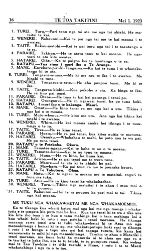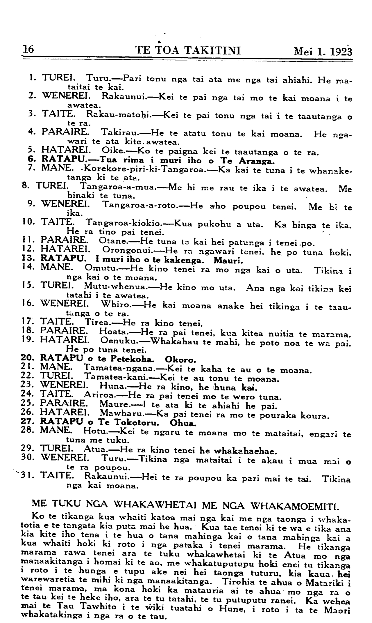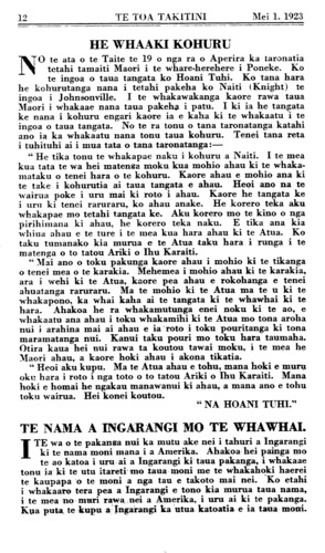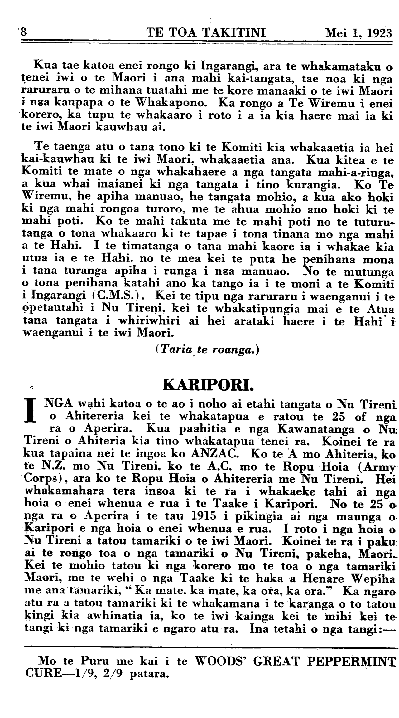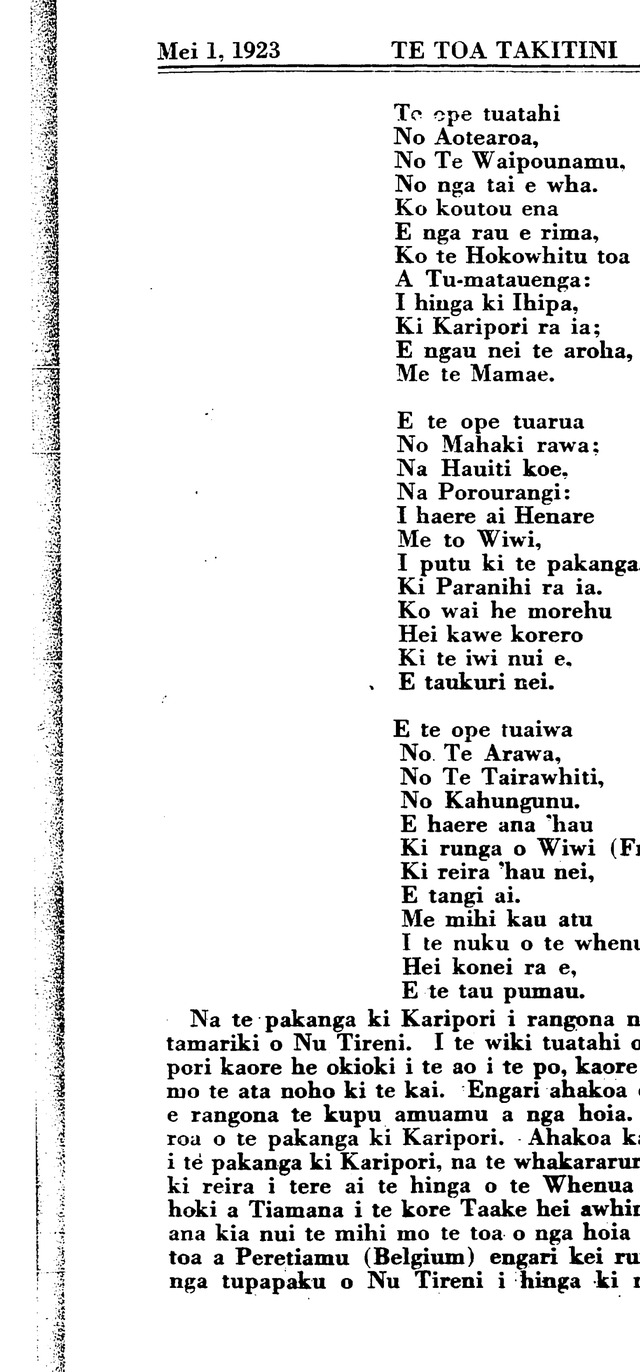 Mei 1, 1923TE TOA TAKITINI To ope tuatahi No Aotearoa, No Te Waipounamu, No nga tai e wha. Ko koutou ena E nga rau e rima, Ko te Hokowhitu toa A Tu-matauenga: I hinga ki Ihipa, Ki Karipori ra ia; E ngau nei te aroha, Me te Mamae. E te ope tuarua No Mahaki rawa; Na Hauiti koe. Na Porourangi: I haere ai Henare Me to Wiwi, I putu ki te pakanga Ki Paranihi ra ia. Ko wai he morehu Hei kawe korero Ki te iwi nui e, E taukuri nei. E te ope tuaiwa No. Te Arawa, No Te Tairawhiti, No Kahungunu. E haere ana hau Ki runga o Wiwi (Fi Ki reira hau nei, E tangi ai. Me mihi kau atu I te nuku o te whenua Hei konei ra e, E te tau pumau. Na te pakanga ki Karipori i rangona n tamariki o Nu Tireni. I te wiki tuatahi o pori kaore he okioki i te ao i te po, kaore mo te ata noho ki te kai. Engari ahakoa e rangona te kupu amuamu a nga hoia. roa o te pakanga ki Karipori. Ahakoa ka i te pakanga ki Karipori, na te whakararuraru ki reira i tere ai te hinga o te Whenua hoki a Tiamana i te kore Taake hei awhi ana kia nui te mihi mo te toa o nga hoia toa a Peretiamu (Belgium) engari kei ru nga tupapaku o Nu Tireni i hinga ki i