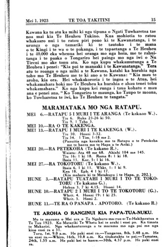 Mei 1.1923TE TOA TAKITINI\_\_\_\_\_\_\_\_\_\_\_\_\_15 Kawana ka tu atu ka mihi ki nga tipuna o Ngati Tuwharetoa tae noa mai kia Te Heuheu Tukino. Kua mohiotia to ratou whakaaro nui i to ratou piri pono ki te Kawanatanga, i te urunga o nga tamariki ki te tautoko i te mana o te Kingi i te wa o te pakanga, i te tapaetanga a Te Heuheu i te 40.000 eka whenua hei oranga mo nga hoia, me te rahui- tanga i te paaka o Tongariro hei painga mo nga iwi o Nu Tireni mo ake tonu atu. Ko nga kupu whakamutunga a Te Heuheu i penei: "Kia pai te manaaki i te Kawanatanga." Tera atu te roanga o nga ruihi a te Kawana, katahi ka hurahia nga tohu mo Te Heuheu me te ki ano a te Kawana: " Kia mau te aroha, kia ora. Hei whakakororia i te ingoa o te Atua, hei whakamahara hoki mo Te Heuheu ka hurahia e ahau tenei tohu whakamahara." Ko nga kupu kei runga i taua kohatu e mau ana e penei ana. " Ko Tongariro te maunga, ko Taupo te moana, ko Tuwharetoa te iwi, ko Te Heuheu te tangata." MARAMATAKA MO NGA RATAPU. MEI 6.—RATAPU 5 I MURI I TE ARANGA (Te kakano W.). Tiu 6. Ruka 23-26 ki 50. Tiu 9. 1 Teha 3. MEI 10.—RA O TE KAKENGA. MEI 13.—RATAPU I MURI I TE KAKENGA (W.). Tiu 30. Hoani 3-32. Tiu 34. 1 Tim. 1-18 me 2. (Panuitia nga karakia mo te Ratapu o te Petekoha me te haora mo te Hapa a te Ariki.) MEI 20.—RA PETEKOHA (Te kakano R.). Waiata: Ata 48 me 68. Ahiahi 104 me 145. Tiu 16: 1 ki 18. Roma 8: 1 ki 18. Ihaia 1 1. Kar. 5 : 1 ki 1 6. MEI 27.—RA TOKOTORU (Te kakano W.). Ihaia 6, 1 ki 1 1. Whkt. 1 : 1 ki 9. Ken 18. Eph. 4 1 ki 17. (Kia mahara ki te Matakupu i te Hapa, p. 202.) HUNE 3.—RATAPU TUATAHI I MURI I TO TE TOKO- TORU (Te kakano G.). Hohua 3, 7 ki 4.15. Hoani 14. HUNE 10.—RATAPU 2 I MURI I TO TE TOKOTORU (G.). Whrit. 4. Hoani 19: 1 ki 25. Whrit. 5. Hemi 2. HUNE 11.—TE RA O PANAPA . APOTORO. (Te kakano R.) TE AROHA O RANGINUI KIA PAPA-TUA-NUKU. Mo te marama o Mei ara o Te Ngahuru-ma-rua-o-Te-Hakiharatua o Te Tau 1923. Ko Matariki Te Whetu kei te arahi i enei po. Ka timata te Makariri. Nga whakaaturanga a te marama mo nga pai me nga kino enei ra e 31. Turu, 1st, 9.0 a.m. He paki enei ra.—Tangaroa, 8th, 5.48 a.m. He ua enei ra.—Whiro, 16th, 10.8 a.m. Ka titakatakta te pai.—Tamatea. 24th, 1.55 a.m. He paki kei te haere.—30th, 4.37 p.m. He paki enei ra.
