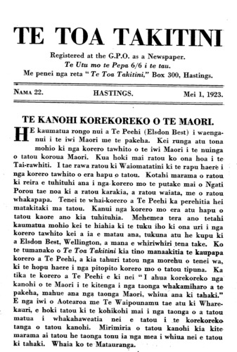 TE TOA TAKITINI Registered at the G.P.O, as a Newspaper. Te Utu mo te Pepa 6/6 i te tau. Me penei nga reta " Te Toa Takitini," Box 300. Hastings. NAMA 22.HASTINGS. Mei 1, 1923. TE KANOHI KOREKOREKO O TE MAORI. HE kaumatua rongo nui a Te Peehi (Elsdon Best) i waenga- nui i te iwi Maori me te pakeha. Kei runga atu tona mohio ki nga korero tawhito o te iwi Maori i te nuinga o tatou koroua Maori. Kua hoki mai ratou ko ona hoa i te Tai-rawhiti. I tae rawa ratou ki Waiomatatini ki te rapu haere i nga korero tawhito o era hapu o tatou. Kotahi marama o ratou ki reira e tuhituhi ana i nga-korero mo te putake mai o Ngati Porou tae noa ki a ratou karakia, a ratou waiata, me o ratou whakapapa. Tenei te whai-korero a Te Peehi ka perehitia hei matakitaki ma tatou. Kanui nga korero mo era atu hapu o tatou kaore ano kia tuhituhia. Mehemea tera ano tetahi kaumatua mohio kei te hiahia ki te tuku iho ki ona uri i nga korero tawhito kei a ia e matau ana, tukuna atu he kupu ki a Elsdon Best, Wellington, a mana e whiriwhiri tena take. Ko te tumanako o Te Toa Takitini kia tino manaakitia te kaupapa korero a Te Peehi, a kia tahuri tatou nga morehu o tenei wa, ki te hopu haere i nga pitopito korero mo o tatou tipuna. Ka tika te korero a Te Peehi e ki nei " I ahua korekoreko nga kanohi o te Maori i te kitenga i nga taonga whakamiharo a te pakeha, mahue ana nga taonga Maori, whiua ana ki tahaki." E nga iwi o Aotearoa me Te Waipounamu tae atu ki Whare- kauri, e hoki tatou ki te kohikohi mai i nga taonga o a tatou matua i whakahaweatia nei e tatou i te korekoreko- tanga o tatou kanohi. Mirimiria o tatou kanohi kia kite marama ai tatou he taonga tonu ia nga mea i whiua nei e tatou ki tahaki. Whaia ko te Matauranga.
