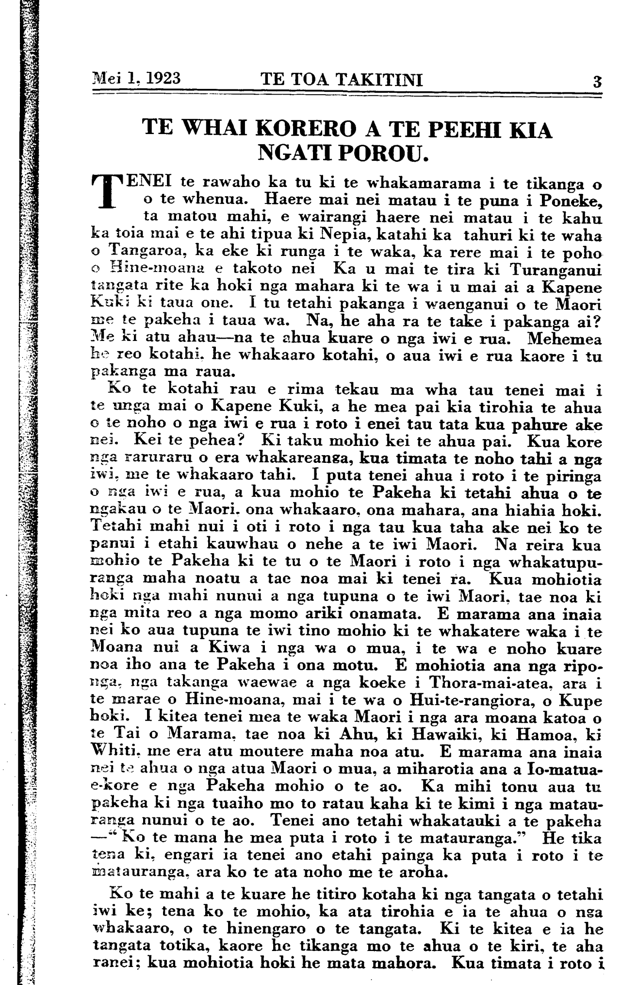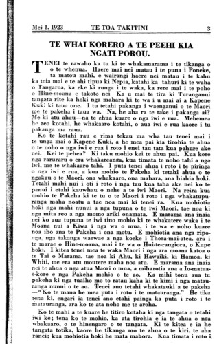 Mei 1, 1923TE TOA TAKITINI\_\_\_\_\_\_\_\_\_\_\_\_\_3 TE WHAI KORERO A TE PEEHI KIA NGATI POROU. TENEI te rawaho ka tu ki te whakamarama i te tikanga o o te whenua. Haere mai nei matau i te puna i Poneke, ta matou mahi, e wairangi haere nei matau i te kahu ka toia mai e te ahi tipua ki Nepia, katahi ka tahuri ki te waha o Tangaroa, ka eke ki runga i te waka, ka rere mai i te poho o Hine-moana e takoto nei Ka u mai te tira ki Turanganui tangata rite ka hoki nga mahara ki te wa i u mai ai a Kapene Kuki ki taua one. I tu tetahi pakanga i waenganui o te Maori me te pakeha i taua wa. Na, he aha ra te take i pakanga ai? Me ki atu ahau—na te ahua kuare o nga iwi e rua. Mehemea be reo kotahi, he whakaaro kotahi, o aua iwi e rua kaore i tu pakanga ma raua. Ko te kotahi rau e rima tekau ma wha tau tenei mai i te unga mai o Kapene Kuki, a he mea pai kia tirohia te ahua o te noho o nga iwi e rua i roto i enei tau tata kua pahure ake nei. Kei te pehea? Ki taku mohio kei te ahua pai. Kua kore nga raruraru o era whakareanga, kua timata te noho tahi a nga iwi. me te whakaaro tahi. I puta tenei ahua i roto i te piringa o nga iwi e rua, a kua mohio te Pakeha ki tetahi ahua o te ngakau o te Maori, ona whakaaro, ona mahara, ana hiahia hoki. Tetahi mahi nui i oti i roto i nga tau kua taha ake nei. ko te panui i etahi kauwhau o nehe a te iwi Maori. Na reira kua mohio te Pakeha ki te tu o te Maori i roto i nga whakatupu- ranga maha noatu a tae noa mai ki tenei ra. Kua mohiotia hoki nga mahi nunui a nga tupuna o te iwi Maori, tae noa ki nga mita reo a nga momo ariki onamata. E marama ana inaia nei ko aua tupuna te iwi tino mohio ki te whakatere waka i te Moana nui a Kiwa i nga wa o mua, i te wa e noho kuare noa iho ana te Pakeha i ona motu. E mohiotia ana nga ripo- nga, nga takanga waewae a nga koeke i Thora-mai-atea, ara i te marae o Hine-moana, mai i te wa o Hui-te-rangiora, o Kupe hoki. I kitea tenei mea te waka Maori i nga ara moana katoa o te Tai o Marama, tae noa ki Ahu, ki Hawaiki, ki Hamoa, ki Whiti, me era atu moutere maha noa atu. E marama ana inaia nei te ahua o nga atua Maori o mua, a miharotia ana a Io-matua- e-kore e nga Pakeha mohio o te ao. Ka mihi tonu aua tu pakeha ki nga tuaiho mo to ratau kaha ki te kimi i nga matau- ranga nunui o te ao. Tenei ano tetahi whakatauki a te pakeha —" Ko te mana he mea puta i roto i te matauranga." He tika tena ki. engari ia tenei ano etahi painga ka puta i roto i te matauranga, ara ko te ata noho me te aroha. Ko te mahi a te kuare he titiro kotaha ki nga tangata o tetahi iwi ke; tena ko te mohio, ka ata tirohia e ia te ahua o nga whakaaro, o te hinengaro o te tangata. Ki te kitea e ia he tangata totika, kaore he tikanga mo te ahua o te kiri, te aha ranei; kua mohiotia hoki he mata mahora. Kua timata i roto i