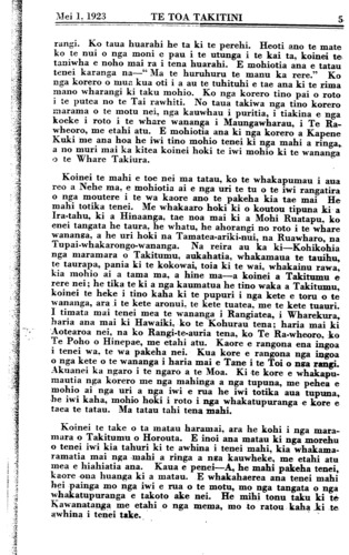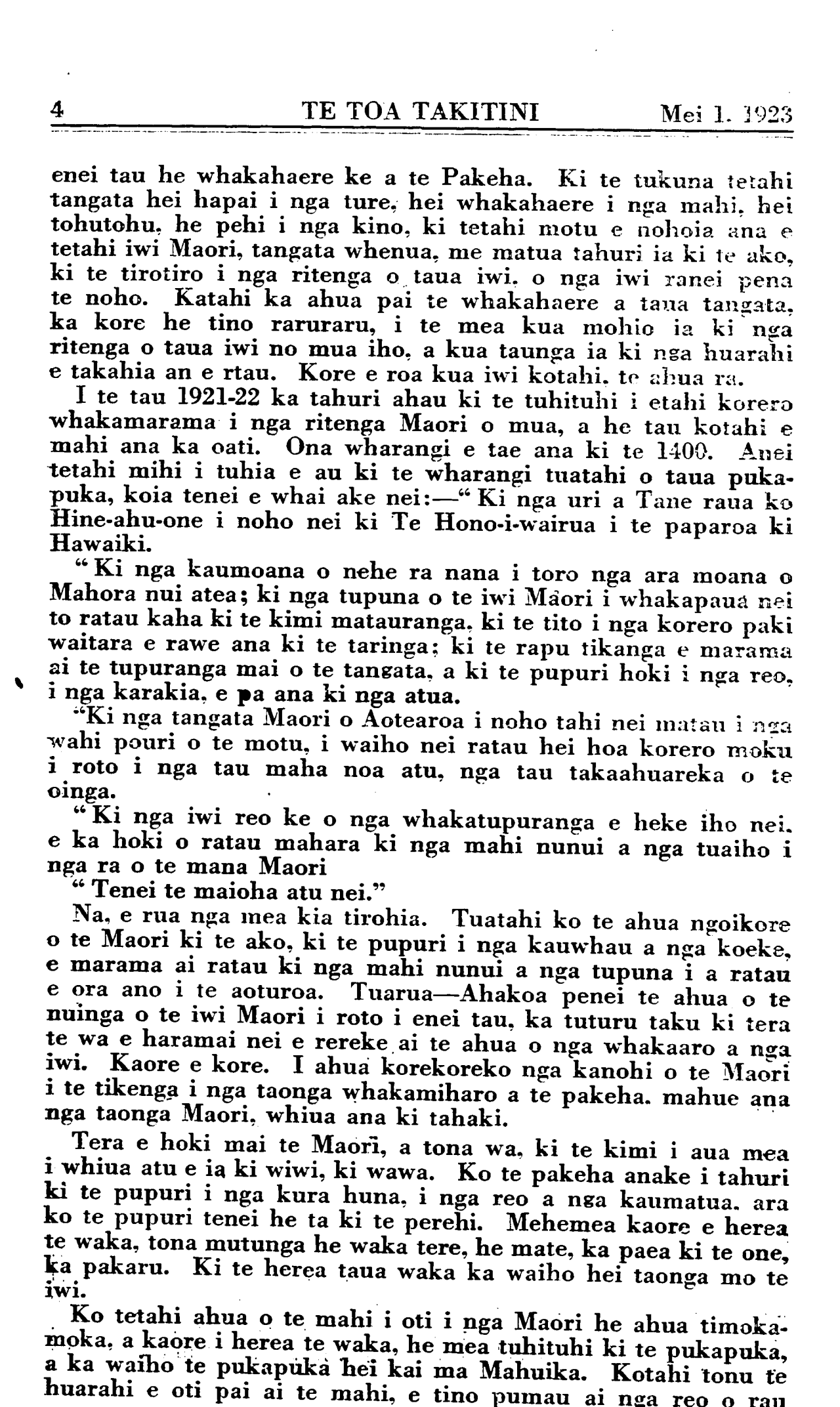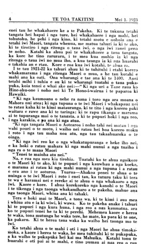 Mei 1. 1923 \_\_ TE TOA TAKITINI rangi. Ko taua huarahi he ta ki te perehi. Heoti ano te mate ko te nui o nga moni e pau i te utunga i te kai ta, koinei te taniwha e noho mai ra i tena huarahi. E mohiotia ana e tatau tenei karanga na—" Ma te huruhuru te manu ka rere." Ko nga korero o mua kua oti i a au te tuhituhi e tae ana ki te rima mano wharangi ki taku mohio. Ko nga korero tino pai o roto i te putea no te Tai rawhiti. No taua takiwa nga tino korero marama o te motu nei, nga kauwhau i puritia, i tiakina e nga koeke i roto i te whare wananga i Maungawharau, i Te Ra- wheoro, me etahi atu. E mohiotia ana ki nga korero a Kapene Kuki me ana hoa he iwi tino mohio tenei ki nga mahi a ringa, a no muri mai ka kitea koinei hoki te iwi mohio ki te wananga o te Whare Takiura. Koinei te mahi e toe nei ma tatau, ko te whakapumau i aua reo a Nehe ma. e mohiotia ai e nga uri te tu o te iwi rangatira o nga moutere i te wa kaore ano te pakeha kia tae mai He mahi totika tenei. Me whakaaro hoki ki o koutou tipuna ki a Ira-tahu, ki a Hinaanga. tae noa mai ki a Mohi Ruatapu, ko enei tangata he taura, he whatu, he ahorangi no roto i te whare wananga, a he uri hoki na Tamatea-ariki-nui, na Ruawharo, na Tupai-whakarongo-wananga. Na reira au ka ki—Kohikohia nga maramara o Takitumu. aukahatia, whakamaua te tauihu, te taurapa, pania ki te kokowai, toia ki te wai, whakainu rawa, kia mohio ai a tama ma, a hine ma—a koinei a Takitumu e rere nei; he tika te ki a nga kaumatua he tino waka a Takitumu, koinei te heke i tino kaha ki te pupuri i nga kete e toru o te wananga, ara i te kete aronui, te kete tuatea, me te kete tuauri. I timata mai tenei mea te wananga i Rangiatea, i Wharekura., haria ana mai ki Hawaiki, ko te Kohurau tena; haria mai ki Aotearoa nei, na ko Rangi-te-auria tena, ko Te Ra-wheoro, :ko Te Poho o Hinepae, me etahi atu. Kaore e rangona ena ingoa i tenei wa. te wa pakeha nei. Kua kore e rangona nga ingoa o nga kete o te wananga i haria mai e Tane i te Toi o nga rangi. Akuanei ka ngaro i te ngaro a te Moa. Ki te kore e whakapu- mautia nga korero me nga mahinga a nga tupuna, me pehea e mohio ai nga uri a nga iwi e rua he iwi totika aua tupuna, he iwi kaha, mohio hoki i roto i nga whakatupuranga e kore e taea te tatau. Ma tatau tahi tena mahi. Koinei te take o ta matau haramai, ara he kohi i nga mara- mara o Takitumu o Horouta. E inoi ana matau ki nga morehu o tenei iwi kia tahuri ki te awhina i tenei mahi, kia whakama- ramatia mai nga mahi a ringa a nga kauwheke, me etahi atu mea e hiahiatia ana. Kaua e penei—A, he mahi pakeha tenei, kaore ona huanga ki a matau. E whakahaerea ana tenei mahi hei painga mo nga iwi e rua o te motu, mo nga tangata o nga whakatupuranga e takoto ake nei. He mihi tonu taku ki te Kawanatanga me etahi o nga mema, mo to ratou kaha ki te awhina i tenei take.