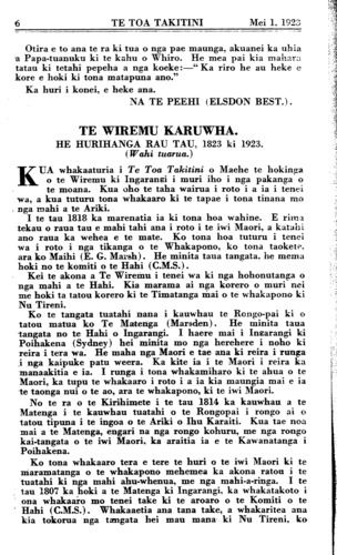 6TE TOA TAKITINI\_\_\_\_\_\_Mei 1. 1923 Otira e to ana te ra ki tua o nga pae maunga, akuanei ka uhia a Papa-tuanuku ki te kahu o Whiro. He mea pai kia mahara tatau ki tetahi pepeha a nga koeke:—"Ka riro he au heke e kore e hoki ki tona matapuna ano." Ka huri i konei, e heke ana. NA TE PEEHI (ELSDON BEST.). TE WIREMU KARUWHA. HE HURIHANGA RAU TAU, 1823 ki 1923. (Wahi tuarua.) KUA whakaaturia i Te Toa Takitini o Maehe te hokinga o te Wiremu ki Ingarangi i muri iho i nga pakanga o te moana. Kua oho te taha wairua i roto i a ia i tenei wa, a kua tuturu tona whakaaro ki te tapae i tona tinana mo . nga mahi a te Ariki. I te tau 1818 ka marenatia ia ki tona hoa wahine. E rima tekau o raua tau e mahi tahi ana i roto i te iwi Maori, a katahi ano raua ka wehea e te mate. Ko tona hoa tuturu i tenei wa i roto i nga tikanga o te Whakapono, ko tona taokete. ara ko Maihi (E. G. Marsh). He minita taua tangata, he mema hoki no te komiti o te Hahi (C.M.S.). Kei te akona a Te Wiremu i tenei wa ki nga hohonutanga o nga mahi a te Hahi. Kia marama ai nga korero o muri nei me hoki ta tatou korero ki te Timatanga mai o te whakapono ki Nu Tireni. Ko te tangata tuatahi nana i kauwhau te Rongo-pai ki o tatou matua ko Te Matenga (Marsden). He minita taua tangata no te Hahi o Ingarangi. I haere mai i Ingarangi ki Poihakena (Sydney) hei minita mo nga herehere i noho ki reira i tera wa. He maha nga Maori e tae ana ki reira i runga i nga kaipuke patu weera. Ka kite ia i te Maori i reira ka manaakitia e ia. I runga i tona whakamiharo ki te ahua o te Maori, ka tupu te whakaaro i roto i a ia kia maungia mai e ia te taonga nui o te ao, ara te whakapono, ki te iwi Maori. No te ra o te Kirihimete i te tau 1814 ka kauwhau a te Matenga i te kauwhau tuatahi o te Rongopai i rongo ai o tatou tipuna i te ingoa o te Ariki o Ihu Karaiti. Kua tae noa mai a te Matenga, engari na nga rongo kohuru, me nga rongo kai-tangata o te iwi Maori, ka araitia ia e te Kawanatanga i Poihakena. Ko tona whakaaro tera e tere te huri o te iwi Maori ki te maramatanga o te whakapono mehemea ka akona ratou i te tuatahi ki nga mahi ahu-whenua, me nga mahi-a-ringa. I te tau 1807 ka hoki a te Matenga ki Ingarangi, ka whakatakoto i ona whakaaro mo tenei take ki te aroaro o te Komiti o te Hahi (C.M.S.). Whakaaetia ana tana take, a whakaritea ana kia tokorua nga tangata hei mau mana ki Nu Tireni, ko