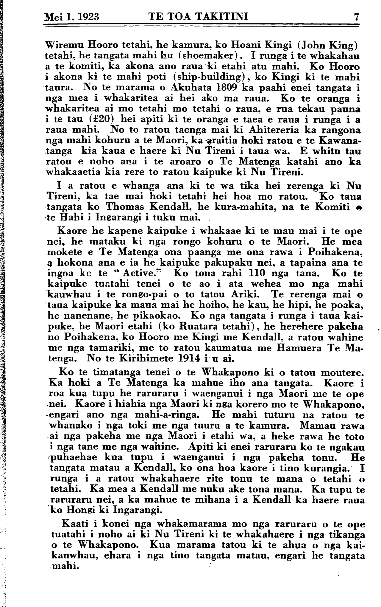 Mei 1, 1923TE TOA TAKITINI Wiremu Hooro tetahi, he kamura, ko Hoani Kingi (John King) tetahi, he tangata mahi hu (shoemaker). I runga i te whakahau a te komiti, ka akona ano raua ki etahi atu mahi. Ko Hooro i akona ki te mahi poti (ship-building), ko Kingi ki te mahi taura. No te marama o Akuhata 1809 ka paahi enei tangata i nga mea i whakaritea ai hei ako ma raua. Ko te oranga i whakaritea ai mo tetahi mo tetahi o raua, e rua tekau pauna i te tau (£20) hei apiti ki te oranga e taea e raua i runga i a raua mahi. No to ratou taenga mai ki Ahitereiria ka rangona nga mahi kohuru a te Maori, ka araitia hoki ratou e te Kawana- tanga kia kaua e haere ki Nu Tireni i taua wa. E whitu tau ratou e noho ana i te aroaro o Te Matenga katahi ano ka whakaaetia kia rere to ratou kaipuke ki Nu Tireni. I a ratou e whanga ana ki te wa tika hei rerenga ki Nu Tireni, ka tae mai hoki tetahi hei hoa mo ratou. Ko taua tangata ko Thomas Kendall, he kura-mahita, na te Komiti • te Hahi i Ingarangi i tuku mai. Kaore he kapene kaipuke i whakaae ki te mau mai i te ope nei, he mataku ki nga rongo kohuru o te Maori. He mea mokete e Te Matenga ona paanga me ona rawa i Poihakena, a hokona ana e ia he kaipuke pakupaku nei, a tapaina ana te ingoa ke te " Active." Ko tona rahi 110 nga tana. Ko te kaipuke tuatahi tenei o te ao i ata wehea mo nga mahi kauwhau i te rongo-pai o to tatou Ariki. Te rerenga mai o taua kaipuke ka maua mai he hoiho, he kau, he hipi, he poaka, he nanenane, he pikaokao. Ko nga tangata i runga i taua kai- puke, he Maori etahi (ko Ruatara tetahi), he herehere pakeha no Poihakena, ko Hooro me Kingi me Kendall. a ratou wahine me nga tamariki, me to ratou kaumatua me Hamuera Te Ma- tenga. No te Kirihimete 1914 i u ai. Ko te timatanga tenei o te Whakapono ki o tatou moutere. Ka hoki a Te Matenga ka mahue iho ana tangata. Kaore i roa kua tupu he raruraru i waenganui i nga Maori me te ope nei. Kaore i hiahia nga Maori ki nga korero mo te Whakapono, -engari ano nga mahi-a-ringa. He mahi tuturu na ratou te whanako i nga toki me nga tuuru a te kamura. Mamau rawa ai nga pakeha me nga Maori i etahi wa, a heke rawa he toto i nga tane me nga wahine. Apiti ki enei raruraru ko te ngakau puhaehae kua tupu i waenganui i nga pakeha tonu. He tangata matau a Kendall, ko ona hoa kaore i tino kurangia. I runga i a ratou whakahaere rite tonu te mana o tetahi o tetahi. Ka mea a Kendall me nuku ake tona mana. Ka tupu te raruraru nei, a ka mahue te mihana i a Kendall ka haere raua ko Hongi ki Ingarangi. Kaati i konei nga whakamarama mo nga raruraru o te ope tuatahi i noho ai ki Nu Tireni ki te whakahaere i nga tikanga o te Whakapono. Kua marama tatou ki te ahua o nga kai- kauwhau. ehara i nga tino tangata matau, engari he tangata mahi.