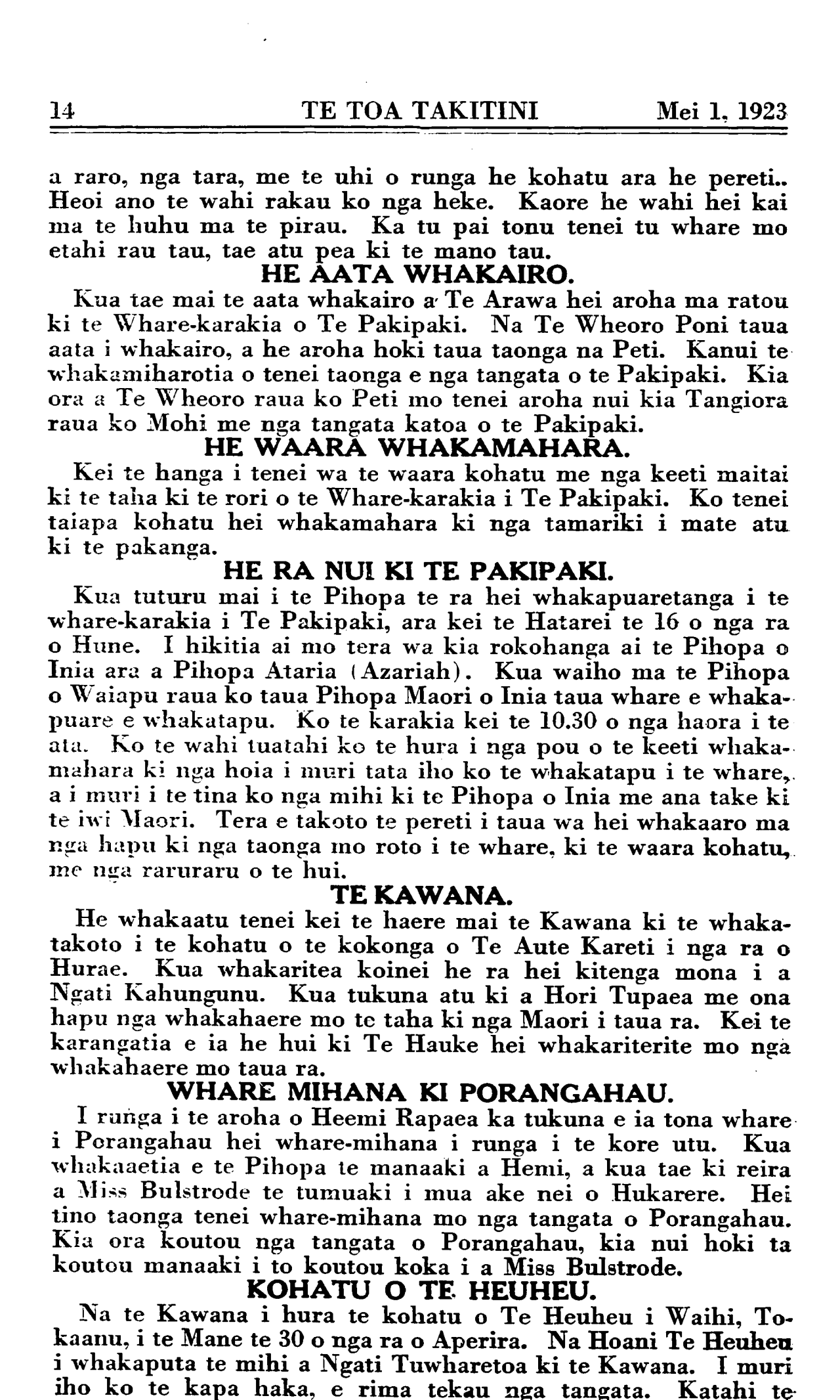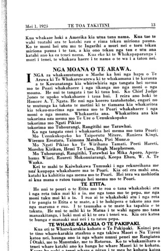 Mei 1. 1923TE TOA TAKITINI 13 Kua whakaae hoki a Amerika kia utua tana nama. Kua tae te wahi tuatahi ara te kotahi rau e rima tekau miriona pauna. Ko te moni hei utu ma te Ingarihi a muri nei e toru tekau miriona pauna i te tau. a kia ono tekau nga tau e utu ana katahi ano ka ea tenei nama. Kua eke ki te Whakapaparanga i muri i tenei, te whakaea haere i te nama o te wa i a tatou nei. NGA MOANA O TE ARAWA. I NGA ra whakamutunga o Maehe ka hui nga hapu o Te Arawa ki Te Whakarewarewa ki te whakamana i te karanga a te Kawanatanga kia whiriwhiria nga tangata hei mema mo te Poari whakahaere i nga tikanga mo nga moni o nga moana. He nui te tangata i tae ki taua hui. Ko Chief Judge Jones te upoko whakahaere i taua hui. I reira ano hoki te Honore A. T. Ngata. He nui nga korero tautohetohe, engari no te mutunga ka takoto te motini ki te tiamana kia whakaritea kia tekau-ma-rima nga mema mo te Poari whakahaere i nga moni o nga moana. Whakaaetia ana. Whakaritea ana kia tokorima nga mema mo Te Ure o Uenukukopako tokorima mo Ngati Pikiao tokorima mo Tuhourangi, Rangitihi me Tarawhai. Ko nga tangata enei i whakaaetia hei mema mo taua Poari: Mo Uenukukopako ko Taiporutu Mitere. Raniera Kingi. Wiremu Ereatara. Taimona Matuha, Piri Munro Mo Ngati Pikiao ko Te Wirihana Tamati. Peeti Hareti, Morehu Kirikau, Hemi Te Uara, Hugh Macpherson. Mo Tuhourangi, Rangitihi, Tarawhai ko Mika Aporo, Apera- hama Wiari. Raureti Mokonuiarangi, Keepa Ehau, W. A. Te Waaka. Kei te mahi te Kaiwhakawa Tumuaki i nga rekureihana me nga* kaupapa whakahaere ma te Poari. Kia oti era mahi ana, katahi ka kahititia nga mema mo te Poari. Hei tera wa mohiotia ai kua mana o ratou tuunga hei mema mo te Poaru TE ETITA. He nui te pouri o te Etita mo te roa o tana whakahoki atu i nga reta tuku mai ki a ia. me nga tono mo te pepa, me nga moni tuku mai ki a ia. I roa ai te whakahoki atu i nga reta i te pangia te Etita e te mate, a i te hohipera e takoto ana mo nga marama e rua. I te taumaha o te mate ka tapahia e te takuta. He nui te mihi ki te Matua i te wahi ngaro mo tana manaakitanga, i hoki mai ai ki te ora i tenei wa. Kia ora katoa te hunga e manaaki mai nei i ta tatou pepa. TE WHARE KARAKIA O TE PAKIPAKI. Kua oti te Whare-karakia kohatu o Te Pakipaki. Koinei pea te tino whare-karakia ataahua o nga takiwa Maori o Nu Tireni katoa nei, haunga ano ia nga whare nunui penei me Rangiatea i Otaki, me to Manutuke, me to Rotorua. Ko te whakamiharo o tenei whare katahi ano ka hanga he whare Maori ki te kohatu.