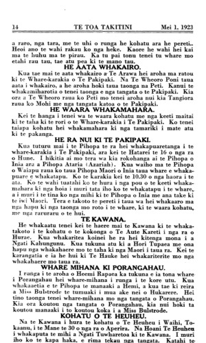 14TE TOA TAKITINI Mei 1, 1923 a raro, nga tara, me te uhi o runga he kohatu ara he pereti. Heoi ano te wahi rakau ko nga heke. Kaore he wahi hei kai ma te huhu ma te pirau. Ka tu pai tonu tenei tu whare mo etahi rau tau, tae atu pea ki te mano tau. HE AATA WHAKAIRO. Kua tae mai te aata whakairo a Te Arawa hei aroha ma ratou ki te Whare-karakia o Te Pakipaki. Na Te Wheoro Poni taua aata i whakairo, a he aroha hoki taua taonga na Peti. Kanui te whakamiharotia o tenei taonga e nga tangata o te Pakipaki. Kia ora a Te Wheoro raua ko Peti mo tenei aroha nui kia Tangiora raua ko Mohi me nga tangata katoa o te Pakipaki. HE WAARA WHAKAMAHARA. Kei te hanga i tenei wa te waara kohatu me nga keeti maitai ki te taha ki te rori o te Whare-karakia i Te Pakipaki. Ko tenei taiapa kohatu hei whakamahara ki nga tamariki i mate atu ki te pakanga. HE RA NUI KI TE PAKIPAKI. Kua tuturu mai i te Pihopa te ra hei whakapuaretanga i te whare-karakia i Te Pakipaki, ara kei te Hatarei te 16 o nga ra o Hune. I hikitia ai mo tera wa kia rokohanga ai te Pihopa o Inia ara a Pihopa Ataria (Azariah). Kua waiho ma te Pihopa o Waiapu raua ko taua Pihopa Maori o Inia taua whare e whaka- puare e whakatapu. Ko te karakia kei te 10.30 o nga haora i te ata. Ko te wahi tuatahi ko te hura i nga pou o te keeti whaka- mahara ki nga hoia i muri tata iho ko te whakatapu i te whare. a i muri i te tina ko nga mihi ki te Pihopa o Inia me ana take ki te iwi Maori. Tera e takoto te pereti i taua wa hei whakaaro ma nga hapu ki nga taonga mo roto i te whare, ki te waara kohatu, me nga raruraru o te hui. TE KAWANA. He whakaatu tenei kei te haere mai te Kawana ki te whaka- takoto i te kohatu o te kokonga o Te Aute Kareti i nga ra o Hurae. Kua whakaritea koinei he ra hei kitenga mona i a Ngati Kahungunu. Kua tukuna atu ki a Hori Tupaea me ona hapu nga whakahaere mo te taha ki nga Maori i taua ra. Kei te karangatia e ia he hui ki Te Hauke hei whakariterite mo nga whakahaere mo taua ra. WHARE MIHANA KI PORANGAHAU. I runga i te aroha o Heemi Rapaea ka tukuna e ia tona whare i Porangahau hei Whare-mihana i runga i te kore utu. Kua whakaaetia e te Pihopa te manaaki a Hemi, a kua tae ki reira a Miss Bulstrode te tumuaki i mua ake nei o Hukarere. Hei tino taonga tenei Whare-mihana mo nga tangata o Porangahau. Kia ora koutou nga tangata o Porangahau, kia nui hoki ta koutou manaaki i to koutou koka i a Miss Bulstrode. KOHATU O TE HEUHEU. Na te Kawana i hura te kohatu o Te Heuheu i Waihi, To- kaanu, i te Mane te 30 o nga ra o Aperira. Na Hoani Te Heuheu i whakaputa te mihi a Ngati Tuwharetoa ki te Kawana. I muri iho ko te kapa haka, e rima tekau nga tangata. Katahi te