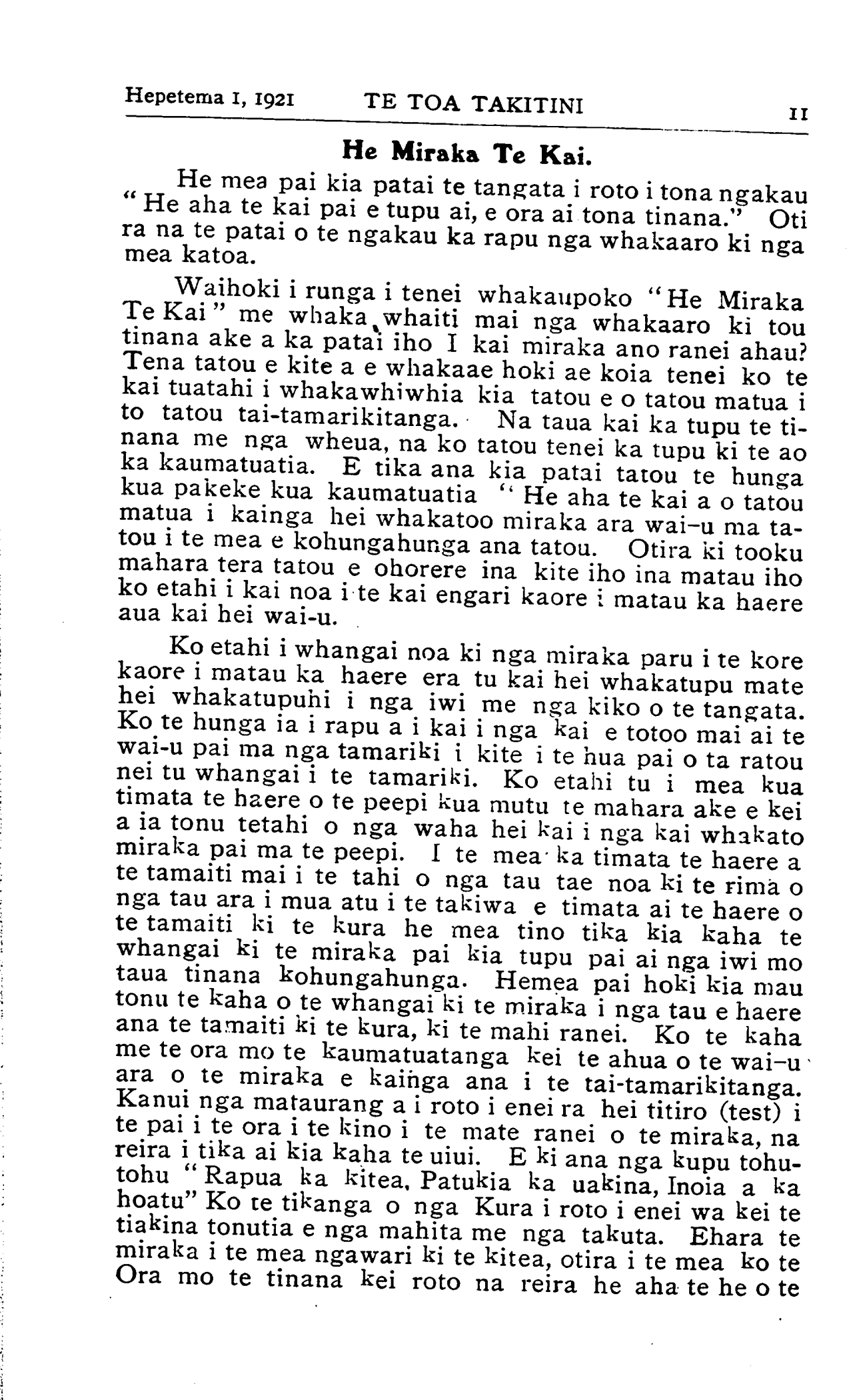 Hepetema 1, 1921TE TOA TAKITINI 11 He Miraka Te Kai. He mea pai kia patai te tangata i roto i tona ngakau " He aha te kai pai e tupu ai, e ora ai tona tinana." Oti ra na te patai o te ngakau ka rapu nga whakaaro ki nga mea katoa. Waihoki i runga i tenei whakaupoko "He Miraka Te Kai" me whaka whaiti mai nga whakaaro ki tou tinana ake a ka patai iho I kai miraka ano ranei ahau? Tena tatou e kite a e whakaae hoki ae koia tenei ko te kai tuatahi i whakawhiwhia kia tatou e o tatou matua i to tatou tai-tamarikitanga. Na taua kai ka tupu te tinana me nga wheua, na ko tatou tenei ka tupu ki te ao ka kaumatuatia. E tika ana kia patai tatou te hunga kua pakeke kua kaumatuatia '' He aha te kai a o tatou matua i kainga hei whakatoo miraka ara wai-u ma tatou i te mea e kohungahunga ana tatou. Otira ki tooku mahara tera tatou e ohorere ina kite iho ina matau iho ko etahi i kai noa i te kai engari kaore i matau ka haere aua kai hei wai-u. Ko etahi i whangai noa ki nga miraka paru i te kore kaore i matau ka haere era tu kai hei whakatupu mate hei whakatupuhi i nga iwi me nga kiko o te tangata. Ko te hunga ia i rapu a i kai i nga kai e totoo mai ai te wai-u pai ma nga tamariki i kite i te hua pai o ta ratou nei tu whangai i te tamariki. Ko etahi tu i mea kua timata te haere o te peepi kua mutu te mahara ake e kei a ia tonu tetahi o nga waha hei kai i nga kai whakato miraka pai ma te peepi. I te mea ka timata te haere a te tamaiti mai i te tahi o nga tau tae noa ki te rima o nga tau ara i mua atu i te takiwa e timata ai te haere o te tamaiti ki te kura he mea tino tika kia kaha te whangai ki te miraka pai kia tupu pai ai nga iwi mo taua tinana kohungahunga. Hemea pai hoki kia mau tonu te kaha o te whangai ki te miraka i nga tau e haere ana te tamaiti ki te kura, ki te mahi ranei. Ko te kaha me te ora mo te kaumatuatanga kei te ahua o te wai-u ara o te miraka e kainga ana i te tai-tamarikitanga. Kanui nga matauranga i roto i enei ra hei titiro (test) i te pai i te ora i te kino i te mate ranei o te miraka, na reira i tika ai kia kaha te uiui. E ki ana nga kupu tohutohu " Rapua ka kitea, Patukia ka uakina, Inoia a ka hoatu" Ko te tikanga o nga Kura i roto i enei wa kei te tiakina tonutia e nga mahita me nga takuta. Ehara te miraka i te mea ngawari ki te kitea, otira i te mea ko te Ora mo te tinana kei roto na reira he aha te he o te