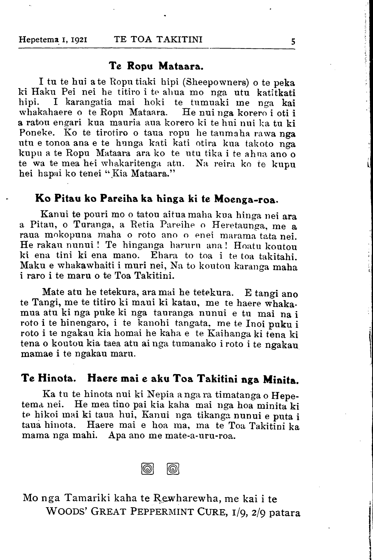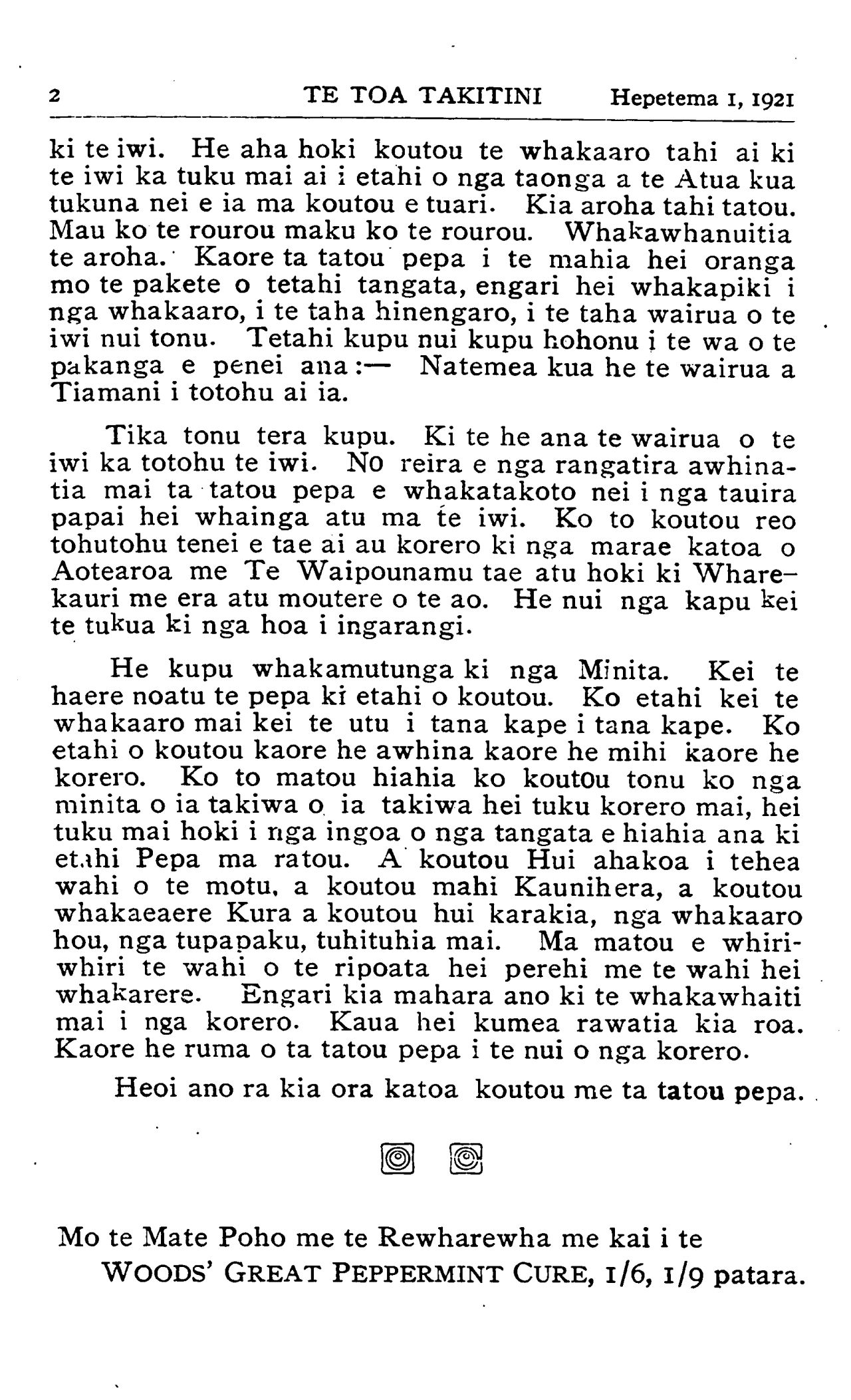2TE TOA TAKITINI Hepetema 1, 1921 ki te iwi. He aha hoki koutou te whakaaro tahi ai ki te iwi ka tuku mai ai i etahi o nga taonga a te Atua kua tukuna nei e ia ma koutou e tuari. Kia aroha tahi tatou. Mau ko te rourou maku ko te rourou. Whakawhanuitia te aroha. Kaore ta tatou pepa i te mahia hei oranga mo te pakete o tetahi tangata, engari hei whakapiki i nga whakaaro, i te taha hinengaro, i te taha wairua o te iwi nui tonu. Tetahi kupu nui kupu hohonu i te wa o te pakanga e penei ana :— Natemea kua he te wairua a Tiamani i totohu ai ia. Tika tonu tera kupu. Ki te he ana te wairua o te iwi ka totohu te iwi. No reira e nga rangatira awhinatia mai ta tatou pepa e whakatakoto nei i nga tauira papai hei whainga atu ma te iwi. Ko to koutou reo tohutohu tenei e tae ai au korero ki nga marae katoa o Aotearoa me Te Waipounamu tae atu hoki ki Wharekauri me era atu moutere o te ao. He nui nga kapu kei te tukua ki nga hoa i ingarangi. He kupu whakamutunga ki nga Minita. Kei te haere noatu te pepa ki etahi o koutou. Ko etahi kei te whakaaro mai kei te utu i tana kape i tana kape. Ko etahi o koutou kaore he awhina kaore he mihi kaore he korero. Ko to matou hiahia ko koutou tonu ko nga minita o ia takiwa o ia takiwa hei tuku korero mai, hei tuku mai hoki i nga ingoa o nga tangata e hiahia ana ki etahi Pepa ma ratou. A koutou Hui ahakoa i tehea wahi o te motu, a koutou mahi Kaunihera, a koutou whakaeaere Kura a koutou hui karakia, nga whakaaro hou, nga tupapaku, tuhituhia mai. Ma matou e whiriwhiri te wahi o te ripoata hei perehi me te wahi hei whakarere. Engari kia mahara ano ki te whakawhaiti mai i nga korero. Kaua hei kumea rawatia kia roa. Kaore he ruma o ta tatou pepa i te nui o nga korero. Heoi ano ra kia ora katoa koutou me ta tatou pepa. Mo te Mate Poho me te Rewharewha me kai i te WOODS' GREAT PEPPERMINT CURE, 1/6,1/9 patara.