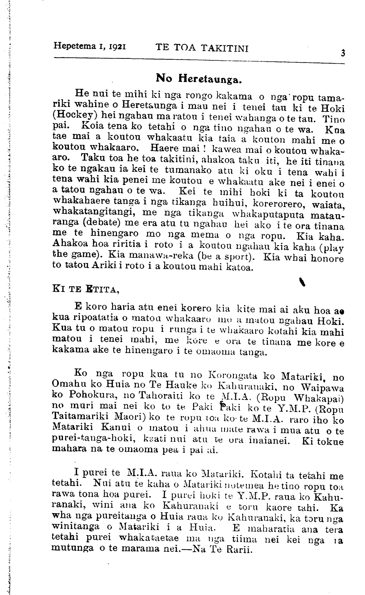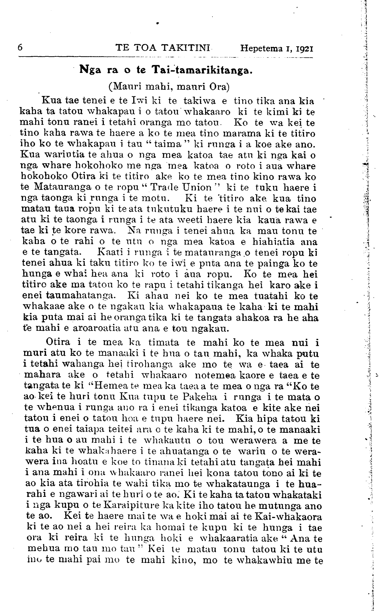 Te Toa Takitini (I tipu ake i roto i Te Kopara) Ko te Kopara na Te Pipi-wharauroa Ko Te Pipi-wharauroa na Te Kupu Whakamarama o te tau 1898. Registered at the G.P.O as a Newspaper. NAMA 2HASTINGS HEPETEMA 1,1921 Ta Tatou Pepa. HE nui nga tangata e tango ana i te Kopara i nga tau ka huri nei i runga i te kore utu. Kaore he utu ki nga Minita. Kaore he utu mo nga Hohipera. Kaore he utu mo nga whare-here-here. Tukuna ai nga pepa ki a ratou hei whakakoakoa ake i a ratou. Tera atu ano hoki tetahi wahanga nui tonu kei te nama ki te pepa. Ko etahi he toru tau e nama ana. Ko etahi kua tae ki te wha tau nuku atu. Kaore e rawe te haere a te Toa Takitini mehema koira "he ahuatanga mo tana kaupapa. No reira he whakaatu tenei koi nei te kape whakamutunga ki nga tangata kua neke atu i te rua tau tuturu ta ratou nama. Kia tere tonu te whakariterite i nga nama mehemea e hiahia ana koutou ki te Toa Takitini kia tae atu ki o koutou marae. Kanui nga kupu whakamihi kua tae mai mo ta tatou pepa. He whakaatu tenei kaore te pepa e ora i te mihi anake. Whakatinanatia mai a koutou mihi mai a koutou mihi i runga i te kaupapa o te whakatauki o te nama tahi: — " Nau ko te rourou, naku ko te rourou, ka ora te manuhiri." He inoi tenei ki te Iwi ki nga tangata whai-moni hoki kia aroha mai ratou ki ta tatou pepa. Mehemea e utua ana matou mo a matou mahi tuhituhi mo te pepa tera noatu te utu. Kei te whakapau matou i to matou taima me o matou nei paku matauranga i runga i te whakaaro nui
