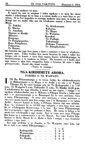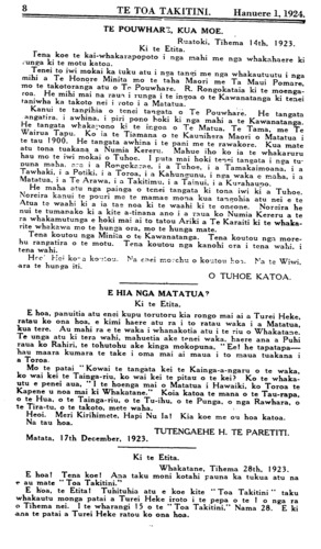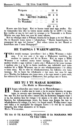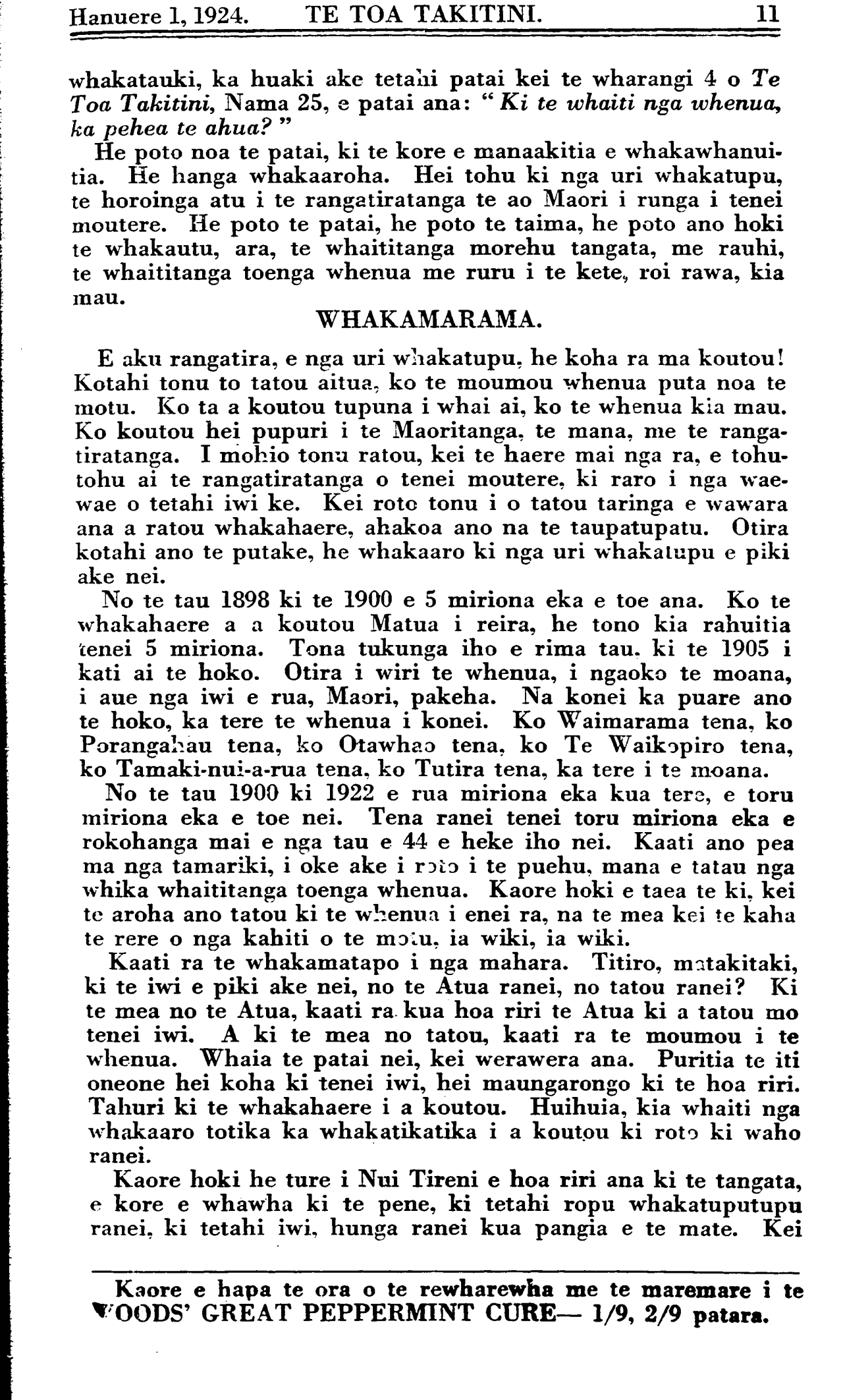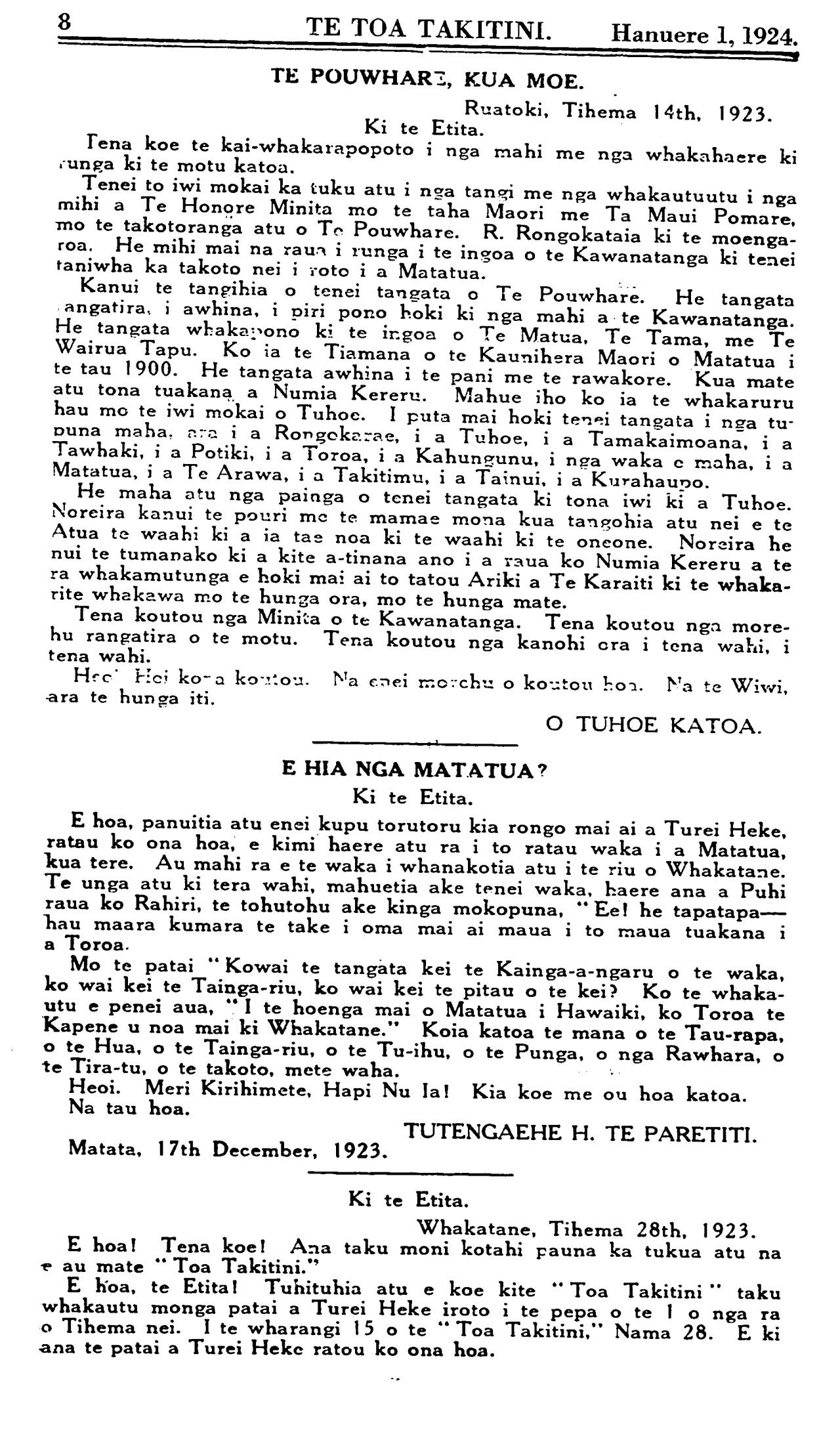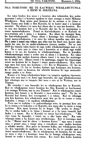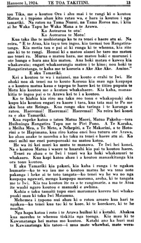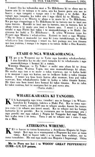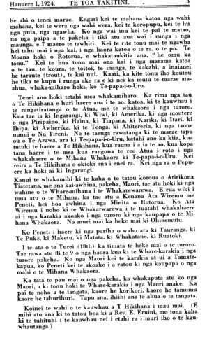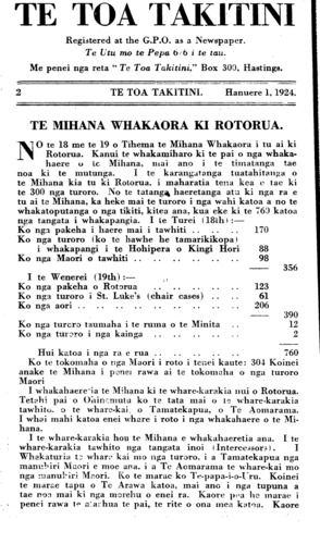 Hanuere 1, 1924. TE TOA TAKITINI. he ahi o tenei marae. Engari kei te mahana katoa nga wahi mahana, kei te wera nga wahi wera, kei te koropupu, kei te hu nga puia, nga ngawha. Ko nga wai inu kei te pai te matao, na nga paipa a te pakeha i tiki atu aua wai i runga i nga maunga, e 7 maero te tawhiti. Kei te rite tonu mai te ngawha hei tahu mai i nga kai, i nga haora katoa o te ra, o te po. Te Moana hoki o Rotorua, e whakataukitia ana, " he omu ka tonu. " Kei te hua tonu mai ona kai i nga marama katoa o te tau, te koura, te toitoi, te inanga, te kakahi, a inaianei he taraute (trout), te kai nui. Kaati, ka kite tonu iho koutou he tika te kupu i runga ake ra e ki nei ka mutu te marae ata- ahua, whaka-miharo hoki, ko Te-papa-i-o-Uru. Tenei ano hoki tetahi mea whakamiharo. Ka rima nga tau o Te Hikihana e huri haere ana i te ao, katoa, ki te kauwhau i te rangatiratanga o te Atua, me te whakaora i nga turoro. Kua tae ia ki Ingarangi, ki Wiwi, ki Amerika, ki nga moutere o nga Piripaino, ki Haina, ki Tiapana, ki Kariki, ki Itari. ki Ihipa, ki Awherika, ki te Tonga, ki Ahitereria. ki nga taone nunui o Nu Tireni. No te taenga rawatanga ki te marae tapu ou o Te Arawa, ara ki Te-papa-i-o-Uru, katahi ano ka kiia, kua tutuki te haere a Te Hikihana, kua rauna i a ia te ao, kua kopa tana haere i te mea kua rangona te reo Atua i roto i nga whakahaere o te Mihana Whakaora ki Te-papa-i-o-Uru. Kei reira a Te Hikihana o okioki ana i enei ra. Kei nga ra o Pepu- ere ka hoki ai ki Ingarangi. Kanui te whakamihi ki te kaha o to tatou koroua o Atirikona Tiatetana, me ona kai-awhina, pakeha, Maori, tae atu hoki ki nga wahine o te Whare-mihana i te Whakarewarewa. E rua wiki i mua atu o te Mihana, ka tae atu a Kenana Ata Wiremu me Peneti, hei hoa awhina i nga Minita o Rotorua. Ko Ata Wiremu i noho ki te Whakarewarewa i te tuatahi whakahaere ai i nga karakia akoako i nga turoro ki nga kaupapa o te Mi- hana Whakaora. No muri mai ka heke mai ki Ohinemutu. Ko Peneti i haere ki nga pariha o waho ara ki Tauranga, ki Te Puke, ki Maketu, ki Matata, ki Whakatane, ki Ruatoki. I te ata o te Turei (18th) ka timata te heke mai o te turoro. Tae rawa atu ki te 9 o nga haora kua ki te Whare-karakia i nga turoro pakeha. Ko nga Maori kei te karakia at ui a Tamate- kapua, ko Peneti kei te akoako i a ratou ki nga kaupapa o nga mahi o te Mihana Whakaora. Ka tata te pau mai o nga pakeha, ka whakaputa atu ko nga Maori, a ki tonu hoki te Whare-karakia i nga Maori anake. Ka pai te noho a te tangata, kaore he korikori, kaore he tamumu kaore he tahurihuri. Tapu ana, ihiihi ana te ahua o te tangata. Koinei te wahi o te kauwhau a T Hikihana i mau mai. (E mihi atu ana ki to tatou hoa ki a Rev. E. Eruini, mo tona kaha ki te tuhituhi i te kauwhau nei i etahi ra i muri iho o te kau- whautanga. )