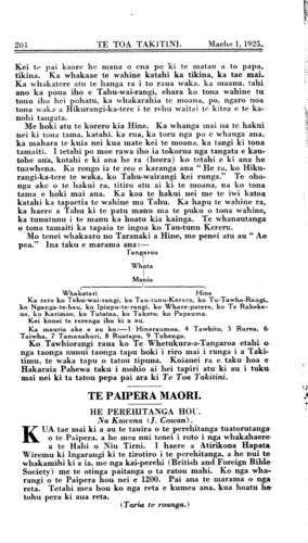 Maehe 1. 1925. TE TOA TAKITINI. \_\_\_\_\_\_\_\_\_\_203 koto ana te wahine ra i runga kirikiri ka mauria ki te kainga, ka moea e ia hei wahine maana. Ka whanau te tamaiti ko Tahu- wai-rangi. ka akona e Hine ki te mahi kai moana. Ka taia e ia he " Koemi"' ara he torehe. Ka akona hoki ki te mahi mounu i runga huapapa. Ka pakeke te tamaiti nei ka haere ki te tuku i tona koemi. E toru nga tukunga mau ake he kohatu, i te takinga kotahi, engari he kanohi o nga kohatu ra e wha- kana tonu ake ana ki tamaiti ra. Katahi ka hoki te tamaiti ra ka koreero atu ki tona whaea kaore he kai i mate i a ia engari he kohatu anake. E toru ona takinga ake e toru ano nga ko- hatu i mau ake. Ka tangi te hakui ra ka ki atu ki tona tamaiti, " Ko o tuakana tonu eena i mate atu ki te moana. Tikina mauria mai ki te kainga nei. Ka haere te tamaiti ra ka mauria mai nga pohatu, ka takaia e te hakui ki te kakahu ka karakiatia ka utaina ki runga i te tuahu ko te nohoanga tena o aua kohatu hei atua ngau tangata e kiia nei i tenei ra ko Po- hatu. Me whakamarama ake i konei nga inana o enei atua: — Kaore e rongo enei mate a Pohatu-te-tahuri me Pohatu-te-take, ma te tikina ra ano i te rimu rehia i te rimu ko-tau ka uta ki runga i te umu e mahia ai te turoro. Ka rongo a Pohatu Whakarongo mehemea ki te pakuru- kurutia nga pohatu i ata karakiatia ki te wahi e paongia ana e te mate. Kaati ake mo tena wahi. Ka tupu a Tahu-wai-rangi hei tangata nui. ka whakahautia e tona koka e Hine kia hangaia he waka atahua mo tona taina. ka tapaiana te ingoa ko Hikurangii- ka-tere. Ka tae ki te ra o Tangaroa-a-mua ka tonoa e te hakui ra tona tamu kia haere ki te moana. Maanu rawa te waka, katahi ano ka ki atu. "' E Tahu ina taonga tapu a to matua a Whakatari te matau-rongo nui a Whetu-kura-a-Tangaroa. i hunaia nei e Rahuru. i mate ai matou ko o tuaakana ki te moana. Kaati kua u mai nei o tuaa- kana i a koe ki uta. ina. haere kia pai to whakahaere i te taonga a to matua hei oranga mou me ou uri i muri i koe. " Kaore i roa te maanutanga atu o te waka nei kua hoki mai, ki tonu i te ika. I ia ra i ia ra pera tonu te mahi, ka hau te rongo o te mahi a Tahu-wai-rangi. ka hui mai nga iwi kia kite me te whakamiharo. I teetahi ra ka tere nga waka nui atu. Ka kai te ika ki ta Tahu, ka kore ki ta etahi. E tiu ana. e rona ana te ika i te matau a Tahu, te korikori a etahi, ki pahaehae era waka, katahi kaapititia mai era waka ka piri ki to Tahu ka tangohia te taonga ra. ka panga atu a Tahu-ro-te-wai. ka hoe te iwi nei ki o ratou tauranga. Te pueatanga ake o Tahu, ka karakia kia mauria ia ki uta. Ka tae mai tona ariki I kei te ngaro te ingoa ka u a Tahu ki uta. He roa nga ra e whaka- tata ana u Tahu ki te kainga kei reira nei te iwi na ratou te mahi kino nei. ka tae ki tona ra ka kitea ia e tetahi wahine, ka moea hei tana maana. Tupono te wahine nei he tamahine na te tangata kei ia nei te matau. Ka tono a Tahu kia haere raua ko tona wahine ki te hi ika. Kua tar tenei kei nga po korekore. Ka ki atu te wahine. E ta. he korekore ra enei po. "