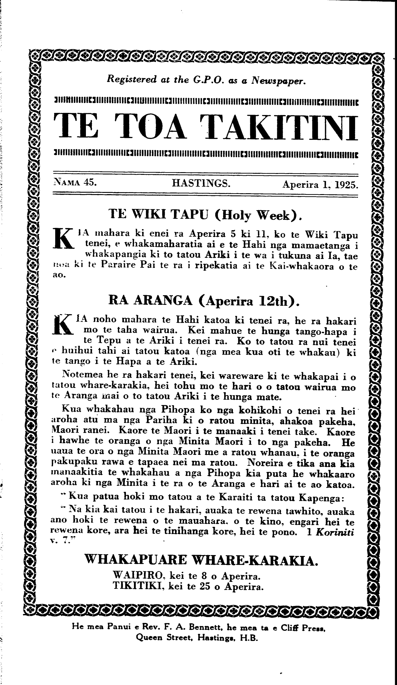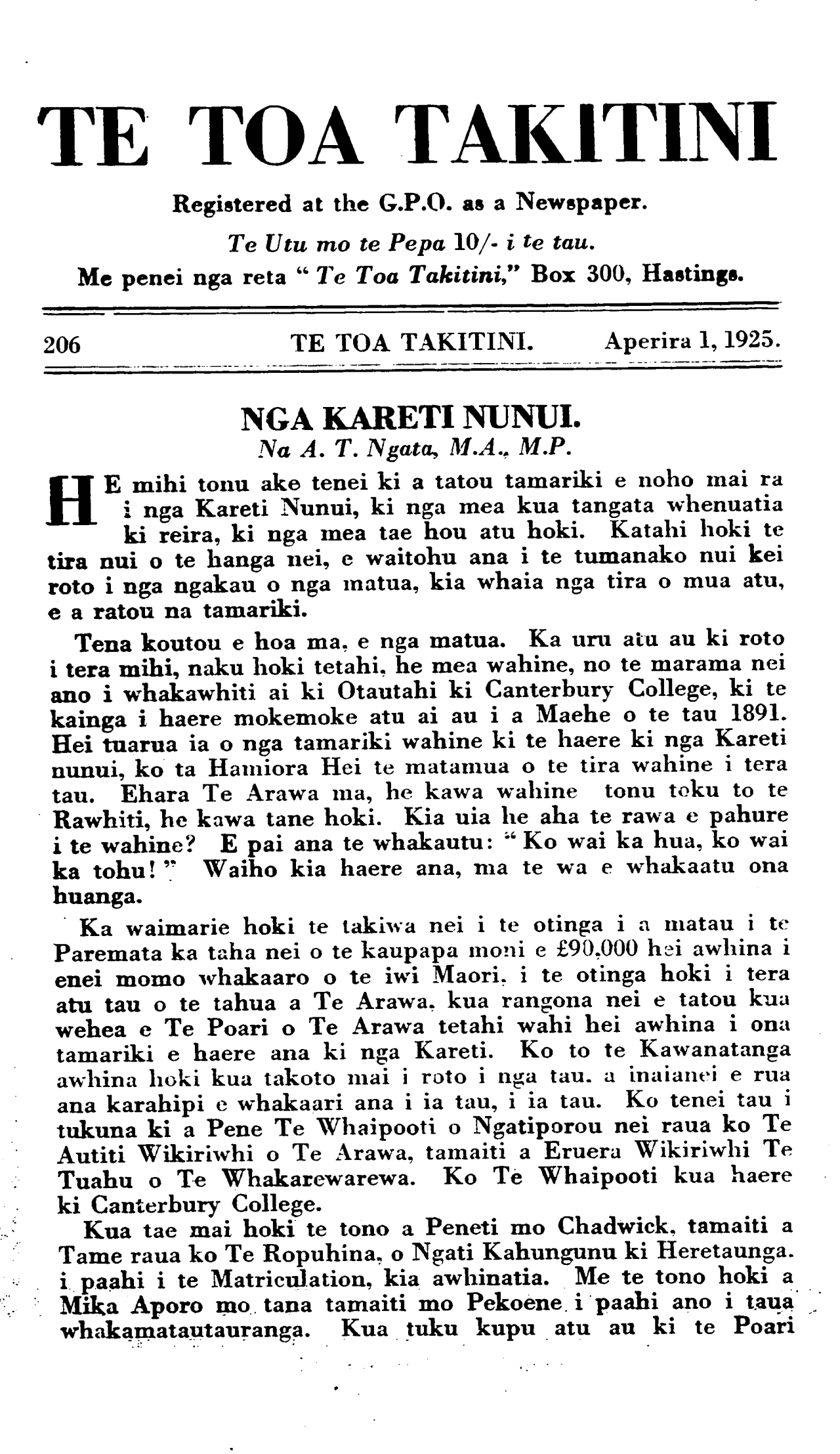 206 TE TOA TAKITINI. Aperira 1, 1925.