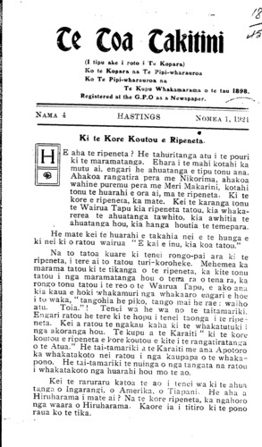 NAMA 4 18 Te Toa Takitini (I tipu ake i roto i Te Kopara) Ko te Kopara na Te Pipi-wharauroa Ko Te Pipi-wharauroa na Te Kupu Whakamarama o te tau 1898. Registered at the G.P.O as a Newspaper. HASTINGS NOMEA 1, Ki te Kore Koutou e Ripeneta. HE aha te ripeneta ? He tahuritanga atu i te pouri ki te maramatanga. Ehara i te mahi kotahi ka mutu ai, engari he ahuatanga e tipu tonu ana. Ahakoa rangatira pera me Nikorima, ahakoa wahine puremu pera me Meri Makarini, kotahi tonu te huarahi e ora ai, ma te ripeneta. Ki te kore e ripeneta, ka mate. Kei te karanga tonu te Wairua Tapu kia ripeneta tatou, kia whakarerea te ahuatanga tawhito, kia awhitia te ahuatanga hou, kia hanga houtia te temepara. He mate kei te huarahi e takahia nei e te hunga e ki nei ki o ratou wairua " E kai e inu, kia koa tatou." Na to tatoa kuare ki tenei rongo-pai ara ki te ripeneta, i tere ai to tatou turi-koroheke. Mehemea ka marama tatou ki te tikanga o te ripeneta, ka kite tonu tatou i nga maramatanga hou o tena ra o tena ra, ka rongo tonu tatou i te reo o te Wairua Tapu, e ako ana kia kaua e hoki whakamuri nga whakaaro engari e hoe i to waka, " tangohia he piko, tango mai he rae : waiho atu. Toia."! Tenei wa he wa no te taitamariki. Engari ratou he tere ki te hopu i tenei taonga i te ripeneta. Kei a ratou te ngakau kaha ki te whakatutuki i nga akoranga hou. Te kupu a te Karaiti " ki te kore koutou e ripeneta e kore koutou e kite i te rangatiratanga o te Atua." He tai-tamariki a te Karaiti me ana Apotoro ka whakatakoto nei ratou i nga kaupapa o te whakapono. He tai-tamariki te nuinga o nga tangata na ratou i whakatakoto nga huarahi hou mo te ao. Kei te raruraru katoa te ao i tenei wa ki te ahua ta.nga o Ingarangi, o Amerika, o Tiapani. He aha a Hiruharama i mate ai ? Na te kore ripeneta, ka ngahoro nga waara o Hiruharama. Kaore ia i titiro ki te pono raua ko te tika.