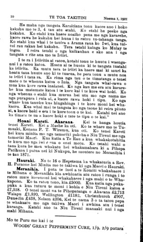 10TE TOA TAKITINI Noema I, 1921 He maha nga tangata Karaitiana tonu kaore ano i hoko kakahu mo te 3, 4 tau atu etahi. Ko etahi he peeke nga kakahu. Ko etahi kua haere noaiho pena me nga kararehe, kaore rawa he kakahu hei huna i to ratou tu-tahanga tanga. Ko etahi kua whai i te tauira a Arama raua ko Iwi, kua tuitui rau rakau hei kakahu. Tera tetahi kainga ko Mulay te ingoa. I reira tetahi o nga kaikauhau e ako ana i nga tangata e rite ana mo te Iriiri. I te ra i Iriiritia ai ratou, kotahi tonu te huutu i waenganui i a ratou katoa. Hoatu ai te huutu ki te tangata tuatahi ka iriirita. Ka mutu tera te iriiri ka haere mai ki muri ka hoatu taua huutu ano ki te tuarua, he pera tonu a mutu noa te iriiri i taua ra. Ka rima nga tau o te timatanga o tenei mate o te whenua katoa o Inia. Nga tangata whai-rawa o mua kua kore rawa inaianei. Ko nga kau me era atu kararehe kua matemate katoa i te kore kai i te kore wai hoki. Ko nga whenua o etahi kua murua hei utu mo nga nama me nga purapura i ruia ai, a kaore rawa hoki i tipu. Ko nga whare kua tanuku kua hingahinga i te kore moni hei whakaora. Kua whai mai te tangata ko nga taone ki reira pitoto ai, a kaore hoki e ora i te kore tonu o te kai. Katahi nei ano ka timata te ua a kaore hoki e tere te tipu o te kai." Hoani Kareti. Akarana. Kei te hanga houtia tenei Kareti. Kei a Maehe ka oti. Ko te whare mo te Tumuaki, Kenana P. T. Wiremu, kua oti. Ko tenei Kareti hei kura minita mo nga tamariki pakeha o Niu Tireni me nga tamariki Maori. Kua katia a Te Rau a kua whakakotahitia te kura mo nga iwi e rua o enei motu. Ko tetahi wahi o taua kura he mea whakatu hei whakamahara ki a Pihopa Patihana i patua nei ki Nukapu, he moutere no Meranihia i te tau 1871. Hauraki. No te 16 o Hepetema ka whakaturia a Rev. H. Paraone hei Minita mo te takiwa ki nga Maori o Hauraki. Meranihia. I puta te inoi a te Komiti whakahaere i te Mihana o Meranihia kia awhinatia atu ratou i runga i to ratou mate koremoni hei whakahaere i nga mahi o te Whakapono. Ko ta ratou tono, kia £5000. Kua katia nga pukapuka a kua tuturu te moni i kohia e Niu Tireni katoa e £7,338. O tenei moni na te Pihopatanga o Akarana £2,713 Waiapu £1,890, Wellington £1182, Christchurch £907, Dunedin £438, Nelson £206, Kei te nama 3 o ta tatou pepa te whakaatu mo nga takiwa Maori i awhina atu i tenei karanga. Katahi ano ta Niu Tireni manaaki nui i nga mahi Mihana. Mo te Puru me kai i te WOODS' GREAT PEPPERMINT CURE, 1/9, 2/9 patara