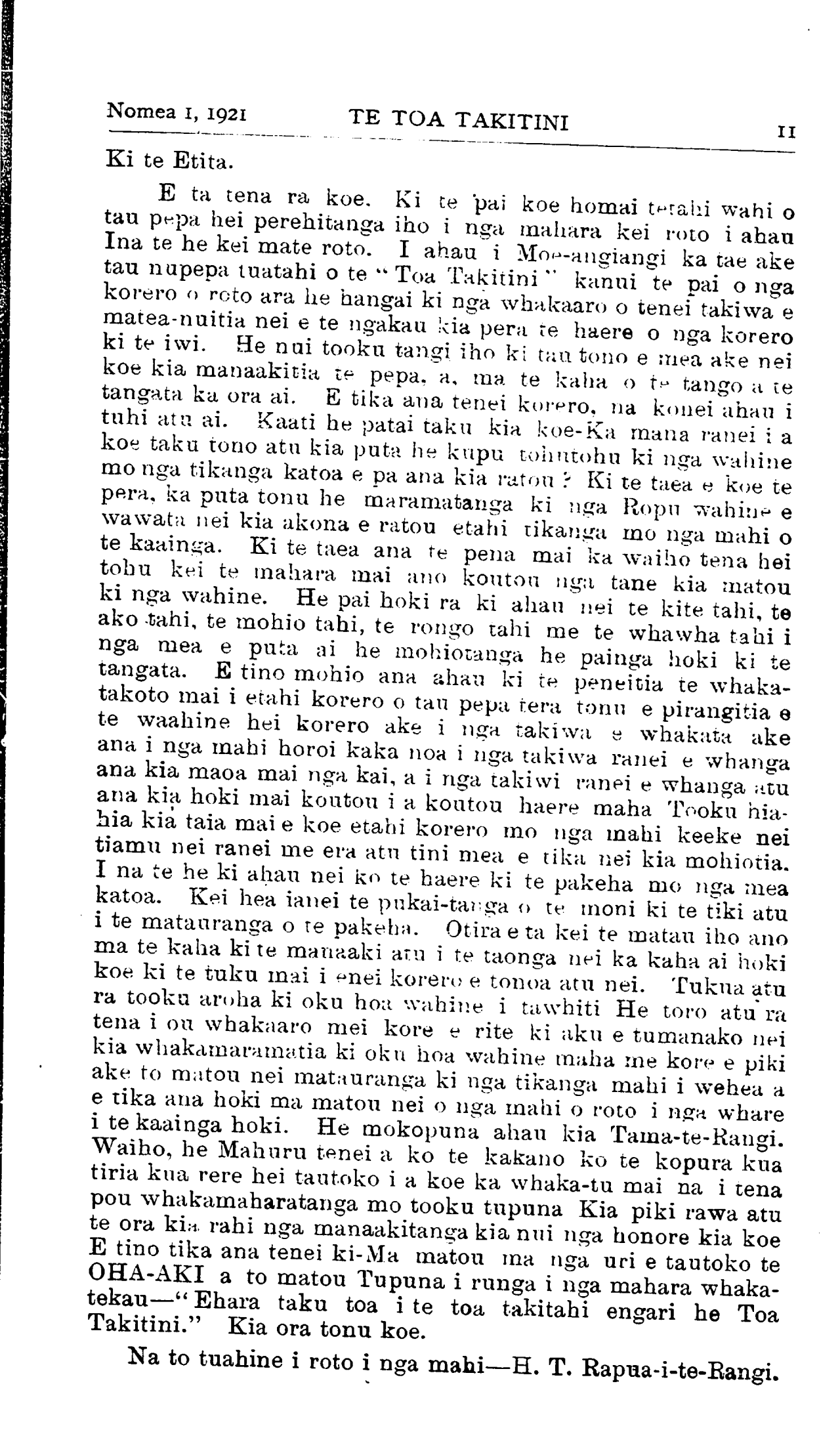 Nomea 1, 1921TE TOA TAKITINI 11 Ki te Etita. E ta tena ra koe. Ki te pai koe homai tetahi wahi o tau pepa hei perehitanga iho i nga mahara kei roto i ahau Ina te he kei mate roto. I ahau i Moe-angiangi ka tae ake tau nupepa tuatahi o te " Toa Takitini " kanui te pai o nga korero o roto ara he hangai ki nga whakaaro o tenei takiwa e matea-nuitia nei e te ngakau kia pera re haere o nga korero ki te iwi. He nui tooku tangi iho ki tau tono e mea ake nei koe kia manaakitia te pepa, a, ma te kaha o te tango a te tangata ka ora ai. E tika ana tenei korero, na konei ahau i tuhi ata ai. Kaati he patai taku kia koe Ka mana ranei i a koe taku tono atu kia puta he kupu tohutohu ki nga wahine mo nga tikanga katoa e pa ana kia ratou ? Ki te taea e koe te pera, ka puta tonu he maramatanga ki nga Ropu wahine e wawata nei kia akona e ratou etahi tikanga mo nga mahi o te kaainga. Ki te taea ana te pena mai ka waiho tena hei tohu kei te mahara mai ano koutou nga tane kia matou ki nga wahine. He pai hoki ra ki ahau nei te kite tahi, te ako -tahi, te mohio tahi, te rongo tahi me te whawha tahi i nga mea e puta ai he mohiotanga he painga hoki ki te tangata. E tino mohio ana ahau ki te peneitia te whakatakoto mai i etahi korero o tau pepa tera tonu e pirangitia e te waahine hei korero ake i nga takiwa a whakata ake ana i nga mahi horoi kaka noa i nga takiwa ranei e whanga ana kia maoa mai nga kai, a i nga takiwi ranei e whanga atu ana kia hoki mai koutou i a koutou haere maha Tooku hiahia kia taia mai e koe etahi korero mo nga mahi keeke nei tiamu nei ranei me era atu tini mea e tika nei kia mohiotia. I na te he ki ahau nei ko te haere ki te pakeha mo nga mea katoa. Kei hea ianei te pukai-tanga o te moni ki te tiki atu i te matauranga o te pakeha. Otira e ta kei te matau iho ano ma te kaha ki te manaaki atu i te taonga nei ka kaha ai hoki koe ki te tuku mai i enei korero e tonoa atu nei. Tukua atu ra tooku aroha ki oku hoa wahine i tawhiti He toro atu ra tena i ou whakaaro mei kore e rite ki aku e tumanako nei kia whakamaramatia ki oku hoa wahine maha me kore e piki ake to matou nei matauranga ki nga tikanga mahi i wehea a e tika ana hoki ma matou nei o nga mahi o roto i nga whare i te kaainga hoki. He mokopuna ahau kia Tama-te-Rangi. Waiho, he Mahuru tenei a ko te kakano ko te kopura kua tiria kua rere hei tautoko i a koe ka whaka-tu mai na i tena pou whakamaharatanga mo tooku tupuna Kia piki rawa atu te ora kia rahi nga manaakitanga kia nui nga honore kia koe E tino tika ana tenei ki-Ma matou ma nga uri e tautoko te OHA-AKI a to matou Tupuna i runga i nga mahara whakatekau—" Ehara taku toa i te toa takitahi engari he Toa Takitini." Kia ora tonu koe. Na to tuahine i roto i nga mahi—H. T. Rapua-i-te-Rangi.