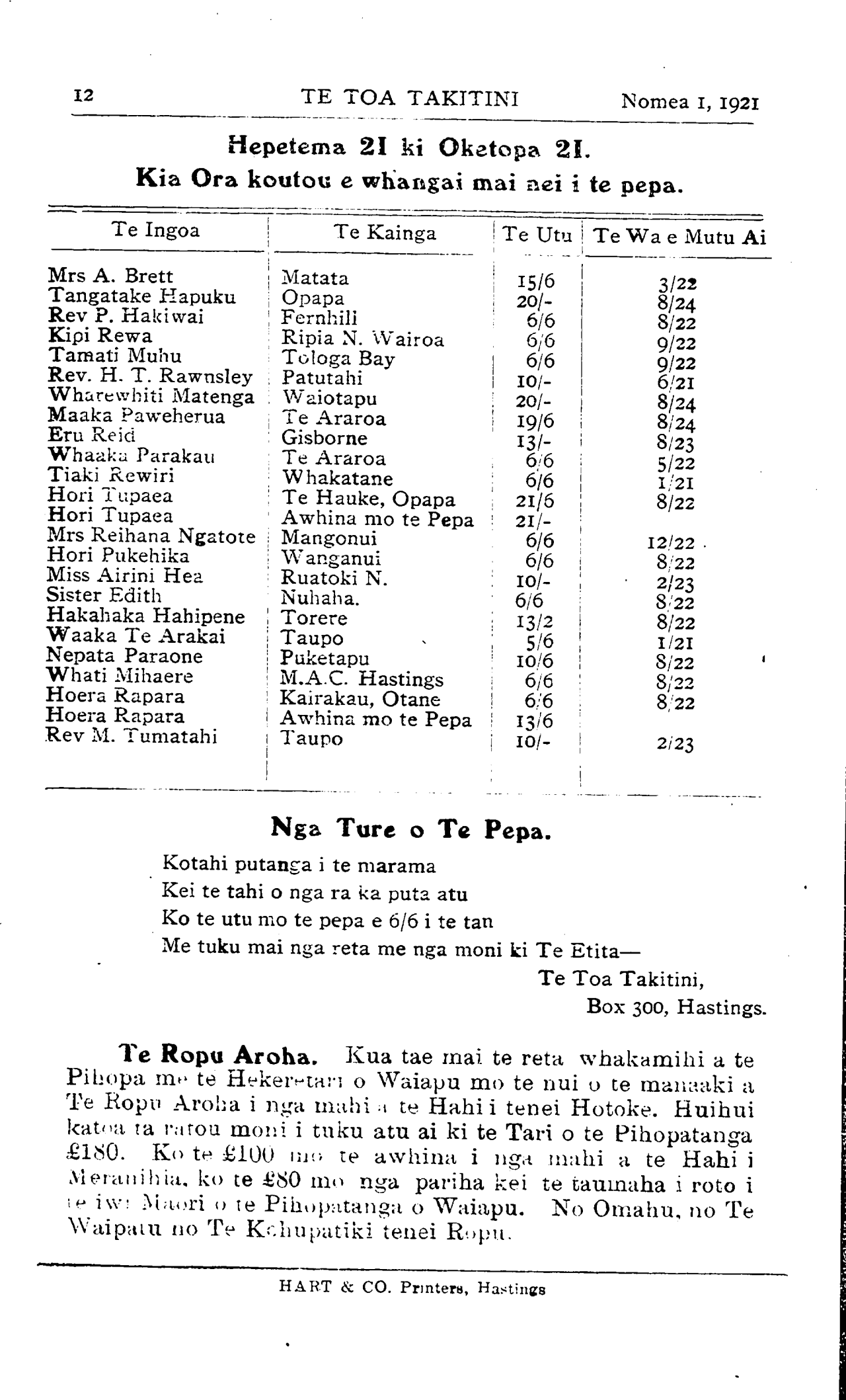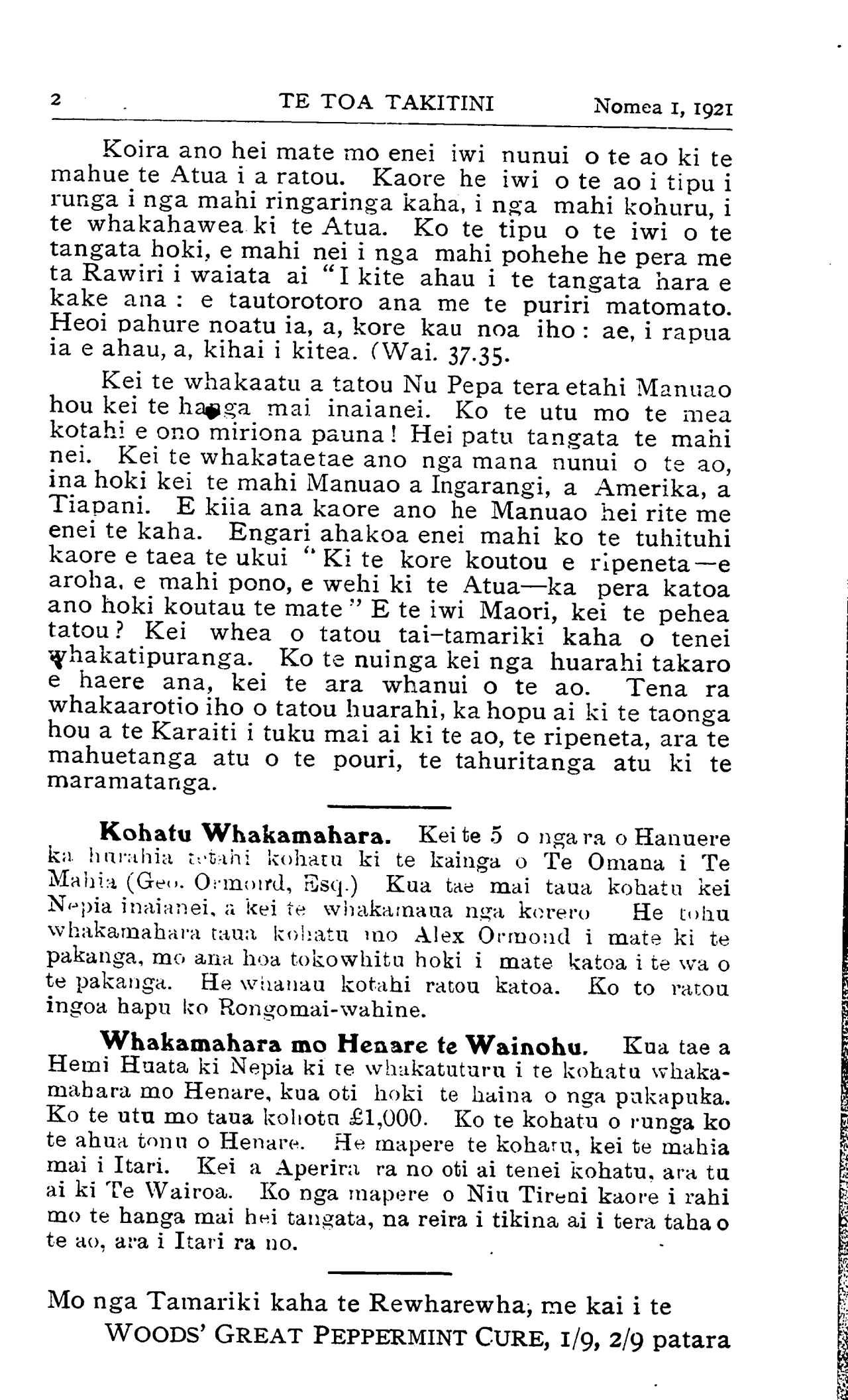 2. TE TOA TAKITINI Nomea 1, 1921 Koira ano hei mate mo enei iwi nunui o te ao ki te mahue te Atua i a ratou. Kaore he iwi o te ao i tipu i runga i nga mahi ringaringa kaha, i nga mahi kohuru, i te whakahawea ki te Atua. Ko te tipu o te iwi o te tangata hoki, e mahi nei i nga mahi pohehe he pera me ta Rawiri i waiata ai "I kite ahau i te tangata hara e kake ana : e tautorotoro ana me te puriri matomato. Heoi pahure noatu ia, a, kore kau noa iho : ae, i rapua ia e ahau, a, kihai i kitea. (Wai. 37.35. Kei te whakaatu a tatou Nu Pepa tera etahi Manuao hou kei te hanga mai. inaianei. Ko te utu mo te mea kotahi e ono miriona pauna! Hei patu tangata te mahi nei. Kei te whakataetae ano nga mana nunui o te ao, ina hoki kei te mahi Manuao a Ingarangi, a Amerika, a Tiapani. E kiia ana kaore ano he Manuao hei rite me enei te kaha. Engari ahakoa enei mahi ko te tuhituhi kaore e taea te ukui " Ki te kore koutou e ripeneta—e aroha, e mahi pono, e wehi ki te Atua—ka pera katoa ano hoki koutau te mate " E te iwi Maori, kei te pehea tatou ? Kei whea o tatou tai-tamariki kaha o tenei whakatipuranga. Ko te nuinga kei nga huarahi takaro e haere ana, kei te ara whanui o te ao. Tena ra whakaarotio iho o tatou huarahi, ka hopu ai ki te taonga hou a te Karaiti i tuku mai ai ki te ao, te ripeneta, ara te mahuetanga atu o te pouri, te tahuritanga atu ki te maramatanga. Kohatu Whakamahara. Kei te 5 o nga ra o Hanuere ka. hurahia tetahi kohatu ki te kainga o Te Omana i Te Mahia (Geo. Ormond, Esq.) Kua tae mai taua kohatu kei Nepia inaianei, a kei te whakamaua nga korero He tohu whakamahara taua kohatu mo Alex Ormond i mate ki te pakanga, mo ana hoa tokowhitu hoki i mate katoa i te wa o te pakanga. He whanau kotahi ratou katoa. Ko to ratou ingoa hapu ko Rongomai-wahine. Whakamahara mo Henare te Wainohu. Kua tae a Hemi Huata ki Nepia ki te whakatuturu i te kohatu whakamahara mo Henare, kua oti hoki te haina o nga pukapuka. Ko te utu mo taua kohatu £1,000. Ko te kohatu o runga ko te ahua tonu o Henare. He mapere te kohatu, kei te mahia mai i Itari. Kei a Aperira ra no oti ai tenei kohatu, ara tu ai ki Te Wairoa. Ko nga mapere o Niu Tireni kaore i rahi mo te hanga mai hei tangata, na reira i tikina ai i tera taha o te ao, ara i Itari ra no. Mo nga Tamariki kaha te Rewharewha, me kai i te WOODS' GREAT PEPPERMINT CURE, 1/9, 2/9 patara