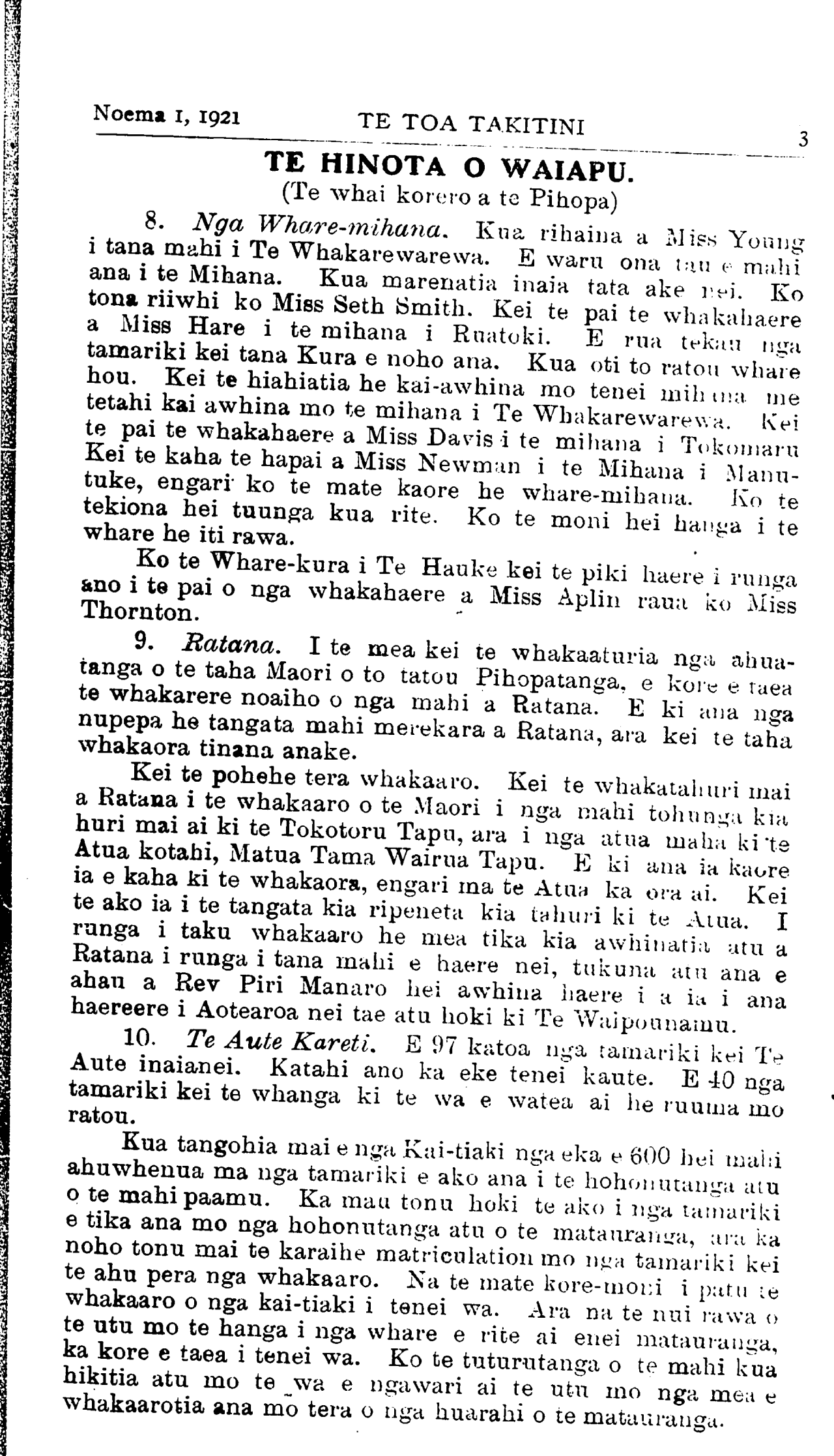 Noema 1, 1921TE TOA TAKITINI TE HINOTA O WAIAPU. (Te whai korero a te Pihopa) 8. Nga Whare-mihana, Kua rihaina a Miss Young i tana mahi i Te Whakarewarewa. E waru ona tau e mahi ana i te Mihana. Kua marenatia inaia tata ake nei. Ko tona riiwhi ko Miss Seth Smith. Kei te pai te whakahaere a Miss Hare i te mihana i Ruatoki. E rua tekau nga tamariki kei tana Kura e noho ana. Kua oti to ratou whare hou. Kei te hiahiatia he kai-awhina mo tenei mihama me tetahi kai awhina mo te mihana i Te Whakarewarewa. Kei te pai te whakahaere a Miss Davis i te mihana i Tokomaru Kei te kaha te hapai a Miss Newman i te Mihana i Manutuke, engari ko te mate kaore he Whare-mihana. Ko te tekiona hei tuunga kua rite. Ko te moni hei hanga i te whare he iti rawa. Ko te Whare-kura i Te Hauke kei te piki haere i runga ano i te pai o nga whakahaere a Miss Aplin raua ko Miss Thornton. 9. Ratana. I te mea kei te whakaaturia nga ahuatanga o te taha Maori o to tatou Pihopatanga, e kore e taea te whakarere noaiho o nga mahi a Ratana. E ki ana nga nupepa he tangata mahi merekara a Ratana, ara kei te taha whakaora tinana anake. Kei te pohehe tera whakaaro. Kei te whakatahuri mai a Ratana i te whakaaro o te Maori i nga mahi tohunga kia huri mai ai ki te Tokotoru Tapu, ara i nga atua maha ki te Atua kotahi, Matua Tama Wairua Tapu. E ki ana ia kaore ia e kaha ki te whakaora, engari ma te Atua ka ora ai. Kei te ako ia i te tangata kia ripeneta kia tahuri ki te Atua. I runga i taku whakaaro he mea tika kia awhinatia utu a Ratana i runga i tana mahi e haere nei, tukuna atu ana e ahau a Rev Piri Manaro hei awhina haere i a ia i ana haereere i Aotearoa nei tae atu hoki ki Te Waipounamu. 10. Te Aute Kareti. E 97 katoa nga tamariki kei Te Aute inaianei. Katahi ano ka eke tenei kaute. E 40 nga tamariki kei te whanga ki te wa e watea ai he ruuma mo ratou. Kua tangohia mai e nga Kai-tiaki nga eka e 600 hei maid ahuwhenua ma nga tamariki e ako ana i te hohonutanga atu o te mahi paamu. Ka mau tonu hoki te ako i nga tamariki e tika ana mo nga hohonutanga atu o te matauranga, ara ka noho tonu mai te karaihe matriculation mo nga tamariki kei te ahu pera nga whakaaro. Na te mate kore-moni i patu te whakaaro o nga kai-tiaki i tenei wa. Ara na te nui rawa o te utu mo te hanga i nga whare e rite ai enei matauranga, ka kore e taea i tenei wa. Ko te tuturutanga o te mahi kua hikitia atu mo te wa e ngawari ai te utu mo nga mea e whakaarotia ana mo tera o nga huarahi o te matauranga.