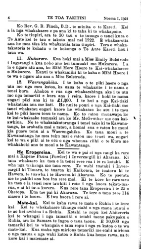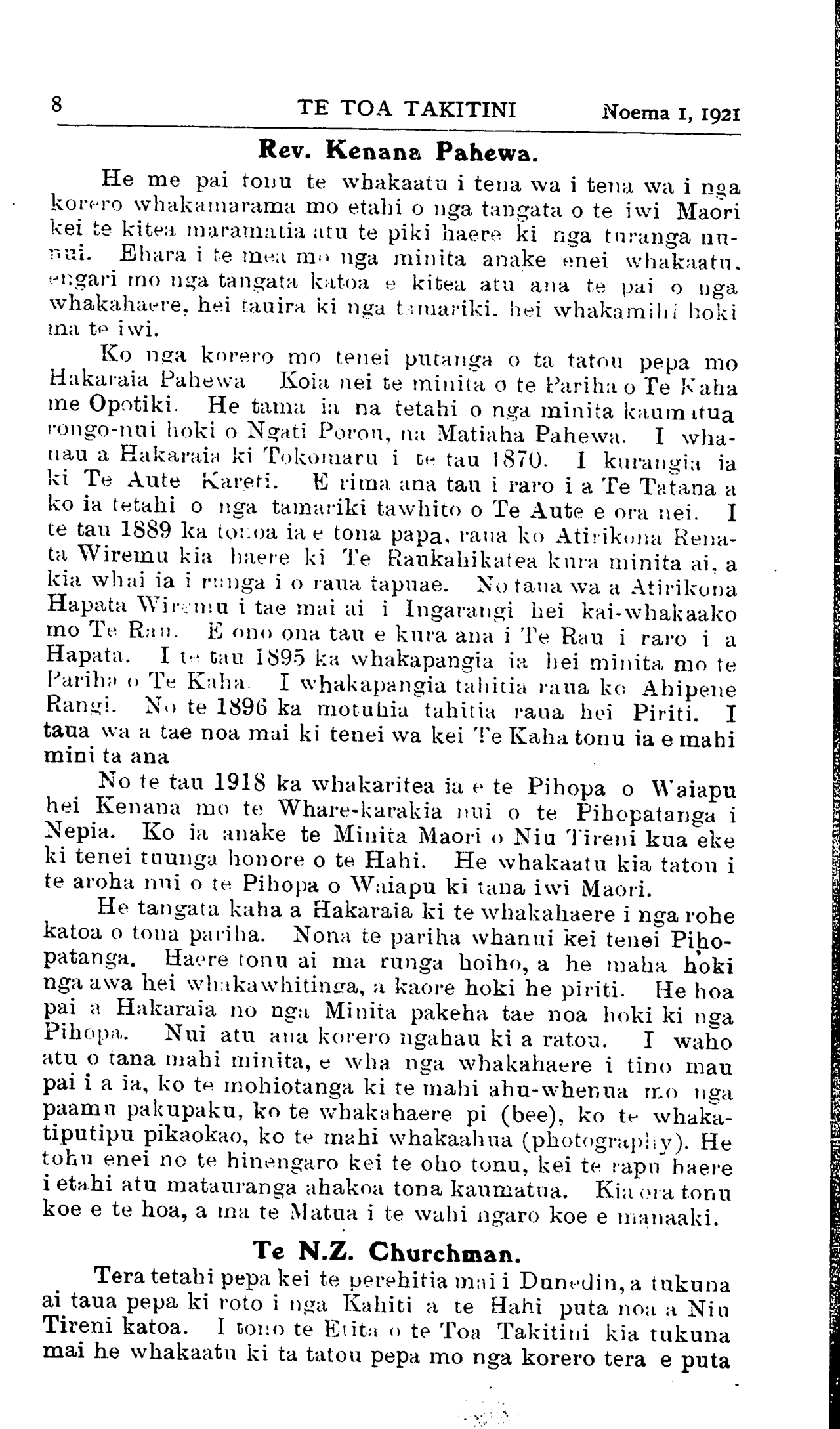 8TE TOA TAKITINI Noema 1, 1921 Rev. Kenana Pahewa. He me pai tonu te whakaatu i tena wa i tena wa i nga korero whakamarama mo etahi o nga tangata o te iwi Maori kei te kitea maramatia atu te piki haere ki nga turanga nunui. Ehara i te mea mo nga minita anake enei whakaatu. engari mo nga tangata katoa e kitea atu ana te pai o nga whakahaere, hei tauira ki nga tamariki hei whakamihi hoki ma te iwi. Ko nga korero mo tenei putanga o ta tatou pepa mo Hakaraia Pahewa Koia nei te minita o te Pariha o Te Kaha me Opotiki. He tama ia na tetahi o nga minita kaumatua rongo-nui hoki o Ngati Porou, na Matiaha Pahewa. I whanau a Hakaraia ki Tokomaru i te tau 1870- I kurangia ia ki Te Aute Kareti. E rima ana tau i raro i a Te Tatana a ko ia tetahi o nga tamariki tawhito o Te Aute e ora nei. I te tau 1889 ka tonoa ia e tona papa, raua ko Atirikona Renata Wiremu kia haere ki Te Raukahikatea kura minita ai. a kia whai ia i runga i o raua tapuae. No tana wa a Atirikona Hapata Wiremu i tae mai ai i Ingarangi hei kai-whakaako mo Te Rau. E ono ona tau e kura ana i Te Rau i raro i a Hapata. I te tau 1895 ka whakapangia ia hei minita mo te Pariha o Te Kaha. I whakapangia tahitia raua ko Ahipene Rangi. No te 1896 ka motuhia tahitia raua hei Piriti. I taua wa a tae noa mai ki tenei wa kei Te Kaha tonu ia e mahi mini ta ana No te tau 1918 ka whakaritea ia e te Pihopa o Waiapu hei Kenana mo te Whare-karakia nui o te Pihopatanga i Nepia. Ko ia anake te Minita Maori o Niu Tireni kua eke ki tenei tuunga honore o te Hahi. He whakaatu kia tatou i te aroha nui o te Pihopa o Waiapu ki tana iwi Maori. He tangata kaha a Hakaraia ki te whakahaere i nga rohe katoa o tona pariha. Nona te pariha whanui kei tenei Pihopatanga. Haere tonu ai ma runga hoiho, a he inaha hoki nga awa hei whakawhitinga, a kaore hoki he piriti. He hoa pai a Hakaraia no nga Minita pakeha tae noa hoki ki nga Pihopa. Nui atu ana korero ngahau ki a ratou. I waho atu o tana mahi minita, e wha nga whakahaere i tino mau pai i a ia, ko te mohiotanga ki te mahi ahu-whenua mo nga paamu pakupaku, ko te whakahaere pi (bee), ko te whakatiputipu pikaokao, ko te mahi whakaahua (photography). He tohu enei no te hinengaro kei te oho tonu, kei te rapu haere i etahi atu matauranga ahakoa tona kaumatua. Kia ora tonu koe e te hoa, a ma te Matua i te wahi ngaro koe e manaaki. Te N.Z. Churchman. Tera tetahi pepa kei te perehitia mai i Dunedin,a tukuna ai taua pepa ki roto i nga Kahiti a te Hahi puta noa a Niu Tireni katoa. I tono te Etita o te Toa Takitini kia tukuna mai he whakaatu ki ta tatou pepa mo nga korero tera e puta