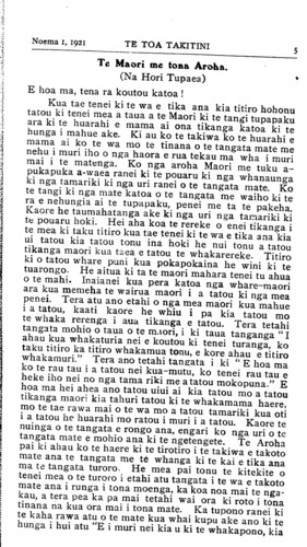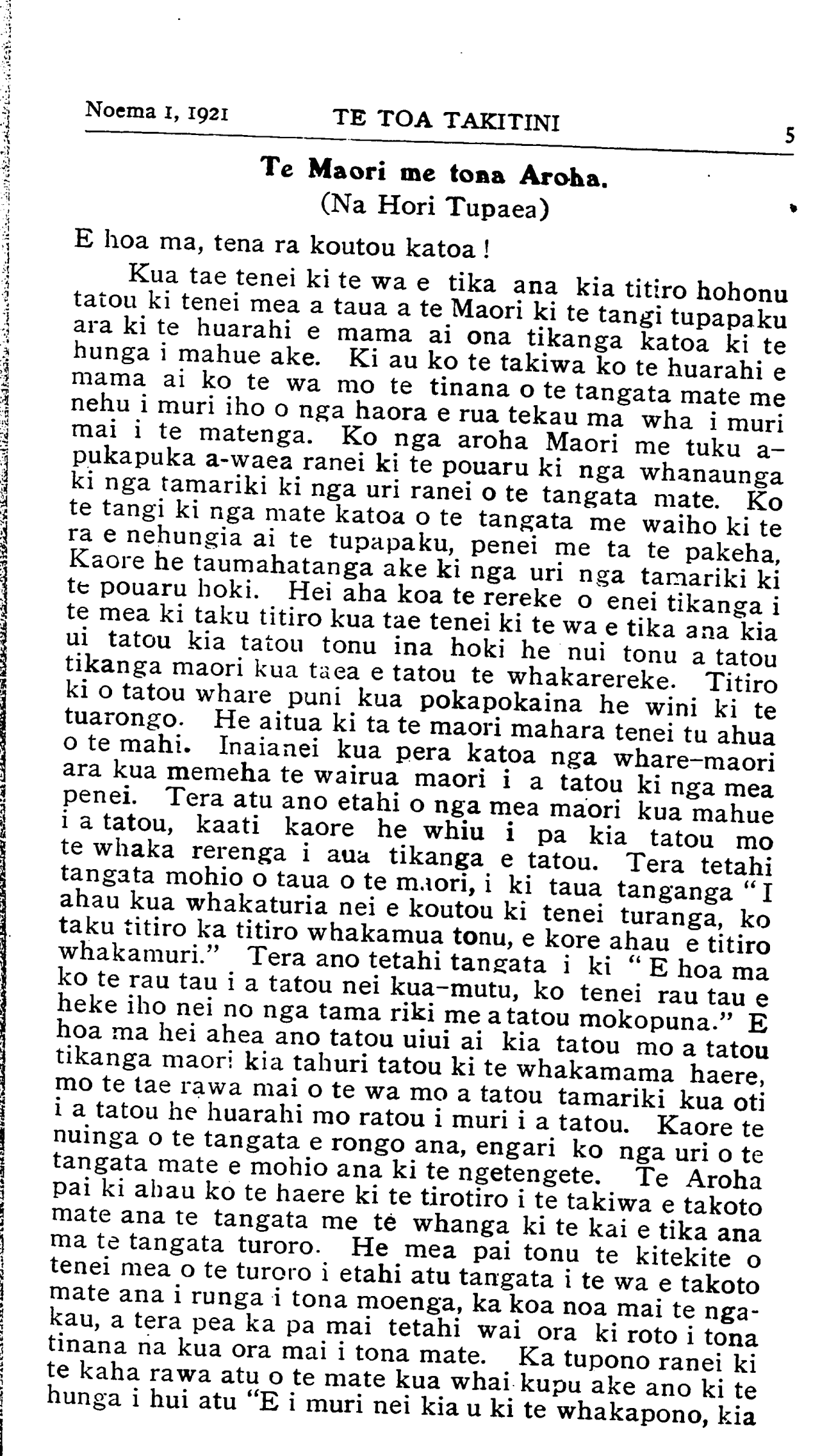 Noema 1, 1921TE TOA TAKITINI 5 Te Maori me tona Aroha. (Na Hori Tupaea) E hoa ma, tena ra koutou katoa! Kua tae tenei ki te wa e tika ana kia titiro hohonu tatou ki tenei mea a taua a te Maori ki te tangi tupapaku ara ki te huarahi e mama ai ona tikanga katoa ki te hunga i mahue ake. Ki au ko te takiwa ko te huarahi e mama ai ko te wa mo te tinana o te tangata mate me nehu i muri iho o nga haora e rua tekau ma wha i muri mai i te matenga. Ko nga aroha Maori me tuku a pukapuka a-waea ranei ki te pouaru ki nga whanaunga ki nga tamariki ki nga uri ranei o te tangata mate. Ko te tangi ki nga mate katoa o te tangata me waiho ki te ra e nehungia ai te tupapaku, penei me ta te pakeha, Kaore he taumahatanga ake ki nga uri nga tamariki ki te pouaru hoki. Hei aha koa te rereke o enei tikanga i te mea ki taku titiro kua tae tenei ki te wa e tika ana kia ui tatou kia tatou tonu ina hoki he nui tonu a tatou tikanga maori kua taea e tatou te whakarereke. Titiro ki o tatou whare puni kua pokapokaina he wini ki te tuarongo. He aitua ki ta te maori mahara tenei tu ahua o te mahi. Inaianei kua pera katoa nga whare-maori ara kua memeha te wairua maori i a tatou ki nga mea penei. Tera atu ano etahi o nga mea maori kua mahue i a tatou, kaati kaore he whiu i pa kia tatou mo te whaka rerenga i aua tikanga e tatou. Tera tetahi tangata mohio o taua o te maori, i ki taua tanganga " I ahau kua whakaturia nei e koutou ki tenei turanga, ko taku titiro ka titiro whakamua tonu, e kore ahau e titiro whakamuri." Tera ano tetahi tangata i ki "E hoa ma ko te rau tau i a tatou nei kua-mutu, ko tenei rau tau e heke iho nei no nga tama riki me a tatou mokopuna." E hoa ma hei ahea ano tatou uiui ai kia tatou mo a tatou tikanga maori kia tahuri tatou ki te whakamama haere, mo te tae rawa mai o te wa mo a tatou tamariki kua oti i a tatou he huarahi mo ratou i muri i a tatou. Kaore te nuinga o te tangata e rongo ana, engari ko nga uri o te tangata mate e mohio ana ki te ngetengete. Te Aroha pai ki ahau ko te haere ki te tirotiro i te takiwa e takoto mate ana te tangata me te whanga ki te kai e tika ana ma te tangata turoro. He mea pai tonu te kitekite o tenei mea o te turoro i etahi atu tangata i te wa e takoto mate ana i runga i tona moenga, ka koa noa mai te ngakau, a tera pea ka pa mai tetahi wai ora ki roto i tona tinana na kua ora mai i tona mate. Ka tupono ranei ki te kaha rawa atu o te mate kua whai kupu ake ano ki te hunga i hui atu "E i muri nei kia u ki te whakapono, kia