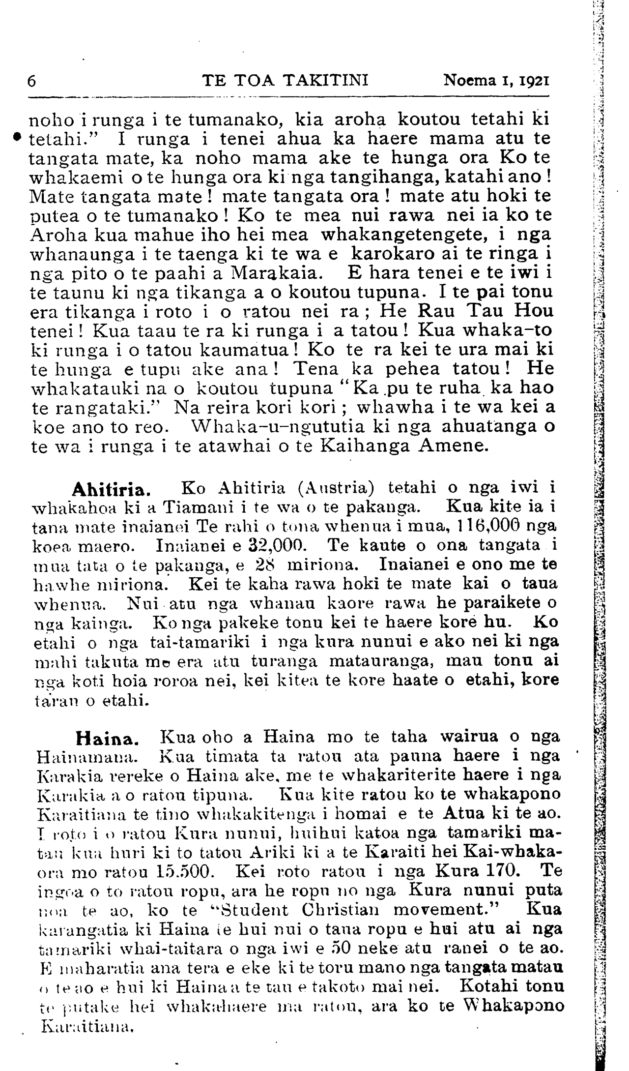 6TE TOA TAKITINI Noema 1, 1921 noho i runga i te tumanako, kia aroha koutou tetahi ki • tetahi." I runga i tenei ahua ka haere mama atu te tangata mate, ka noho mama ake te hunga ora Ko te whakaemi o te hunga ora ki nga tangihanga, katahi ano ! Mate tangata mate ! mate tangata ora ! mate atu hoki te putea o te tumanako ! Ko te mea nui rawa nei ia ko te Aroha kua mahue iho hei mea whakangetengete, i nga whanaunga i te taenga ki te wa e karokaro ai te ringa i| nga pito o te paahi a Marakaia. E hara tenei e te iwi i te taunu ki nga tikanga a o koutou tupuna. I te pai tonu era tikanga i roto i o ratou nei ra ; He Rau Tau Hou tenei! Kua taau te ra ki runga i a tatou ! Kua whaka-to ki runga i o tatou kaumatua! Ko te ra kei te ura mai ki te hunga e tupu ake ana ! Tena ka pehea tatou! He whakatauki na o koutou tupuna " Ka pu te ruha ka hao te rangataki." Na reira kori kori; whawha i te wa kei a koe ano to reo. Whaka-u-ngututia ki nga ahuatanga o te wa i runga i te atawhai o te Kaihanga Amene. Ahitiria. Ko Ahitiria (Austria) tetahi o nga iwi i whakahoa ki a Tiamani i te wa o te pakanga. Kua kite ia i tana mate inaianei Te rahi o tona whenua i mua, 116,000 nga koea maero. Inaianei e 32,000. Te kaute o ona tangata i mua tata o te pakanga, e 28 miriona. Inaianei e ono me te hawhe miriona. Kei te kaha rawa hoki te mate kai o taua whenua. Nui atu nga whanau kaore rawa he paraikete o nga kainga. Ko nga pakeke tonu kei te haere kore hu. Ko etahi o nga tai-tamariki i nga kura nunui e ako nei ki nga mahi takuta me era atu turanga matauranga, mau tonu ai nga koti hoia roroa nei, kei kitea te kore haate o etahi, kore tarau o etahi. Haina. Kua oho a Haina mo te taha wairua o nga Hainamana. Kua timata ta ratou ata pauna haere i nga ' Karakia rereke o Haina ake, me te whakariterite haere i nga Karakia a o ratou tipuna. Kua kite ratou ko te whakapono Karaitiana te tino whakakitenga i homai e te Atua ki te ao. I roto i o ratou Kura nunui, huihui katoa nga tamariki ma-tau kua huri ki to tatou Ariki ki a te Karaiti hei Kai-whakaora mo ratou 15.500. Kei roto ratou i nga Kura 170. Te ingoa o to ratou ropu, ara he ropu no nga Kura nunui puta noa te ao, ko te "Student Christian movement." Kua karangatia ki Haina i e hui nui o taua ropu e hui atu ai nga tamariki whai-taitara o nga iwi e 50 neke atu ranei o te ao. E maharatia ana tera e eke ki te toru mano nga tangata matau o te ao e hui ki Haina a te tau e takoto mai nei. Kotahi tonu te putake hei whakahaere ma ratou, ara ko te Whakapono Karaitiana.