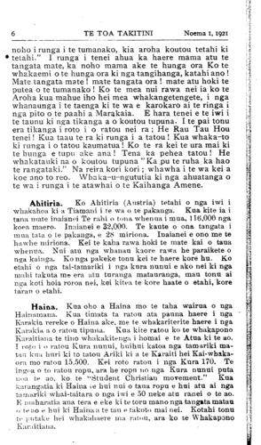 4TE TOA TAKITINI Noema I, 1921 Ko Rev. G. R. Finch, B.D.. te minita o te Kareti. Kei a ia nga whakahaere e pa ana ki te taha ki te whakapono. Ko te tiupiri, ara te 50 tau o te tuunga o tenei kura o Te Aute kei te tau e takoto mai nei 1922. E whakaarotia ana he mea tika kia whakanuia taua tiupiri. Tera e whakatakotoria te kohatu o te kokonga o Te Aute Kareti hou i taua wa. 11. Hukarere. Kua hoki mai a Miss Emily Bulstrode i Ingarangi a kua noho ano hei tumuaki mo Hukarere. I a ia e ngaro atu ana, ko Mihi Mere Hooro te Kai-whakahaere o Hukarere. Kanui te whakamihi ki te kaha o Mihi Hooro i te wa e ngaro atu ana a Miss Bulstrode. 12. Waerengahika. I te kaha o te piki haere o nga utu mo nga mea katoa, ka uaua te whakarite i te nama o tenei kura. Ahakoa e rua nga whakarahinga ake i te utu mo nga tamariki e kura ana i reira, kaore i hoki te nama engari piki ana ki te £1,000. I te hui a nga Kai-tiaki whakataua ana me kati. He nui te pouri o nga Kai-tiaki mo tenei whakatau engari kaore he whakatau ke atu i te mea kei te piki haere tonu te nama. Ko to ratou manawapa ko te kai-whakaako tumuaki ara ko Mr. McGruther me ona kaiawhina. No te whakatakotoranga i tenei take ki te Kawanatanga, ka arohatia mai e ratou, a homai ana e ratou he moni kia puare tonu ai a Waerengahika. Ko taua moni a te Kawanatanga he mea tuku mai e ratou mo tenei wa, engari kei te wa e piki ai te utu o nga whenua riihi o te Kura me whakahoki ano te moni a te Kawanatanga. He Eropereina. Kei te wa e pai ai nga rangi ka rere mai a Kapene Paura (Fowler) i Invercargill ki Akarana. Ki tana whakaaro ka taea e ia tenei rere roa i te ra kotahi. E wha nga wahanga mo tana rere. Te wahi tuatahi i Invercargill ki Timaru, te tuarua ki Kaikoura, te tuatoru ki te Hawera, te tuawha i te Hawera ki Akarana. Ko te paerata me te pahihi ana hoa ina rere mai. Ki te kore he raruraru ka taea e ia tenei rere tawhiti i roto i nga haora tekau-ma-rua, e ai ki tana korero. Kua rere tana Eropereira i te 25 o Oketopa. Kua tae pai ki Akarana. Te tere o taua rere 114 maero i te haora. E iwa haora i rere ai. Mate-kai. Kai te kaha rawa te mate o Ruhia i te kore kai. Kei te whakahaere tikanga etahi o nga mana nunui o te ao hei awhina i a Ruhia. Kotahi te ropu kei Ahitereria kei te whangai i nga tamariki o tetahi taone pakupaku o Ruhia, ara ko Samara te ingoa o taua taone. E 30,000 nga tamariki kei te whangaia e taua ropu i nga ra katoa o te wa mate-kai. Kua maha nga miriona tamariki me etahi miriona o nga matua o nga wahi katoa o Ruhia kua hemo rawa, na te kore kai i matemate ai.