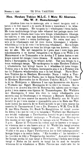 Noema 1, 1921TE TOA TAKITINI * Hon. Heuheu Tukino M.L.C. I Mate Ki Akarana. (Na W. P. Hawaikirangi) Ahakoa kua roa te matenga atu o tenei tangata nui o tatou o te iwi maori o te motu E kore e wareware i te whakaaro o te tangata. He tangata ia i whakapau i tona kaha. Me tona mohiotanga kinga take whanui hei painga mote iwi mete motu I timata mai tona uru kinga whakahaere tikanga ite takiwa e ora ana nga kaumatua ka kitea koia te tamaiti tokopakari i roto i o ratau huihuinga. No reira mai ano i uru ai te whakaaaro nui ki roto i tona hinengaro i whaka-whaititia a i e ia ki roto i te kete ona whakaaro. Ko te kupu na tena ko te kupu na tena ka hinga nga toa korero. Otira me ki ake. He uri rangatira ia i puta mai i roto inga pou tokomanawa o te kawai rangatira o te Mana o te Wehi o te Manawanui o te Tumanako o te Aroha I U katoa katoa e nei kupu nunui ki runga i tono tinana. E mohio ana te motu katoa i karangatia ia kite whare Ariki. Tae noa kinga ra o tona wahangu tanga. He mokopuna ia na te Heuheu Tukino i whakaturia hei kiingi kaore ia i whakaae ki taua tunga. Tukua ana e ia kia Potatau, karangatia ana e ia a Potatau kia V tae ki Pukawa whakawahia ana e ia hei kiingi. Na te Heu- heu Tukino ko te Heuheu Horonuku Nana i tuku a Ton-gariro ki te Kuini hei Paaka mo te katoa National Park. Na I te Heuheu Horonuku ko te Heuheu Tukino M.L.C. ' I mate ia ki te Hohipera o Akarana I tae nga kaumatua o te Arawa o Waikato me Ngati Maniapoto ki te tiki i te tinana. Ko te hiahia o te Arawa kia riro ki Rotorua kia takoto ano te tupapaku i tera marae ona tipuna ki Tamatekapua. Ko Waikato me Maniapoto, I tono kia riro ia ratau whakaaetia ana mauria ana ki Onehunga e te whanau a Henare Kaihau kotahi te po ki tera marae ka mauria ki Huntly ara ki Waahi kotahi te po i tera marae e manaakitia ana e te Rata me Waikato katoa ka mauria ki te Kuiti kotahi te po i tera marae ka mauria ki Taumarunui I tae a Dr. Pomare a W.H. Uru M.H. R. me Hira Parata, Dr. Buck Te Rangihiroa ki tenei marae ka kitea i ko nei te nui o te tangata o Waikato me Maniapoto me tetahi wahanga o Tuwharetoa kotahi te po i tenei marae i te ata ka hoki tetahi wahanga u Waikato, me Maniapoto kia mama ai mo nga waka i te taenga aru ki Waimai ino i te 5 p.m. Katae ki Tokaanu ka tukua mai te karere e te tangata whenua mo te ata haere atu ai ki Waihi kia tangi awatea ai ratau ki to ratou rangatira I te ata 10 a.m. katae ki Waihi e tu ana a Ngari Tuwharetoa ko te kiri tahanga anake konga kupu o ta ratou haka. "Ka tanuku e ! ka tanuku e ! ka tanuku te tihi o Tongariao ka tanuku." Ana atu te roanga he hanga aroha ki nga tangi a Tuwharetoa i hokia ano kinga tangi o Nehe ra ka mutu te tangi ka tu mai te tangata whenua ki te whakatau a Hoko Patene me etahi atu ko te