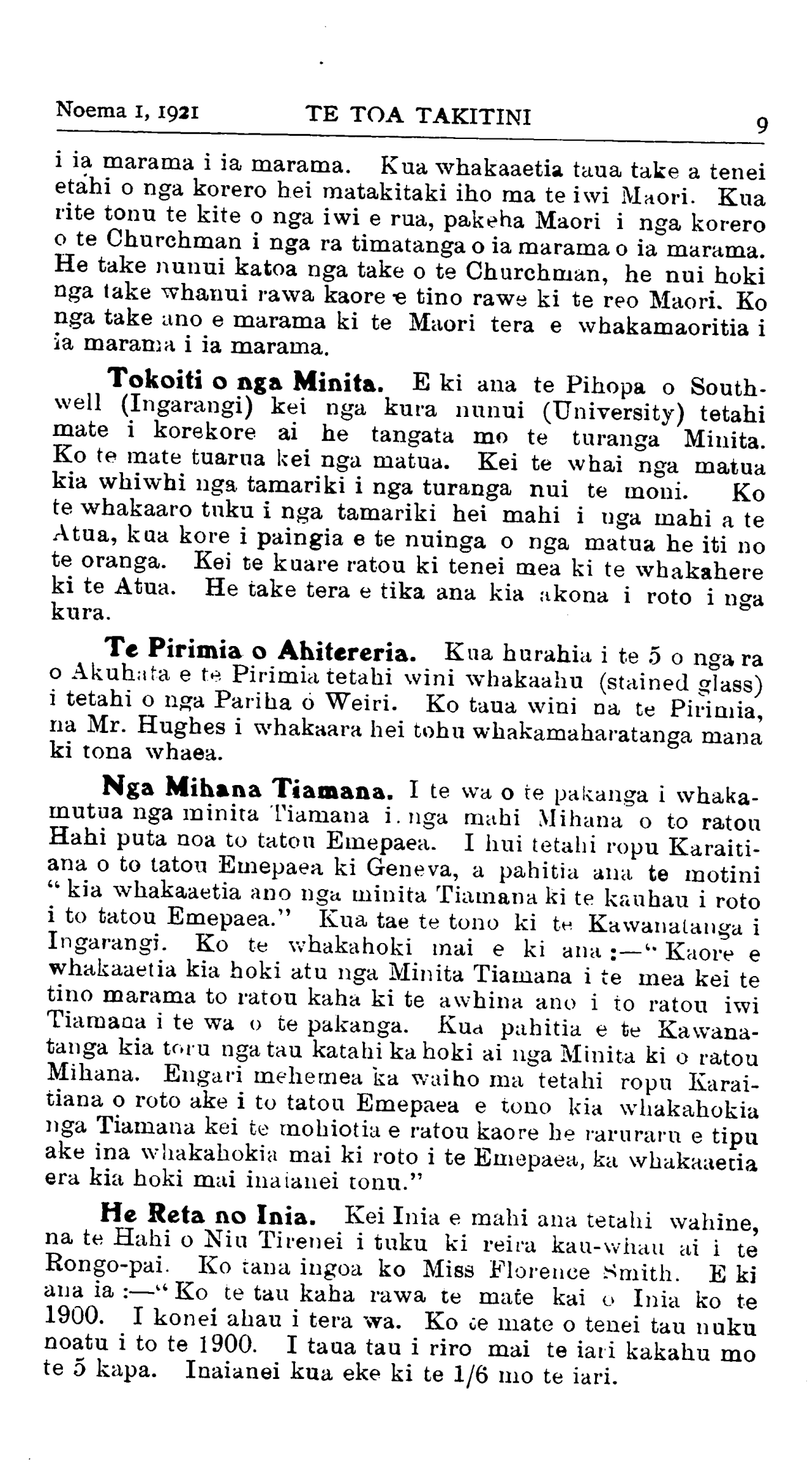 Noema 1, 1921TE TOA TAKITINI 9 i ia marama i ia marama. Kua whakaaetia taua take a tenei etahi o nga korero hei matakitaki iho ma te iwi Maori. Kua rite tonu te kite o nga iwi e rua, pakeha Maori i nga korero o te Churchman i nga ra timatanga o ia marama o ia marama. He take nunui katoa nga take o te Churchman, he nui hoki nga take whanui rawa kaore e tino rawe ki te reo Maori. Ko nga take ano e marama ki te Maori tera e whakamaoritia i ia marama i ia marama. Tokoiti o nga Minita. E ki ana te Pihopa o South-well (Ingarangi) kei nga kura nunui (University) tetahi mate i korekore ai he tangata mo te turanga Minita. Ko te mate tuarua kei nga matua. Kei te whai nga matua kia whiwhi nga tamariki i nga turanga nui te moni. Ko te whakaaro tuku i nga tamariki hei mahi i nga mahi a te Atua, kua kore i paingia e te nuinga o nga matua he iti no te oranga. Kei te kuare ratou ki tenei mea ki te whakahere ki te Atua. He take tera e tika ana kia akona i roto i nga kura. Te Pirimia o Ahitereria. Kua hurahia i te o o nga ra o Akuhata e te Pirimia tetahi wini whakaahu (stained glass) i tetahi o nga Pariha 6 Weiri. Ko taua wini na te Pirimia, na Mr. Hughes i whakaara hei tohu whakamaharatanga mana ki tona whaea. Nga Mihana Tiamana. I te wa o te pakanga i whakamutua nga minita Tiamana i. nga mahi Mihana o to ratou Hahi puta noa to tatou Emepaea. I hui tetahi ropu Karaitiana o to tatou Emepaea ki Geneva, a pahitia ana te motini " kia whakaaetia ano nga minita Tiamana ki te kauhau i roto i to tatou Emepaea." Kua tae te tono ki te Kawanatanga i Ingarangi. Ko te whakahoki mai e ki ana :—" Kaore e whakaaetia kia hoki atu nga Minita Tiamana i te mea kei te tino marama to ratou kaha ki te awhina ano i to ratou iwi Tiamana i te wa o te pakanga. Kua pahitia e te Kawanatanga kia toru nga tau katahi ka hoki ai nga Minita ki o ratou Mihana. Engari mehemea ka waiho ma tetahi ropu Karaitiana o roto ake i to tatou Emepaea e tono kia whakahokia nga Tiamana kei te mohiotia e ratou kaore he raruraru e tipu ake ina whakahokia mai ki roto i te Emepaea, ka whakaaetia era kia hoki mai inaianei tonu." He Reta no Inia. Kei Inia e mahi ana tetahi wahine, na te Hahi o Niu Tirenei i tuku ki reira kau-whau ai i te Rongo-pai. Ko tana ingoa ko Miss Florence Smith. E ki ana ia :—" Ko te tau kaha rawa te mate kai o Inia ko te 1900. I konei ahau i tera wa. Ko te mate o tenei tau nuku noatu i to te 1900. I taua tau i riro mai te iari kakahu mo te 5 kapa. Inaianei kua eke ki te 1/6 mo te iari.