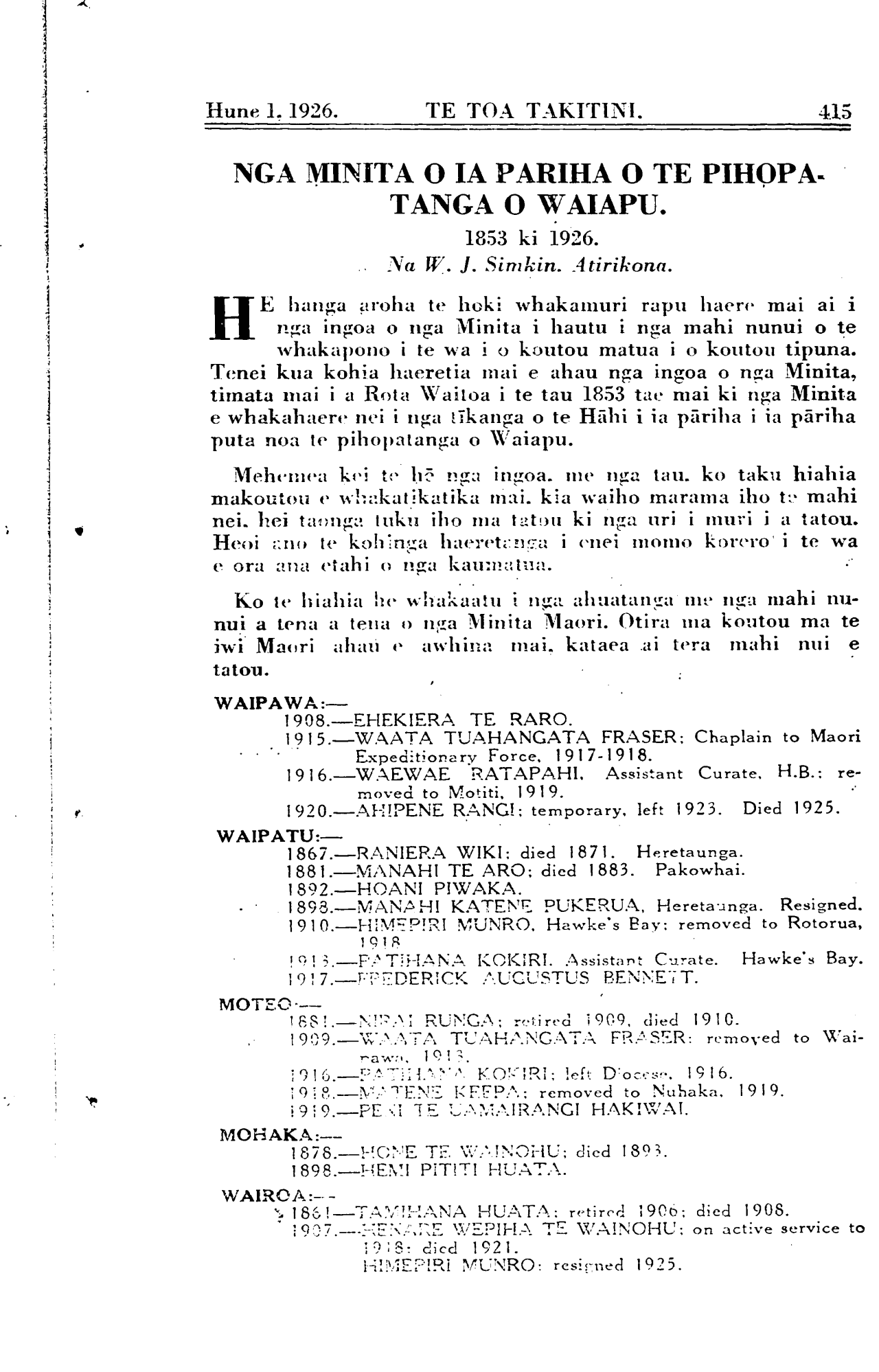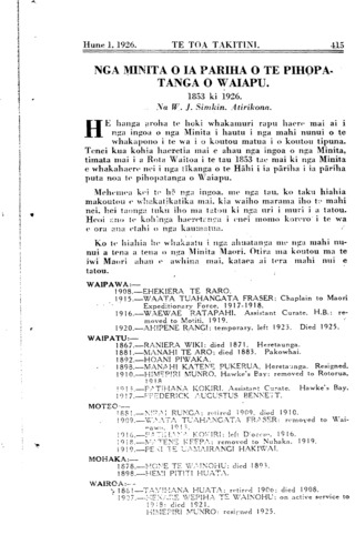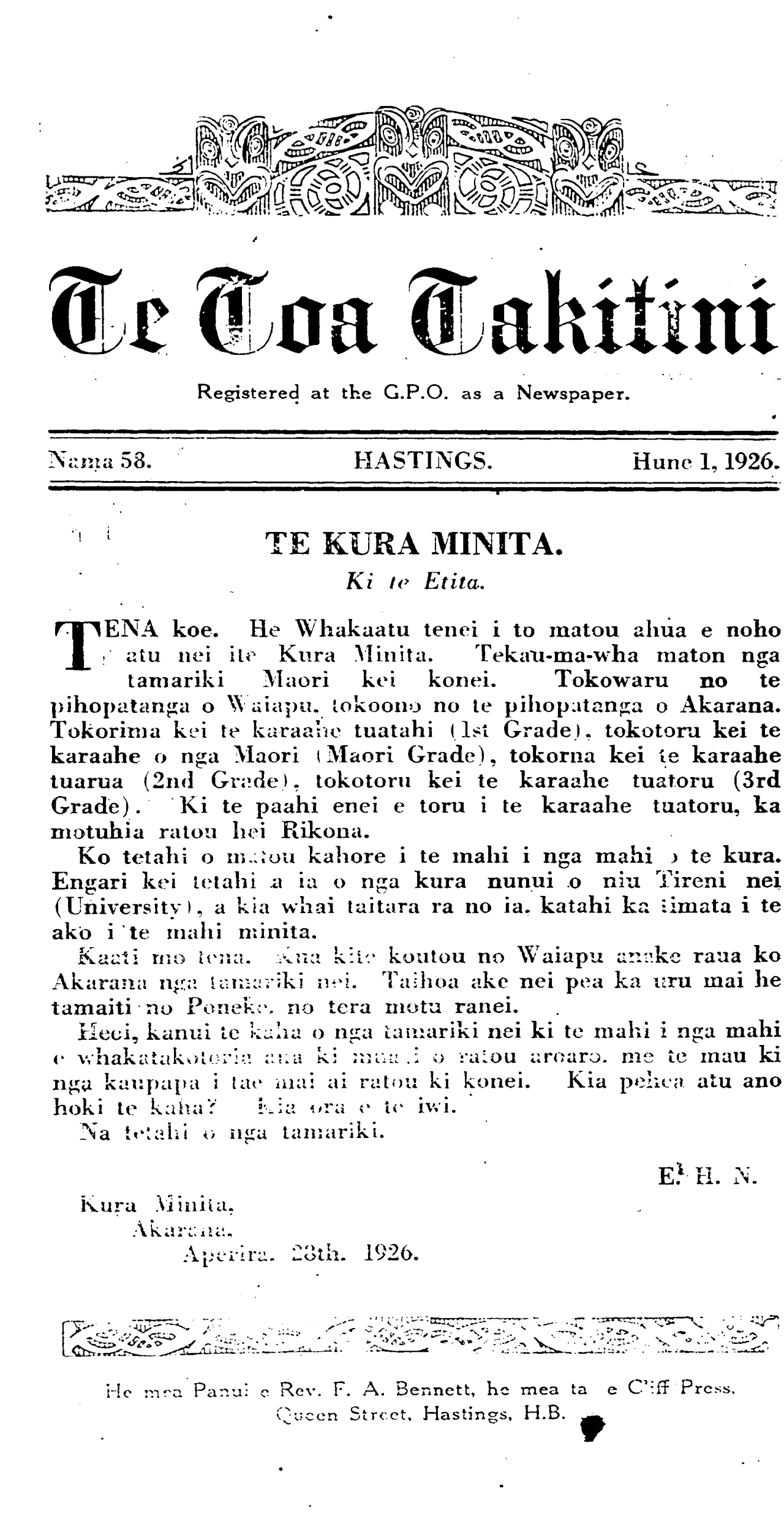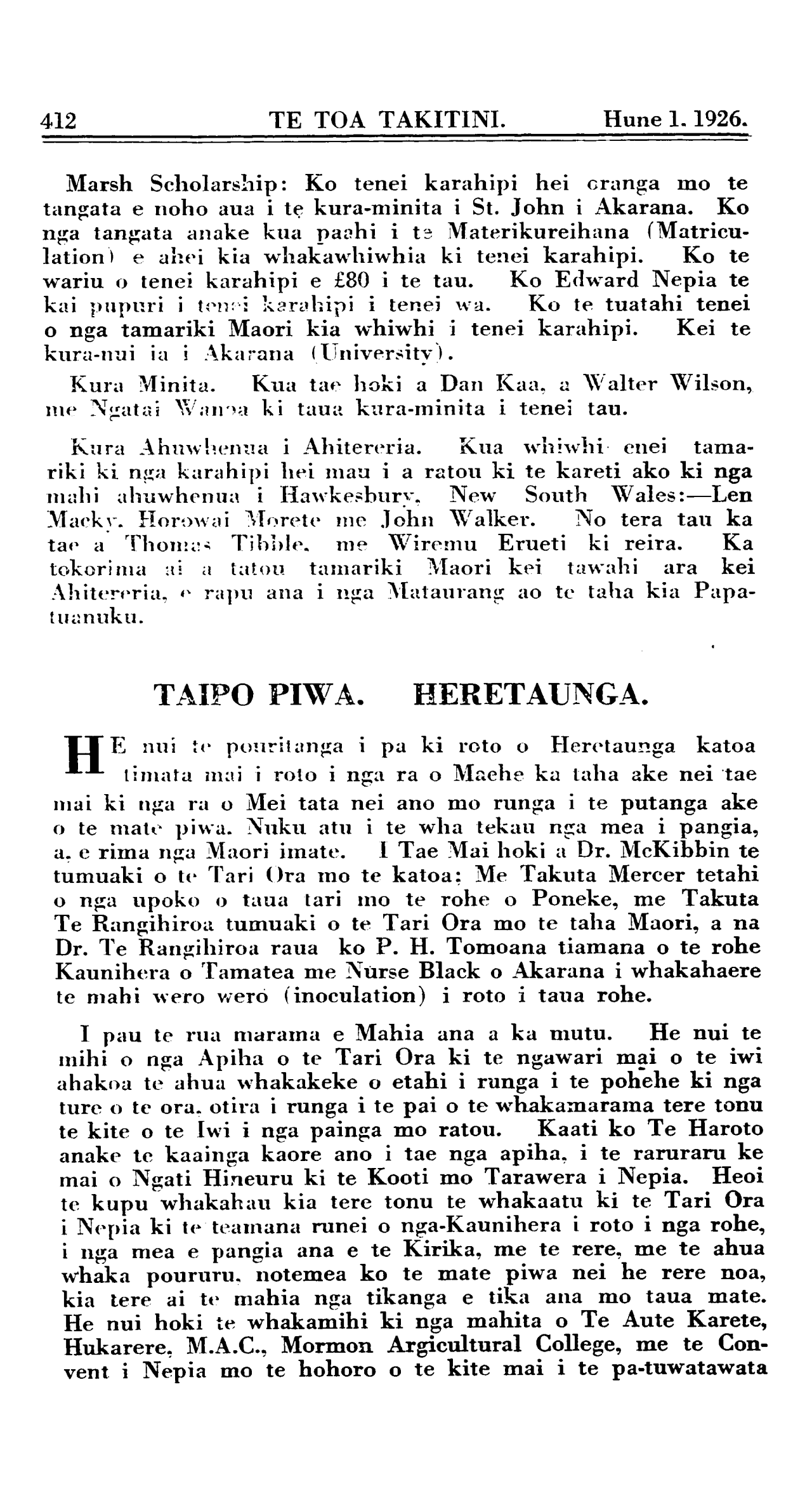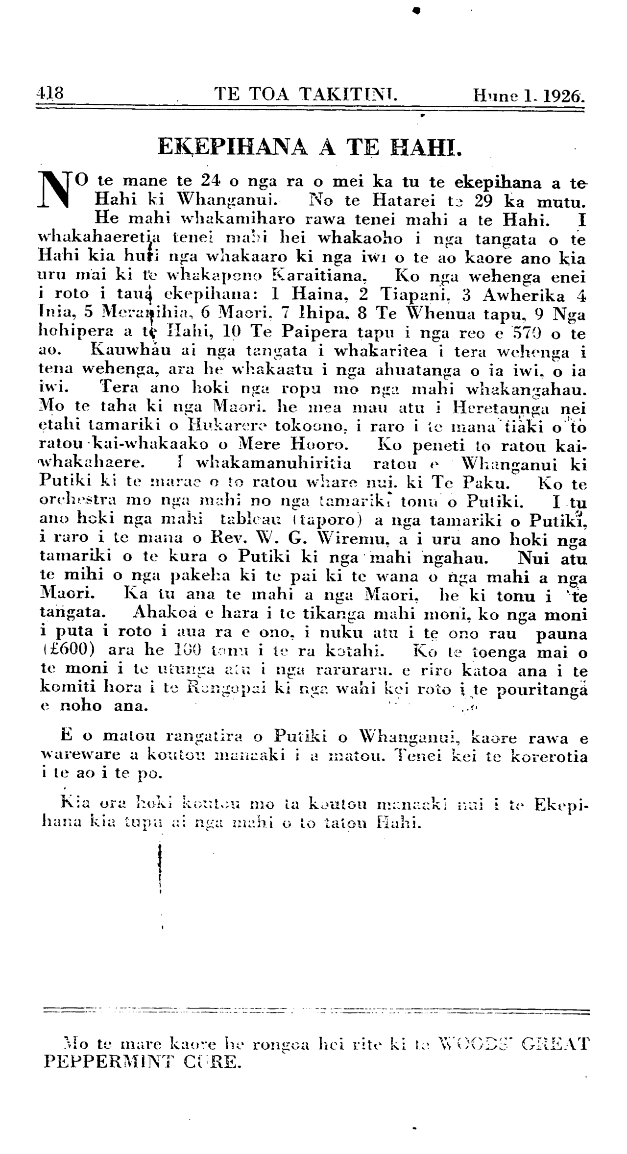 418 TE TOA TAKITINI. Hune 1. 1926.