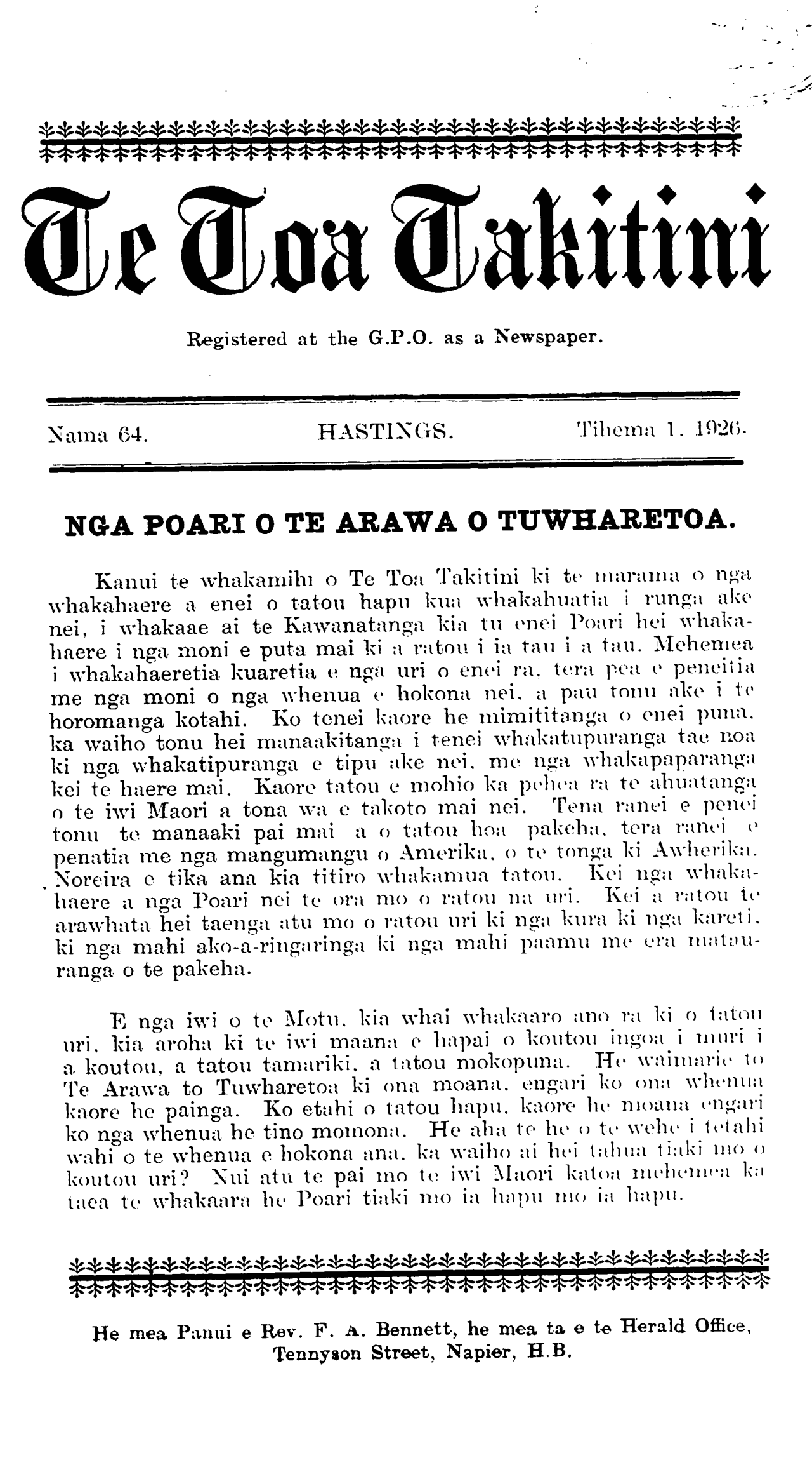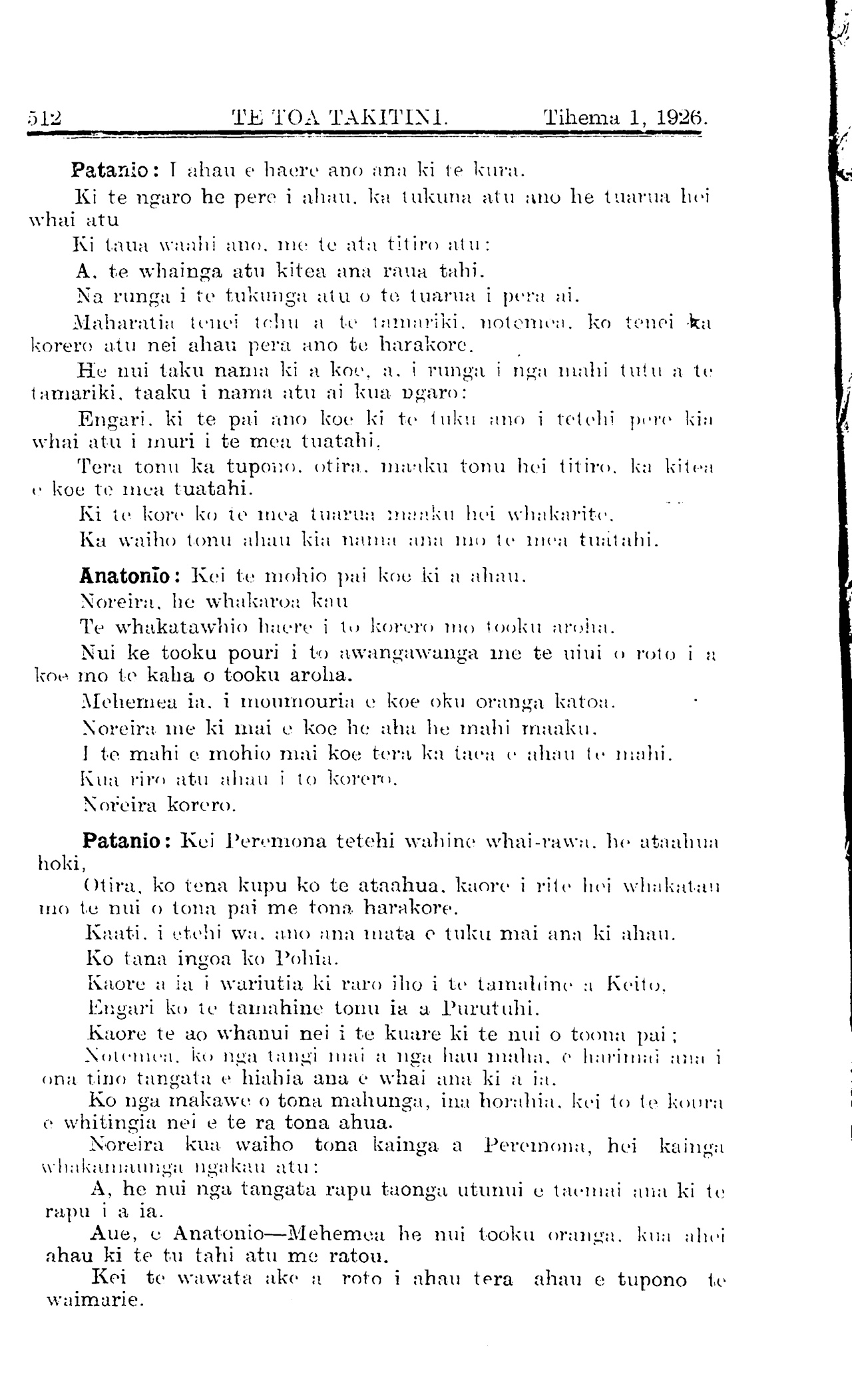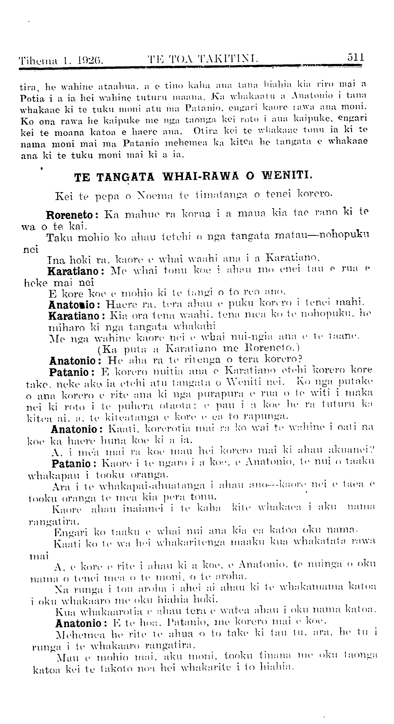 \_\_\_\_\_\_\_\_\_TE TOA TAKITINI. \_\_\_\_\_\_Tihema 1 1926.