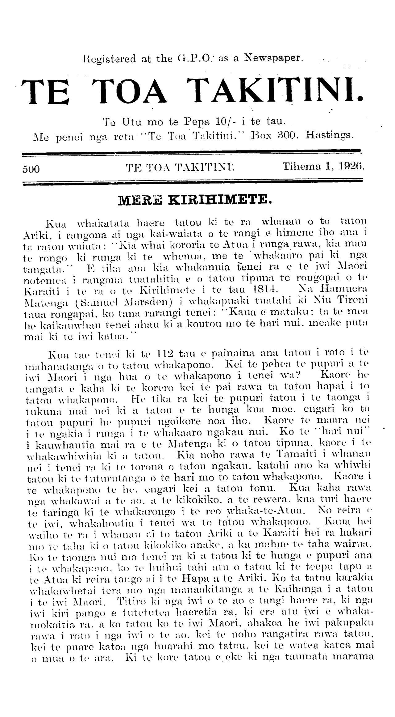 500 TE TOA TAKITINI. Tihema 1, 1926.