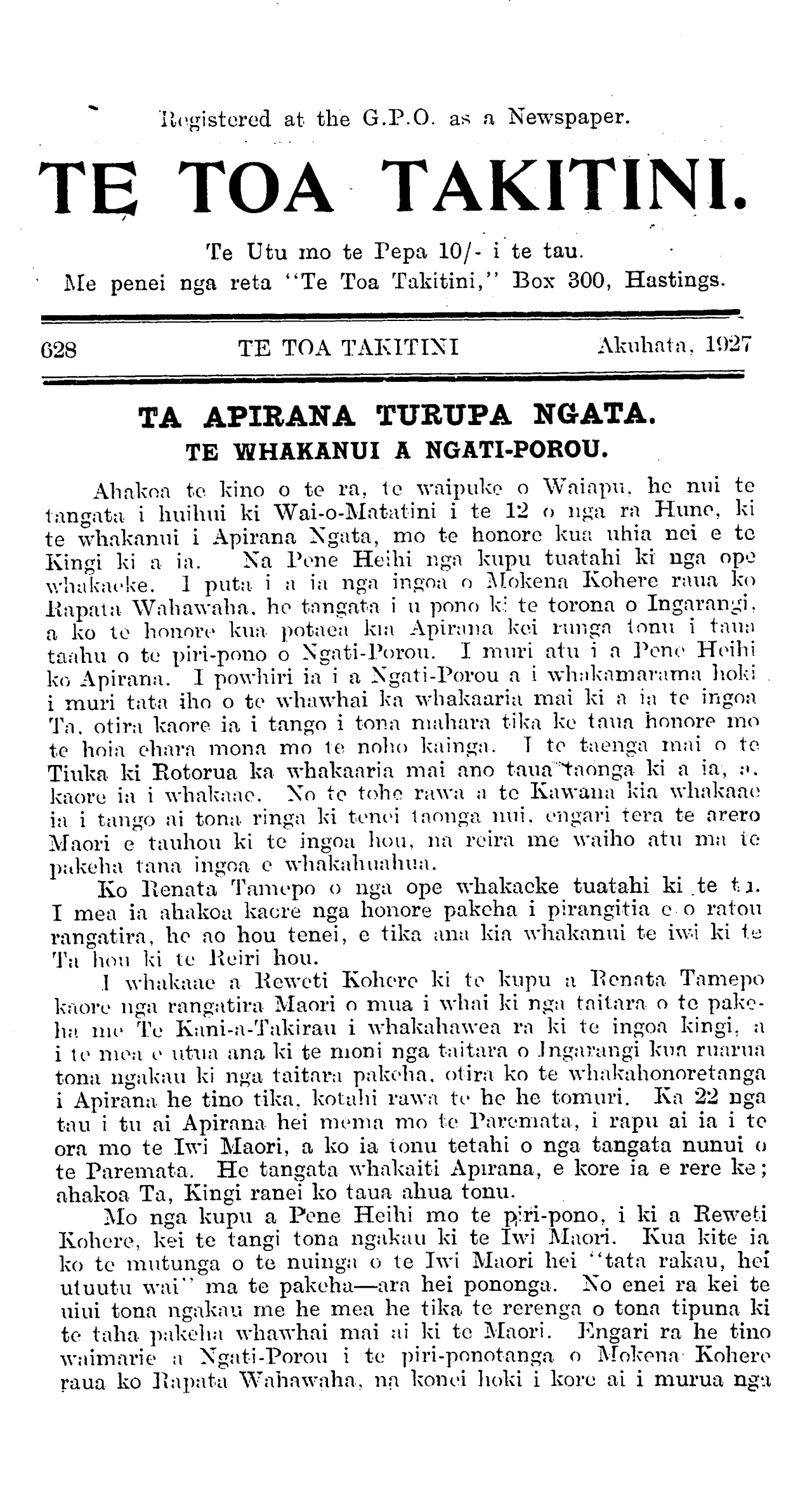 628 TE TOA TAKITINI Akuhata. 1927