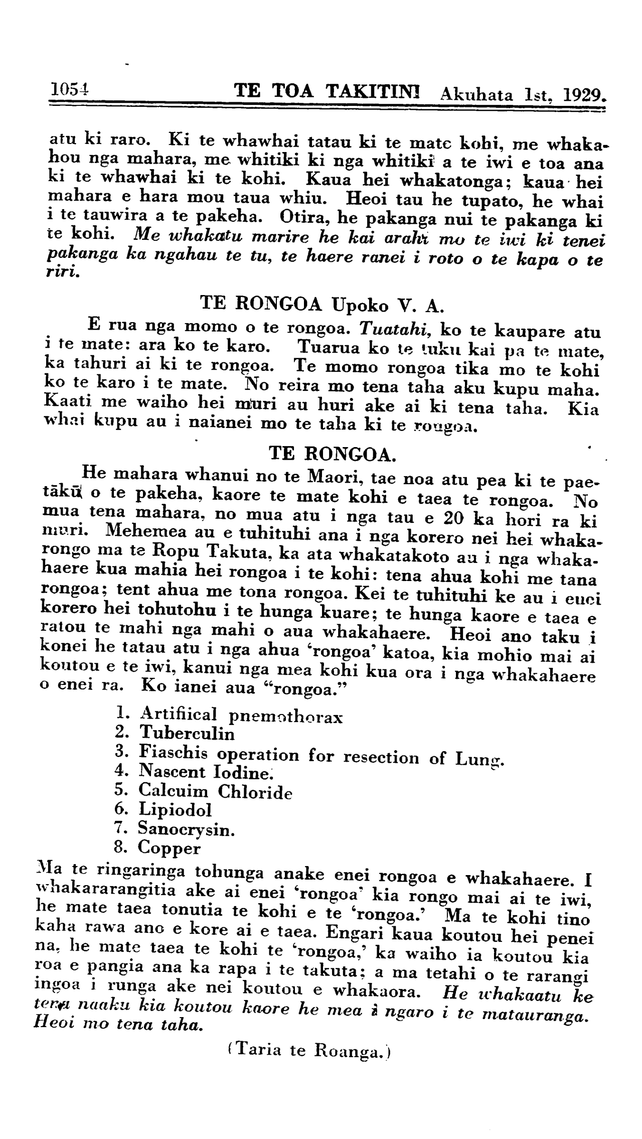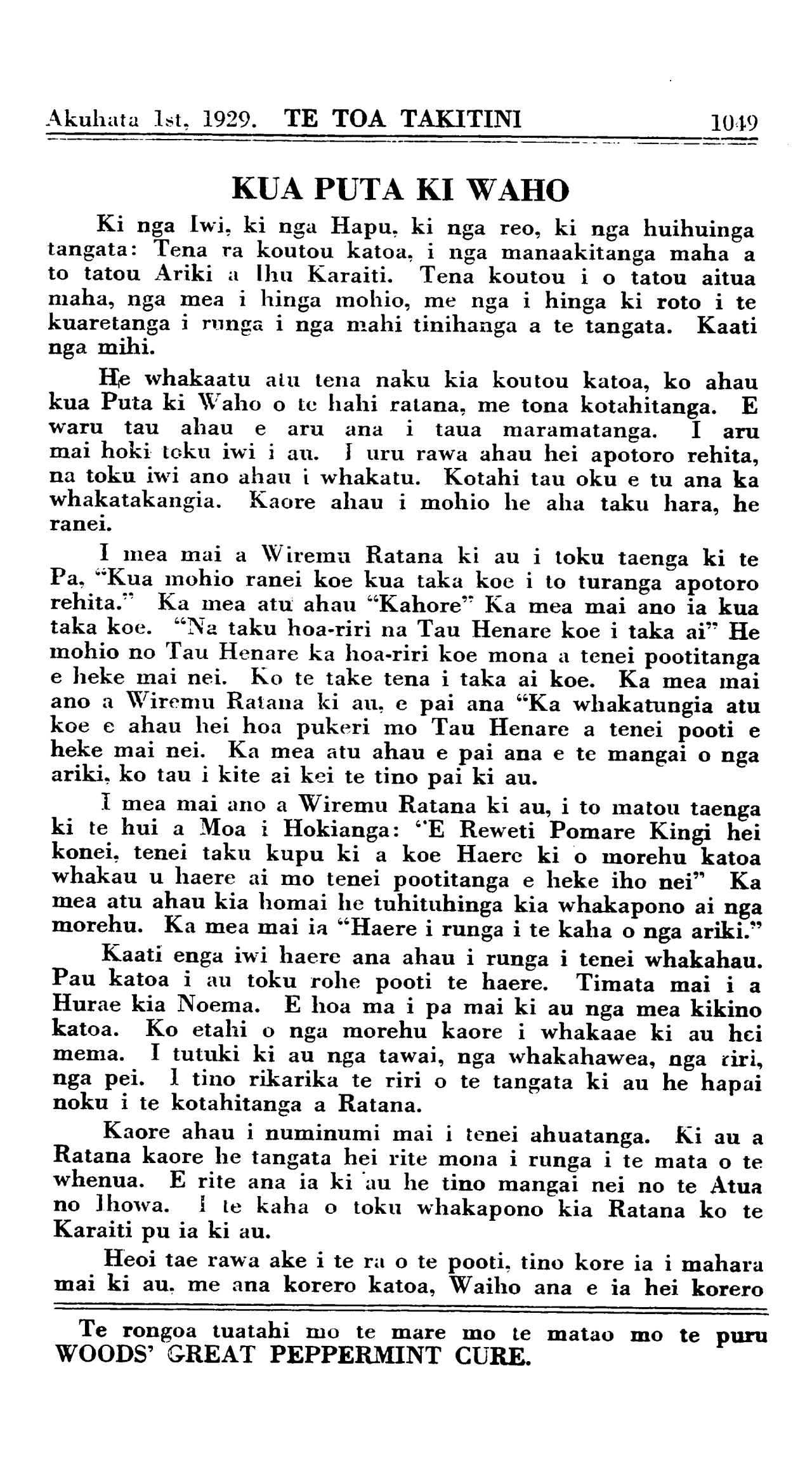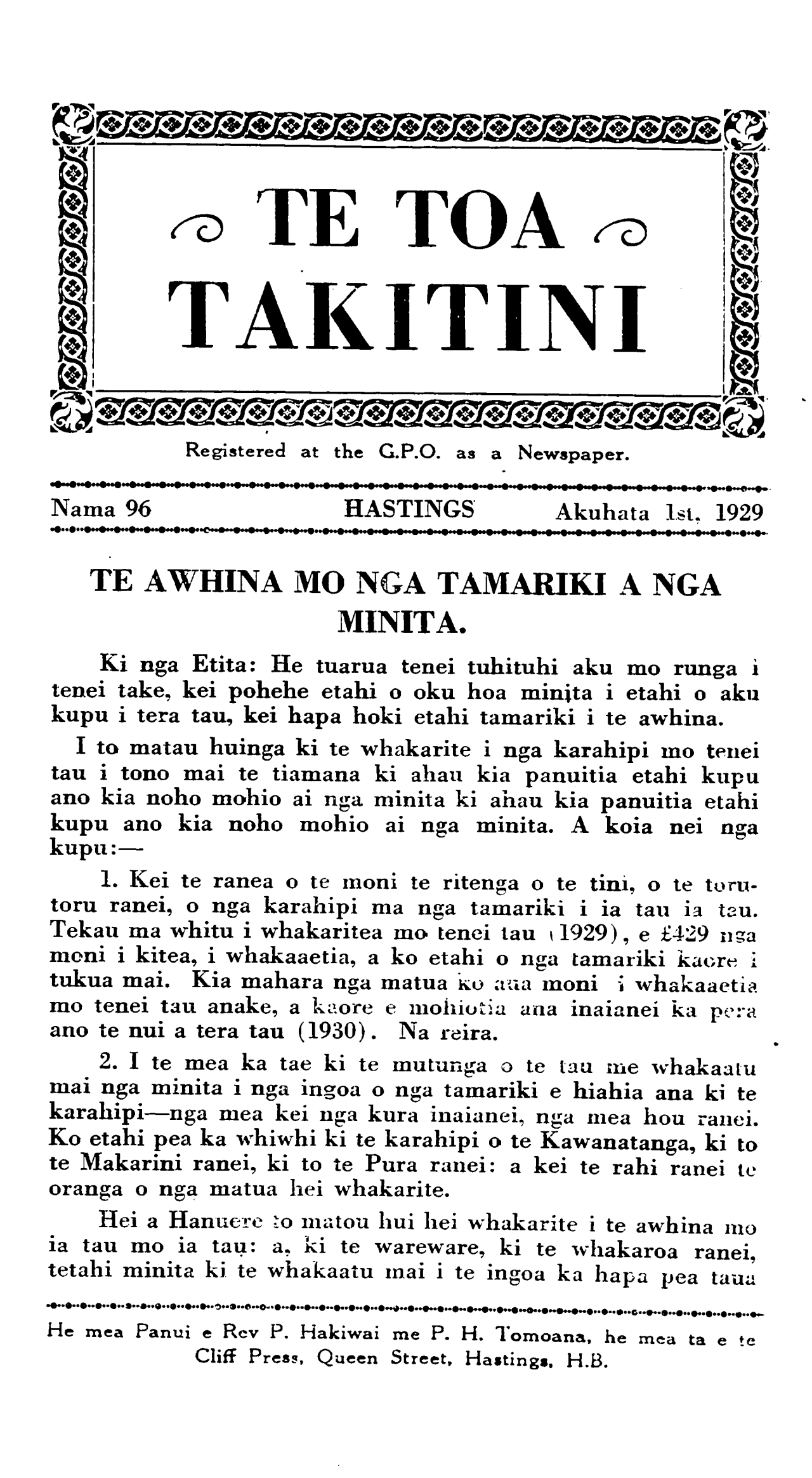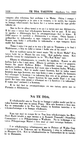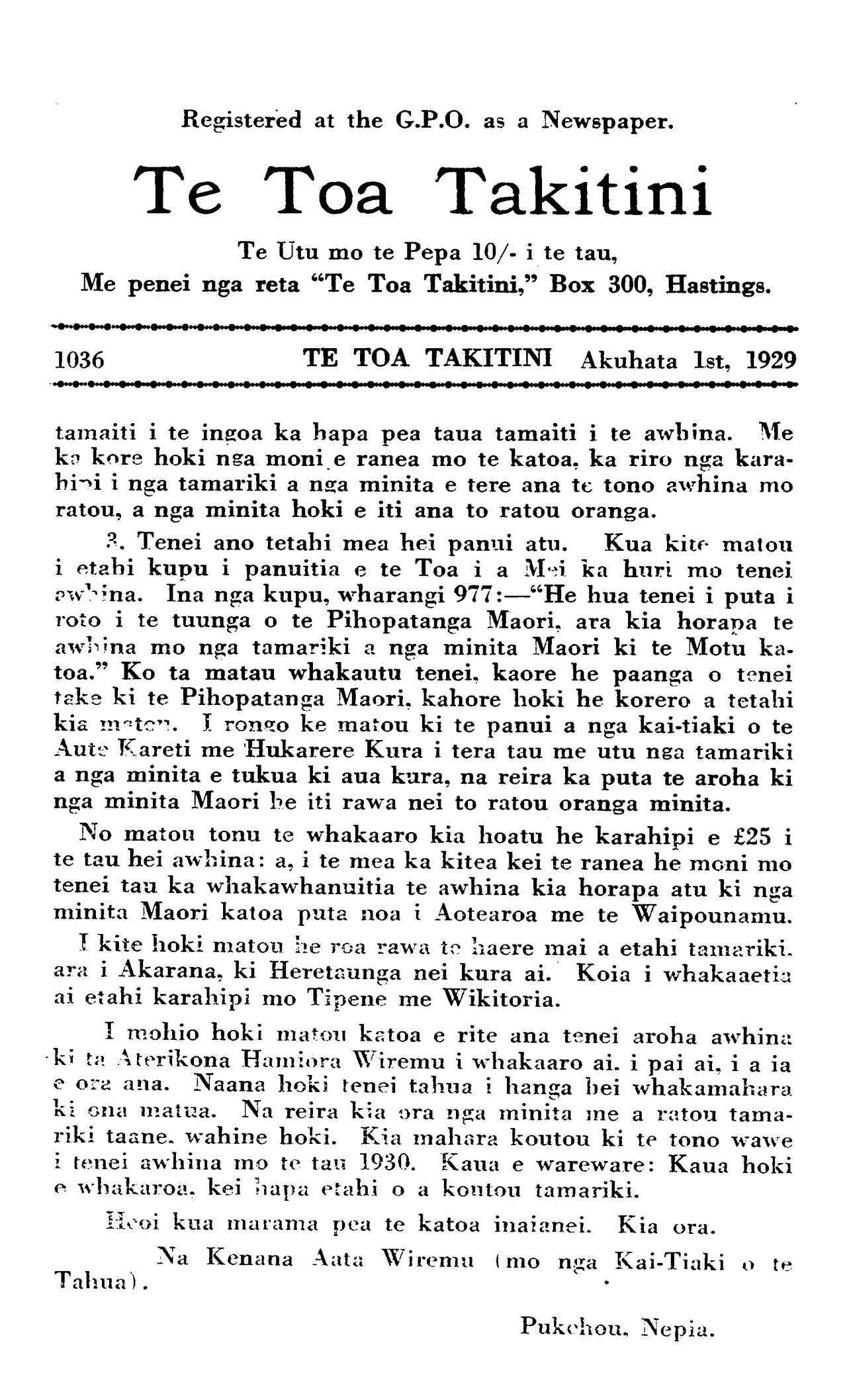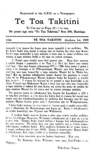 1036 TE TOA TAKITINI Akuhata 1st, 1929