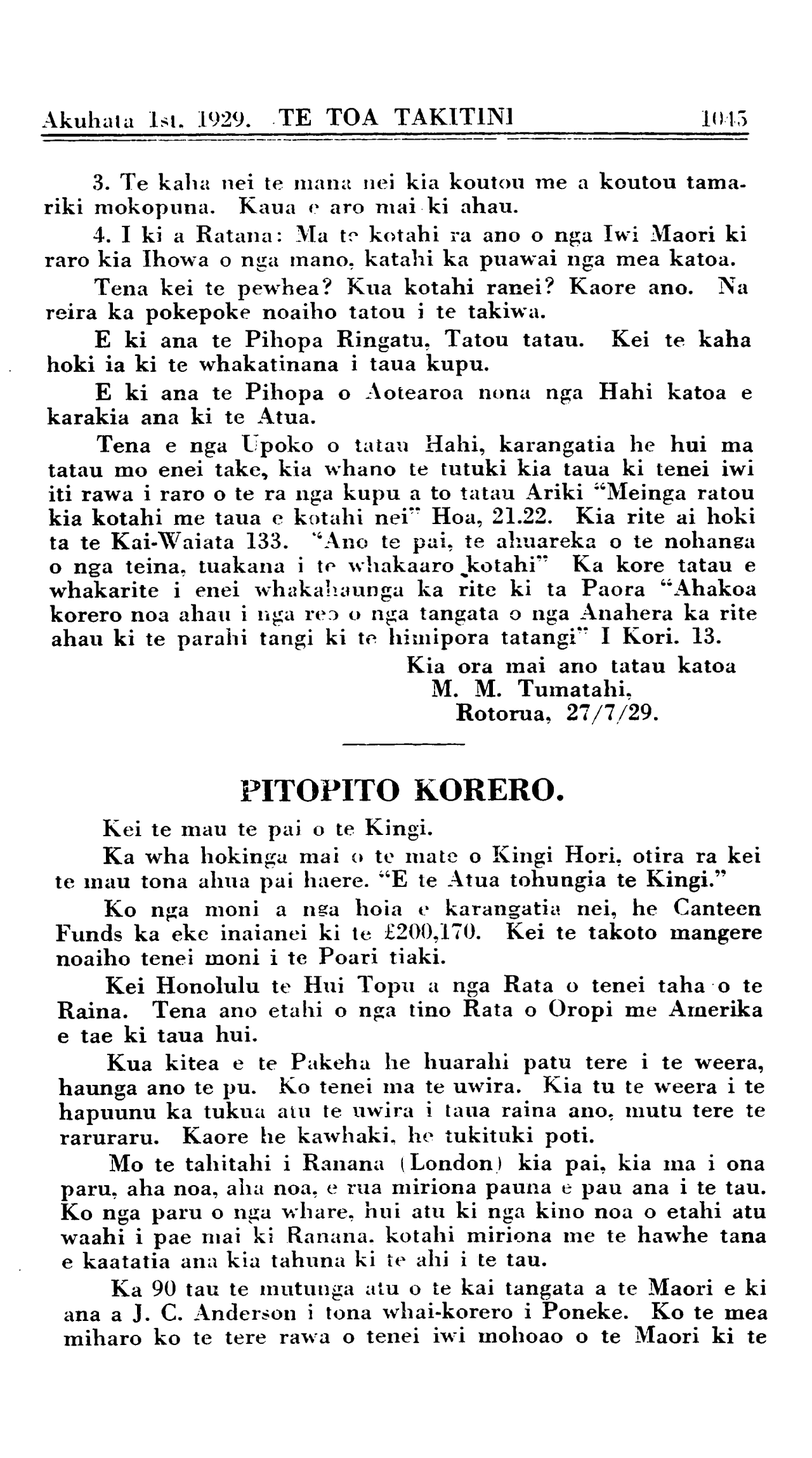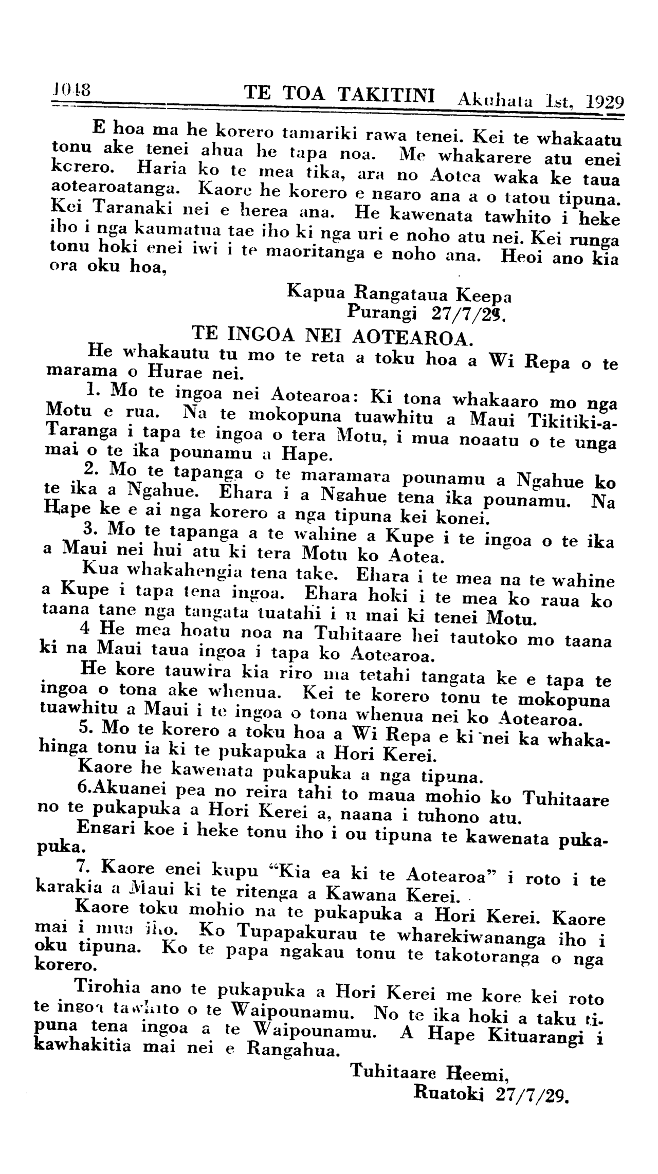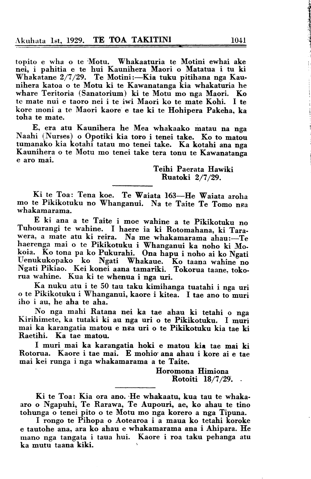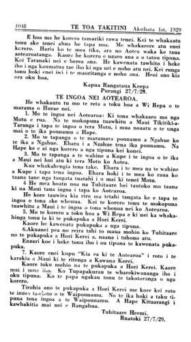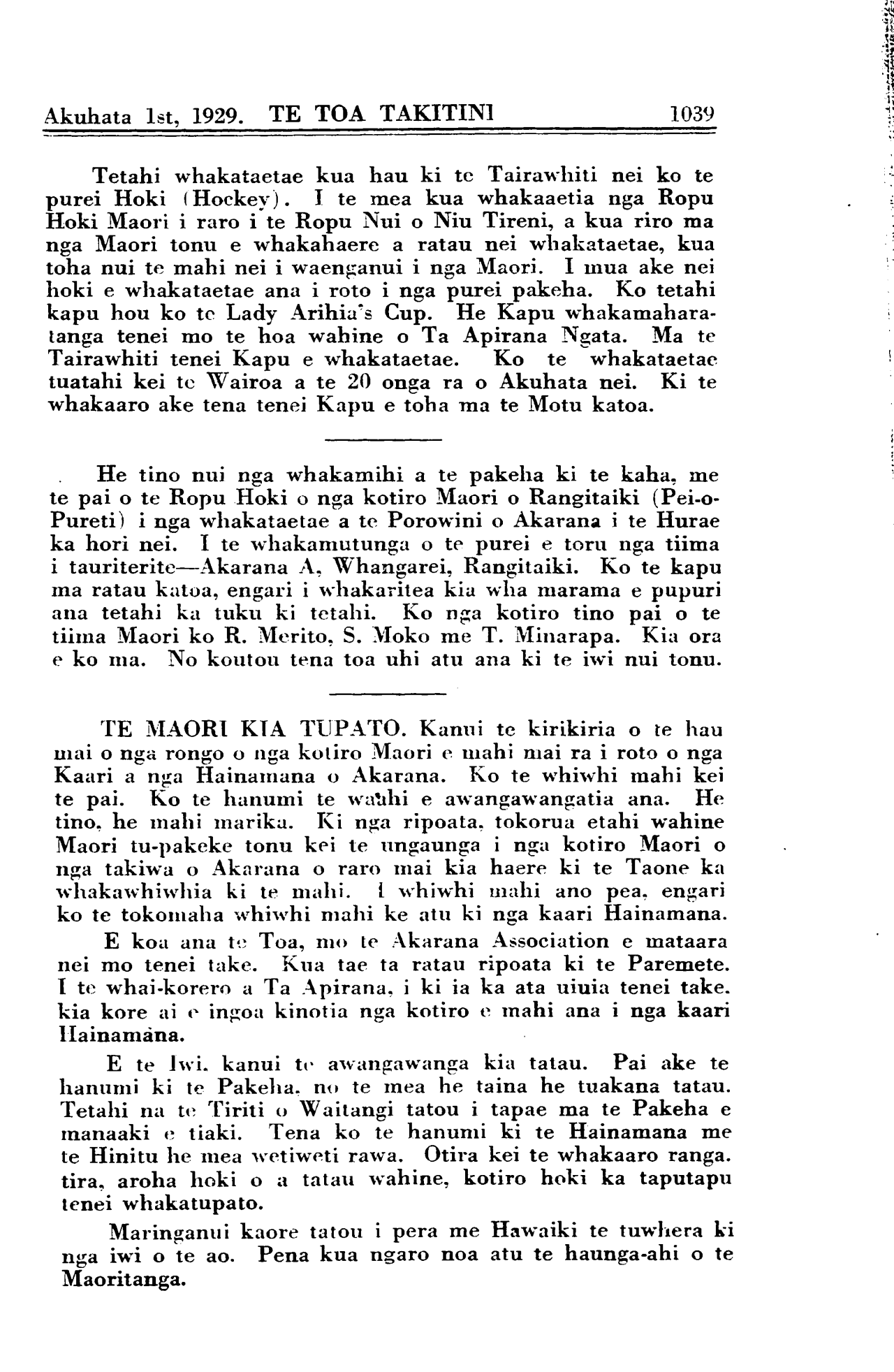 Akuhata 1st, 1929. TE TOA TAKITINI 1037