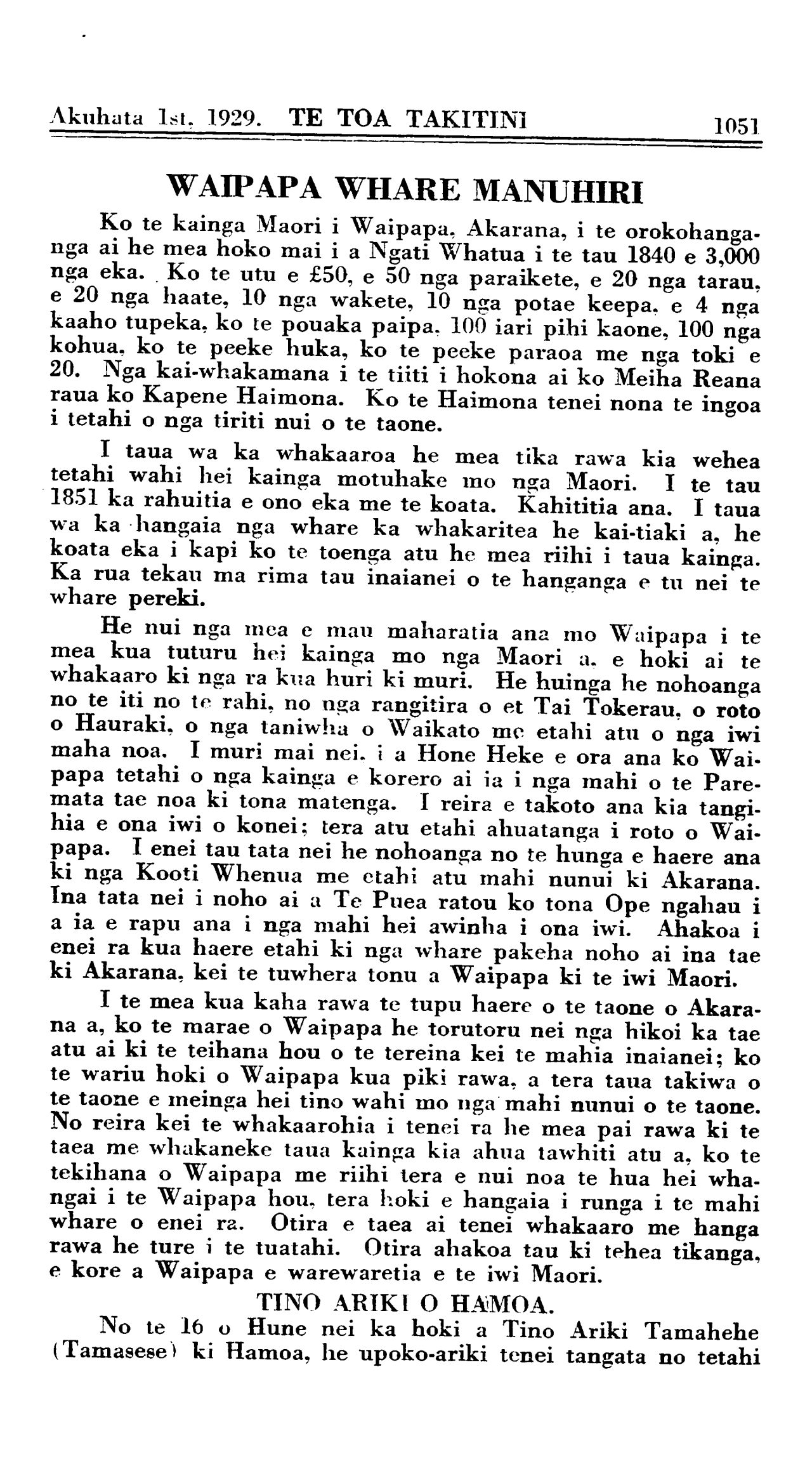 1054 TE TOA TAKITINI Akuhata 1st, 1929
