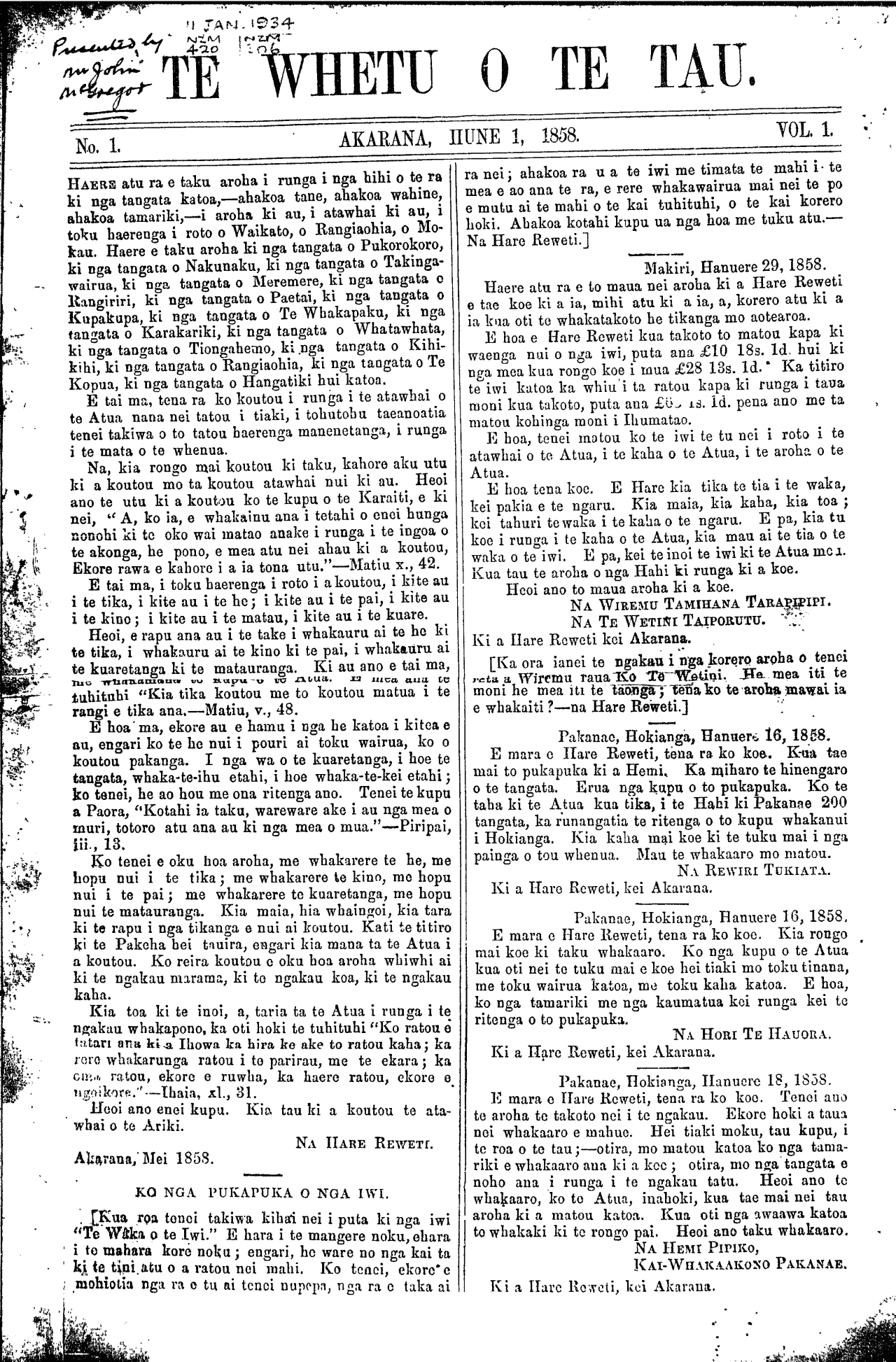 TE WHETU O TE TAU. No. 1. AKARANA, HUNE 1, 1858. VOL. 1. HAERE atu ra e taku aroha i runga i nga hihi o te ra ki nga tangata katoa,—ahakoa tane, ahakoa wahine, ahakoa tamariki,—i aroha ki au, i atawhai ki au, i toku haerenga i roto o Waikato, o Rangiaohia, o Mo- kau. Haere e taku aroha ki nga tangata o Pukorokoro, ki nga tangata o Nakunaku, ki nga tangata o Takinga- wairua, ki nga tangata o Meremere, ki nga tangata o Rangiriri, ki nga tangata o Paetai, ki nga tangata o Kupakupa, ki nga tangata o Te Whakapaku, ki nga tangata o Karakariki, ki nga tangata o Whatawhata, ki nga tangata o Tiongahemo ki nga tangata o Kihi- kihi, ki nga tangata o Rangiaohia ki nga tangata o Te Kopua, ki nga tangata o Hangatiki hui katoa. E tai ma, tena ra ko koutou i runga i te atawhai o te Atua nana nei tatou i tiaki, i tohutohu taeanoatia tenei takiwa o to tatou haerenga manenetanga, i runga i te mata o te whenua. Na, kia rongo mai koutou ki taku, kahore aku utu ki a koutou mo ta koutou atawhai nui ki au. Heoi ano te utu ki a koutou ko te kupu o te Karaiti, e ki nei, " A, ko ia, e whakainu ana i tetahi o enei hunga nonohi ki to oko wai matao anake i runga i te ingoa o te akonga, he pono, e mea atu nei ahau ki a koutou, Kore rawa e kahore i a ia tona utu."—Matiu x 42. E tai ma, i toka haerenga i roto i a koutou, i kite au i te tika, i kite au i te he; i kite au i te pai, i kite au i te kino; i kite au i te matau, i kite au i te kuare. Heoi, e rapu ana au i te take 1 whakauru ai te he ki te tika, i whakauru ai te kino ki te pai, i whakauru ai te kuaretanga ki te matauranga. Ki au ano e tai ma, tuhituhi "Kia tika koutou me to koutou matua i te rangi e tika ana.—Matiu, v 48. E hoa ma, ekore au e hamu i nga he katoa i kitea e au, engari ko te he nui i pouri ai toku wairua, ko o koutou pakanga. I nga wa o te kuaretanga, i hoe te tangata, whaka-te-ihu etahi, i hoe whaka-te-kei etahi; ko tenei, he ao hou me ona ritenga ano. Tenei te kupu a Paora, "Kotahi ia taku, wareware ake i au nga mea o muri, totoro atu ana au ki nga mea o mua."—Piripai iiii 13. ^ ' Ko tenei e oku hoa aroha, me whakarere te he, me hopu nui i te tika; me whakarere te kino, mo hopu nui i te pai; me whakarere te kuaretanga, me hopu nui te matauranga. Kia maia, hia whaingoi, kia tara ki te rapu i nga tikanga e nui ai koutou. Kati te titiro ki te Pakeha hei tauira, engari kia mana ta te Atua i a koutou. Ko reira koutou e oku hoa aroha whiwhi ai ki te ngakau marama, ki to ngakau koa, ki te ngakau kaha. " Kia toa ki te inoi, a, taria ta te Atua 1 runga i te ngakau whakapono, ka oti hoki te tuhituhi "Ko ratou e tatari ana kia Ihowa ka hira ke ake to ratou kaha; ka rere whakarunga ratou i to parirau, me te ehara ; ka oma ratou, ekore e ruwha, ka haere ratou, ekore e ngaikore Ihaia, xi., 31. Heoi ano enei kupu. Kia tau ki a koutou te ata- whai o te Ariki. Akarana,' Mei 1858. NA HARE REWETI. KO NGA PUKAPUKA O NGA IWI. Kua roa tenei takiwa kihai nei i puta ki nga iwi "Te Waka o te Iwi." E hara i te mangere noku, ehara i to mahara kore noku; engari, he ware no nga kai ta ki te tini o a ratou nei mahi. Ko tenei, ekore-e mohiotia nga ra e tu ai tenei nupepa nga ra take ai ra nei; ahakoa ra u a te iwi me timata te mahi i te mea e ao ana te ra, e rere whakawairua mai nei te po e mutu ai te mahi o te kai tuhituhi, o te kai korero hoki. Ahakoa kotahi kupu ua nga hoa me tuku atu.— Na Hare Reweti.] Makiri, Hanuere 29, 1858. Haere atu ra e to maua nei aroha ki a Hare Reweti e tae koe ki a ia, mihi atu ki a ia, a, korero atu ki a ia kua oti to whakatakoto he tikanga mo aotearoa. E hoa e Hare Reweti kua takoto to matou kapa ki waenga nui o nga iwi, puta ana £10 18s. U hui ki nga mea kua rongo koe i mua £28 13s.1d. Ka titiro te iwi katoa ka whiu i ta ratou kapa ki runga i taua moni kua takoto, puta ana £80 1s 1d pena ano me ta matou kohinga moni i Ihumatao E hoa, tenei matou ko te iwi te tu nei i roto i ta atawhai o to Atua, i te kaha o to Atua, i te aroha, o te Atua. E hoa tena koe. E Hare kia tika te tia i te waka, kei pakia e te ngaru. Kia maia, kia kaha, kia toa; koi tahuri te waka i te kaha o te ngaru. E pa, kia tu koe i runga i te kaha o te Atua, kia mau ai te tia o te waka o te iwi. E pa, kei te inoi te iwi ki te Atua mea. Kua tau te aroha o nga Hahi ki runga ki a koe. Heoi ano to maua aroha ki a koe. NA WIREMU TAMIHANA TARAPIPIPI. NA TE WETINI TAIPORUTU. Ki a Hare Reweti kei Akarana. [Ka ora ianei te ngakau i nga korero aroha o tenei reta a Wiremu raua ko Te Wetini. He mea iti te moni he mea iti te taonga tena ko te aroha mawai ia e whakaiti? na Hare Reweti.] Pakanae Hokianga, Hanuere 16, 1858. E mara e Hare Reweti, tena ra ko koa. KUA tae mai to pukapuka ki a Hemi. Ka miharo te hinengaro o te tangata, Erua nga kupu o to pukapuka. Ko te taha ki te Atua kua tika, i te Hahi ki Pakanae 200 tangata, ka runangatia te ritenga o to kupu whakanui i Hokianga. Kia kaha mai koe ki te tuku mai i nga painga o tou whenua. Mau te whakaaro mo matou." NA RAWIRI TUKIATA. Ki a Haro Reweti, kei Akarana. Pakanae, Hokianga, Hanuere 16, 1858. E mara e Hare Reweti, tena ra ko koe. Kia rongo mai koe ki taku whakaaro. Ko nga kupu o te Atua kua oti nei te tuku mai e koe hei tiaki mo toku tinana, me toku wairua katoa, me toku kaha katoa. E hoa, ko nga tamariki me nga kaumatua koi runga kei te ritenga o to pukapuka. NA HORI TE HAUORA. Ki a Hare Reweti, kei Akarana. Pakanae, Hokianga, Hanuere 18, 1858. E mara o Hare Reweti, tena ra ko koe. Tene; ano to aroha to takoto nei i te ngakau, Kore hoki a taua noi whakaaro e mahue. Hei tiaki moku, tau kupu, i te roa o te tau;—otira, mo matou katoa ko nga tama- riki e whakaaro aua ki a koe; otira, mo nga tangata e noho ana i runga i te ngakau tatu. Heoi ano te whakaaro, ko to Atua, inahoki, kua tae mai nei tau aroha ki a matou katoa. Kua oti nga awaawa katoa to whakaki ki te rongo pai. Heoi ano taku whakaaro. NA HEMI PIPIKO, KAIWHAKAAKONO PAKANAE Ki a Hare Reweti, kei Akarana.